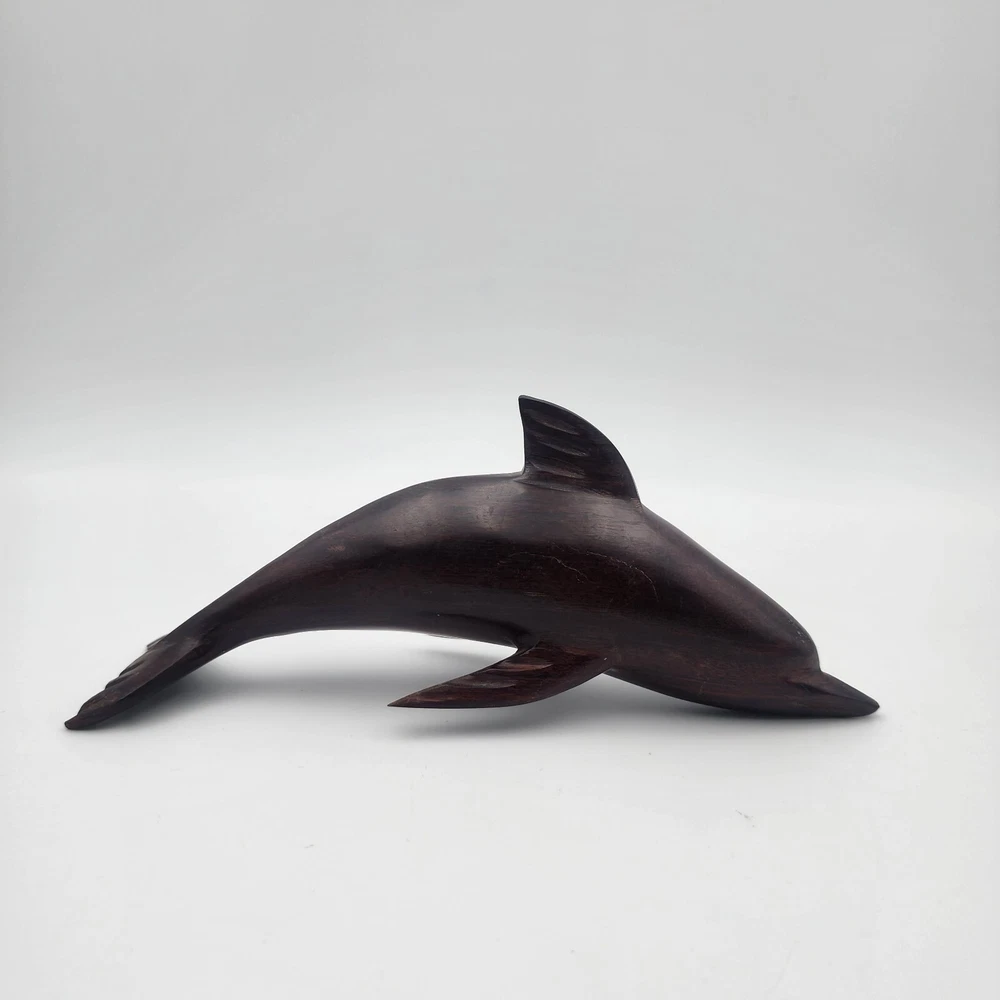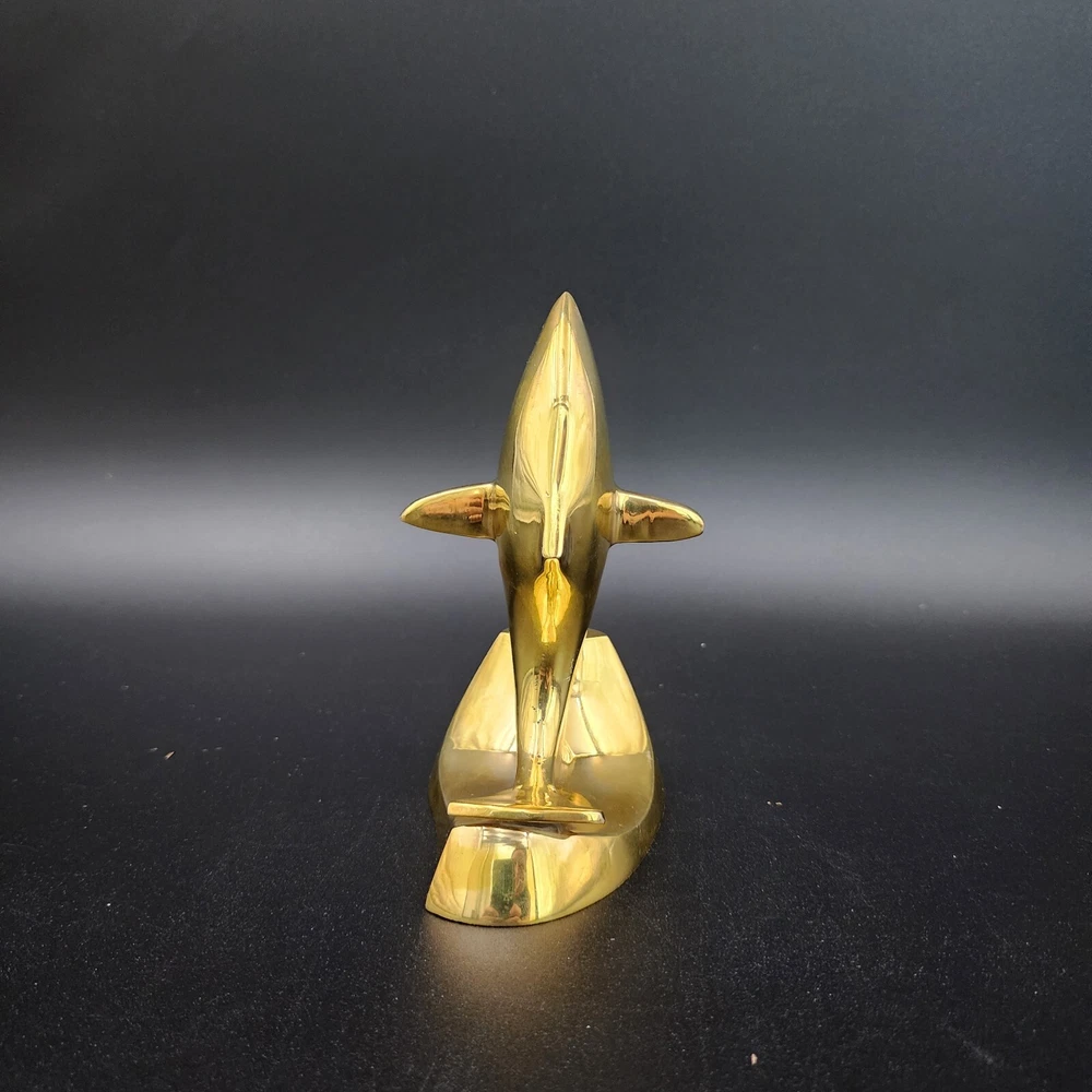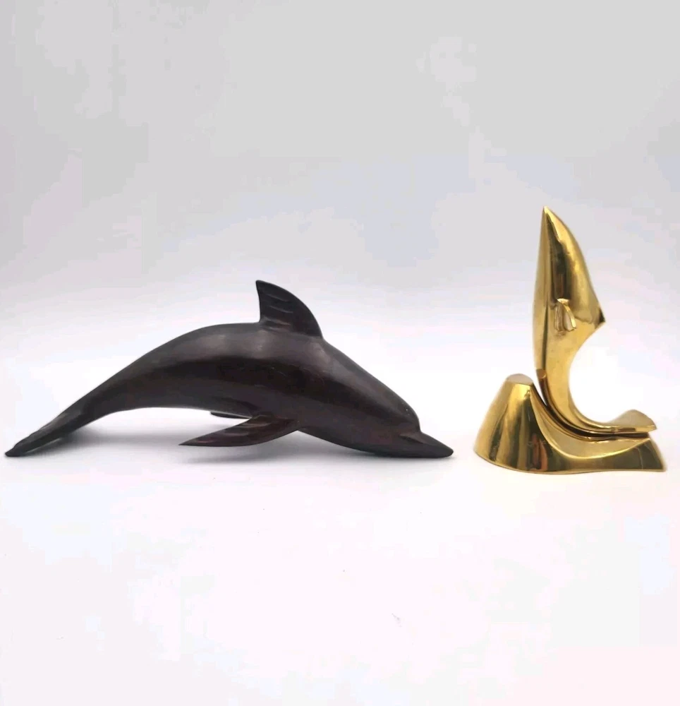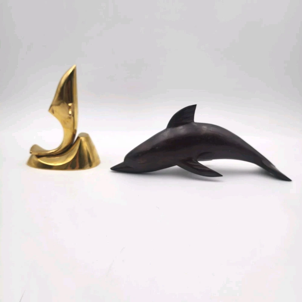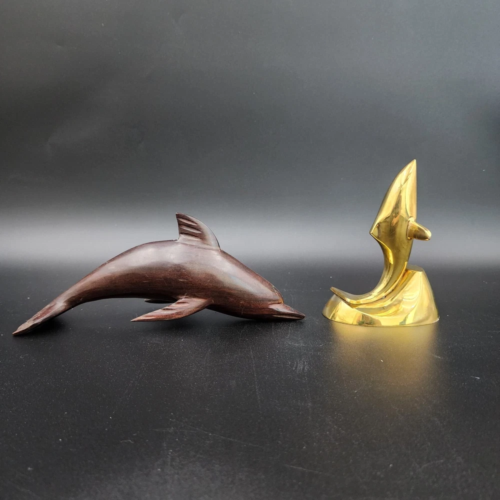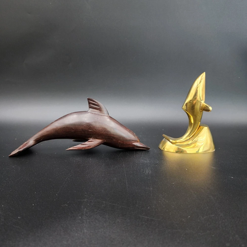 Brass dolphin weighs 14 oz, measures 2"x4"x5"H Wood dolphin weighs 1.8 lb, measures 9"Lx3.5"D