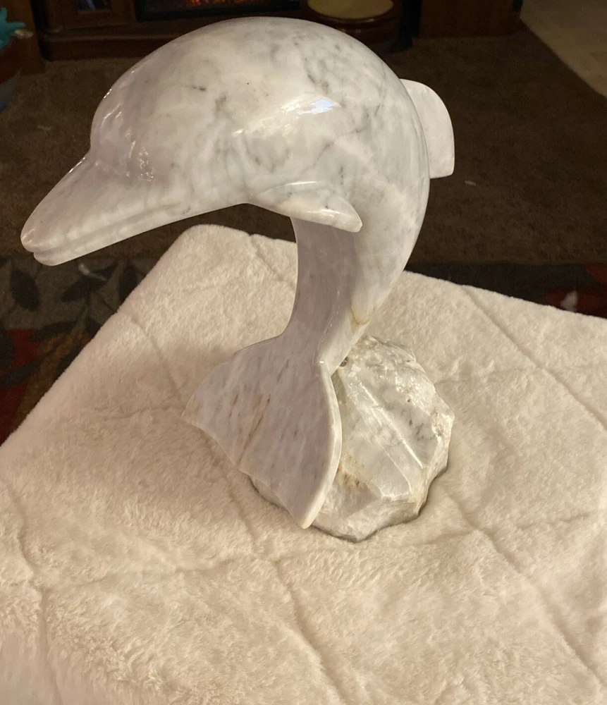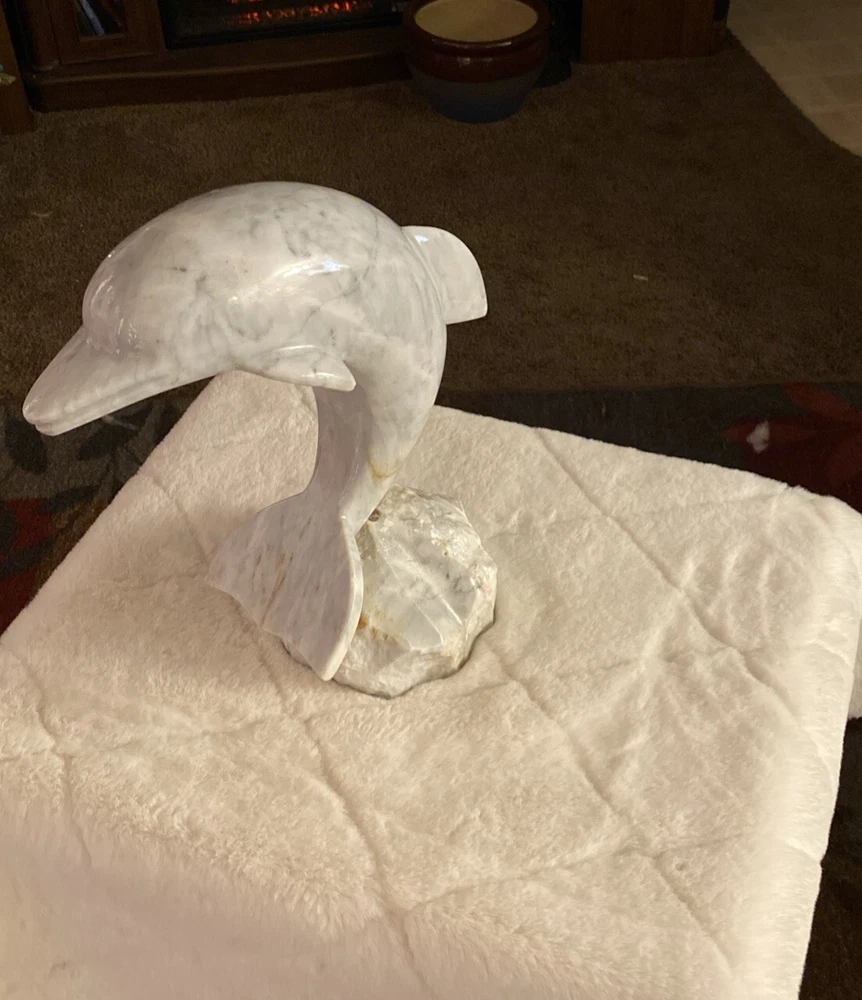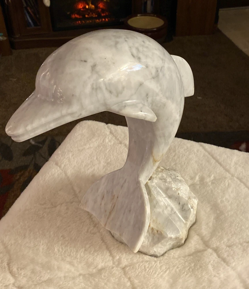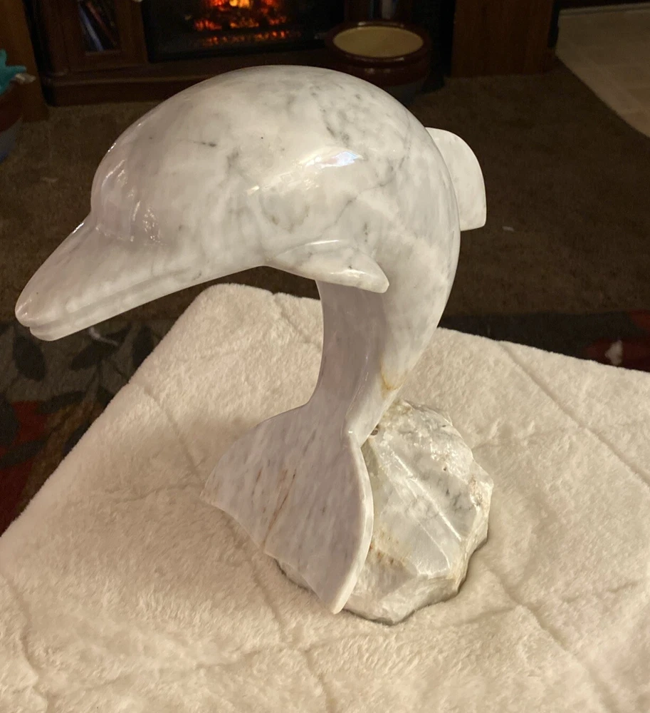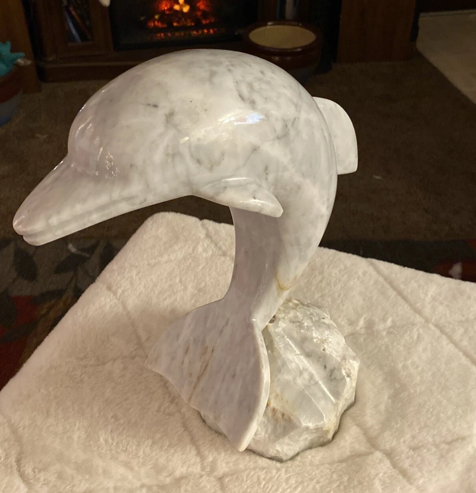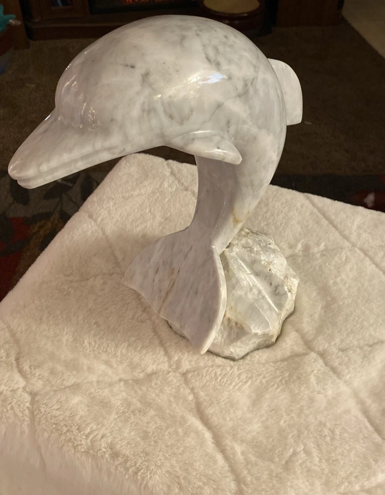 This exquisite sculpture of a dolphin standing on a solid marble base is a must-have for collectors of marine life figurines. The intricate details of the dolphin's body and the elegant marble stand make this a beautiful addition to any collection. Crafted with the highest quality materials, this figurine is a stunning representation of the animal class dolphin. It weighs 25.1lbs and stands at 13.5 inches tall. Perfect for display in any room of your home, this sculpture is sure to be a conversation starter.