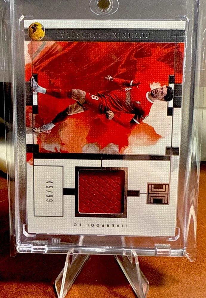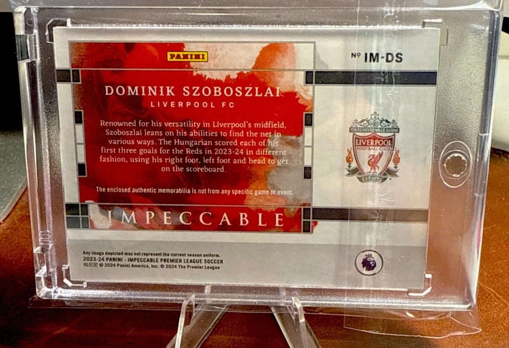 This is a 2023-24 Panini Impeccable EPL Soccer trading card featuring Dominik Szoboszlai of Liverpool. The card is a Patch parallel, serial numbered out of 99, with memorabilia included. It is made of card stock and is part of the Premier League set for the 2023-24 season. Szoboszlai's autograph is not included on this card.