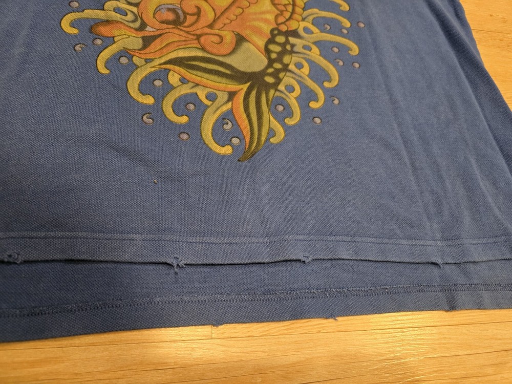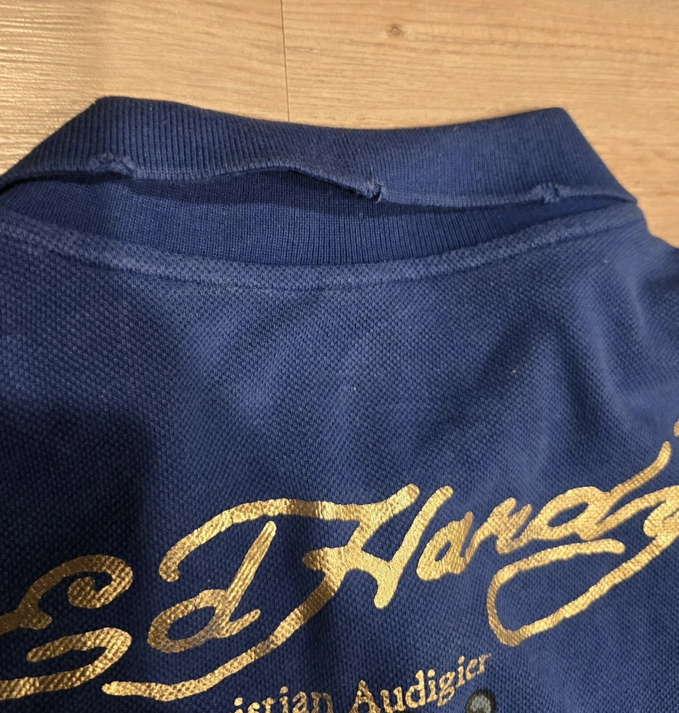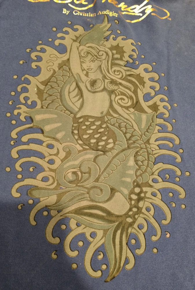 Don Ed Hardy Christian Audigier Men's XXL Blue Polo Shirt 3 Button Collar ... Used condition... Has a weathered look with edges cut out to look worn. That is how it came. See photos This is a men's 2XL blue polo shirt by Don Ed Hardy, featuring a graphic print with rhinestones of a mermaid, along with the brand's signature themes of love and skulls. The shirt has short sleeves, a collared neckline with a cutaway style, and a pullover closure. Made of 100% cotton knit fabric with a dark wash, this regular fit polo also includes rhinestone accents and is part of the Don Ed Hardy product line. * I will combine & discount shipping & handling rates for multiple items won… I will charge the lowest possible shipping Rate!!!! * This is a must have for anyone. Smoke free home. Low opening bid and no reserve. * Please take time to look at each picture. I try to describe the items in words as well as I can but pictures can often show things I cannot describe. For this reason, I consider my pictures to be part of my item description. If you have any questions, please feel free to contact me so that I can address any issue prior to a purchase. * International & Overseas welcome. * Please check out my other auctions and bid with confidence. * Please make payments within three days of winning bid. * Shipping is Same Day or Within 1 Business day of payment received. (Business Days are Monday thru Friday excluding Holidays) * If You Have Questions, Feel Free To Ask, And I Will Answer Them To The Best I Can! Please Don’t Wait Until The Last Minute Of The Auction