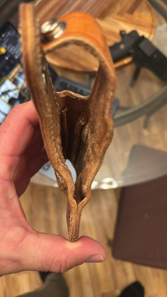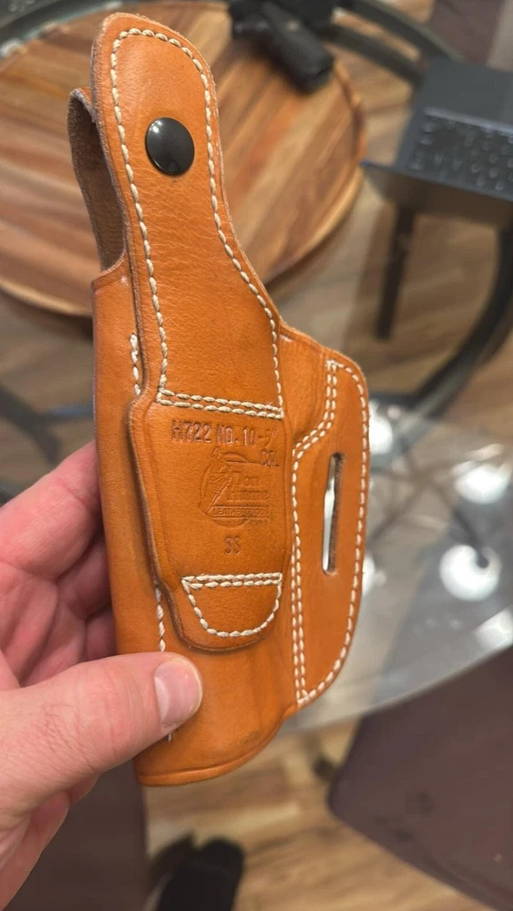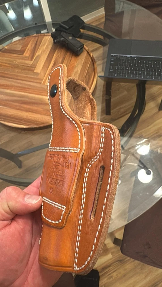 The Don Hume Vintage H722 No.10-5 Brown Leather OWB Holster is designed for right-handed shooters looking for a concealment holster for their 5-inch 1911 pistol. Made by Don Hume Leathergoods, this brown leather holster is specifically crafted for Colt, Wilson Combat, and other 1911 models. It features a Level 1 retention system and is designed to be worn on the belt for easy access during concealed carry activities. The vintage design adds a classic touch to the functionality of securely carrying your pistol. I'm not sure why the lighting in the first photo made the holster look so dark but the lighter photos are a more accurate representation. This holster is a vintage Don Hume from better times. it's been babied, oiled, and it looks like it's had very little use/handling. It fits a 5-inch full size 1911. Shipping is freek buy with confidence