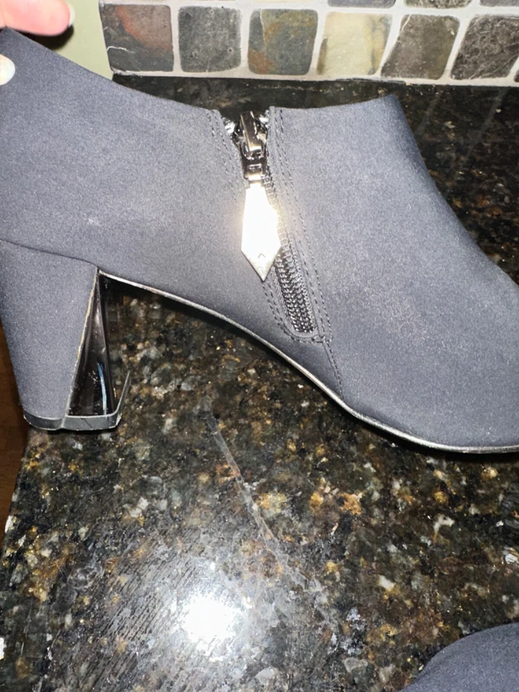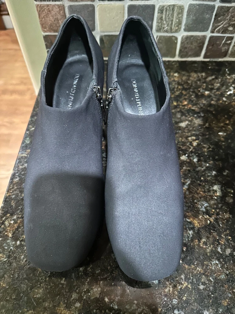 This listing is for a great Donald J. Pliner black stretch crepe booties with mirrored heels. Very good used condition--see close up photos for condition. Smoke free home. Shipping: Buyers to pay shipping cost per calculator below. Additional clothing items are $1 additional per item. Outside U.S. please contact for shipping rates. Make sure to add us to your favorites as new items are added daily.