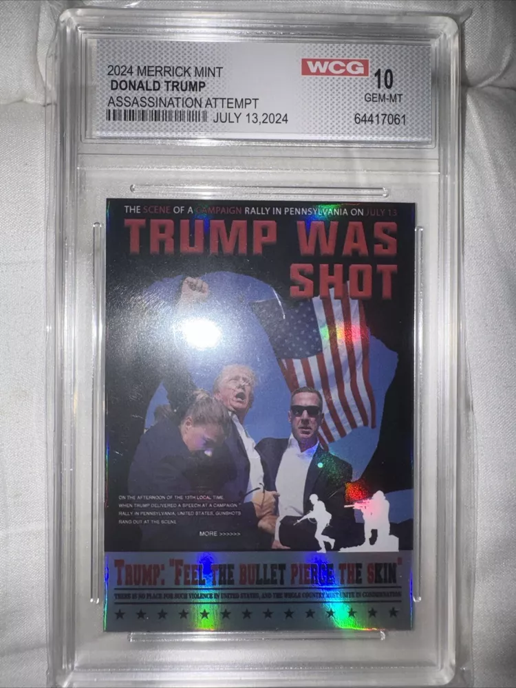 This Donald Trump 2024 Assassination Attempt Trading Card is a must-have for any collector. Graded GEM-MINT 10, this original card stock is of the highest quality and features the iconic former president in a thrilling action-packed design. With a card thickness of 35 Pt., this non-sport trading card is perfect for fans of superhero, action, adventure, crime, war, comedy, mystery, political, history, and military genres. The card is in standard size and is suitable for ages 8 and up. It is an original licensed reprint and was manufactured in the United States. The card features the assassination attempt on Donald Trump and is a perfect addition to any collection.
