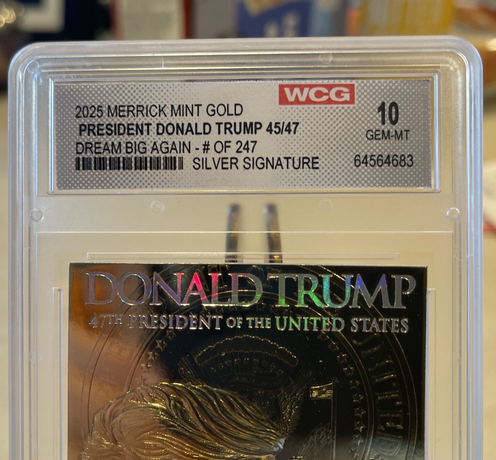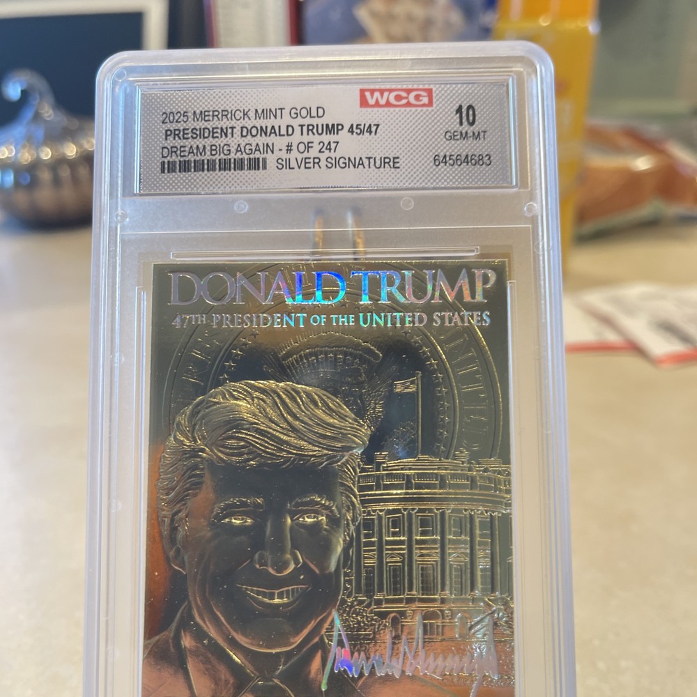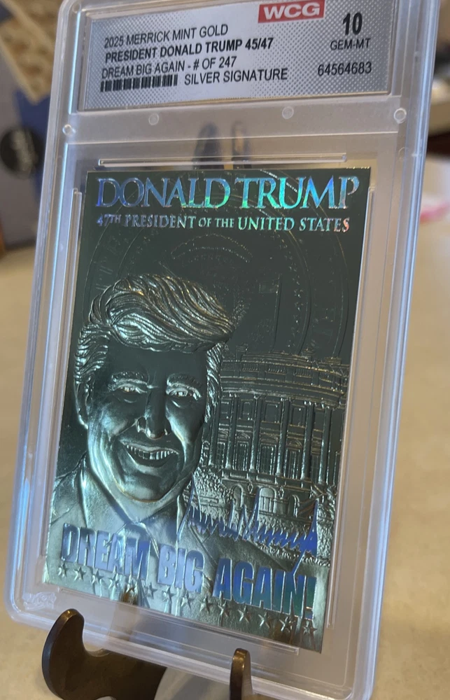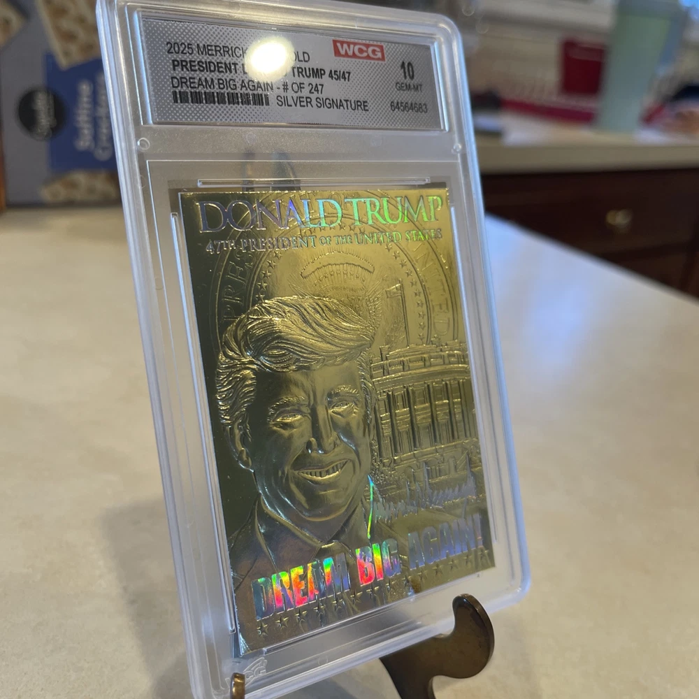 100% Authentic! All of my Trump collectibles are Original Collectibles from Donald Trump’s official site.Donald Trump "DREAM BIG AGAIN" Gold Numbered Trading Card 154/247 features a hologram and is graded Gem Mint 10. This non-sport trading card is part of the Donald Trump Election Victory set, manufactured by Merrick Mint in 2025. The card showcases a Silver Signature parallel with a normal graded size, and it is an original licensed reprint. It is a part of the US Presidents franchise, focusing on the featured person, Donald Trump.