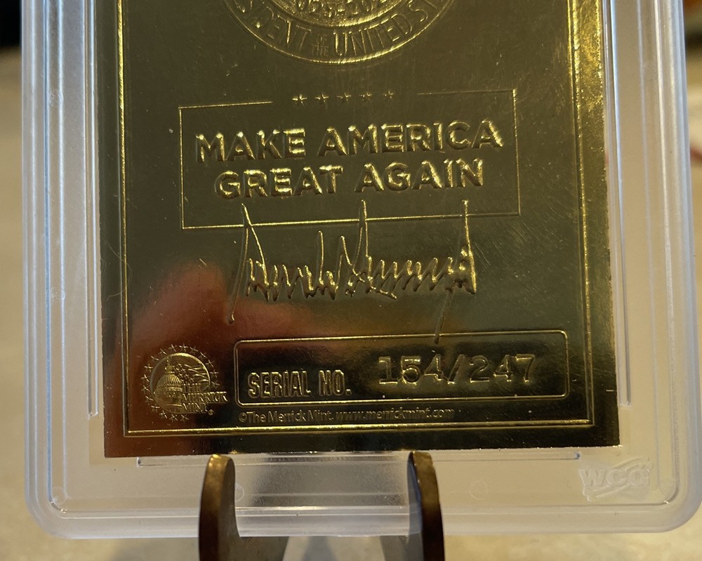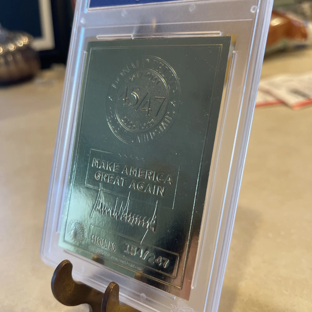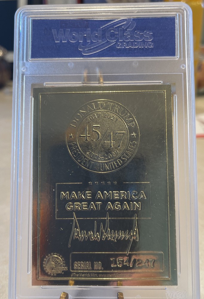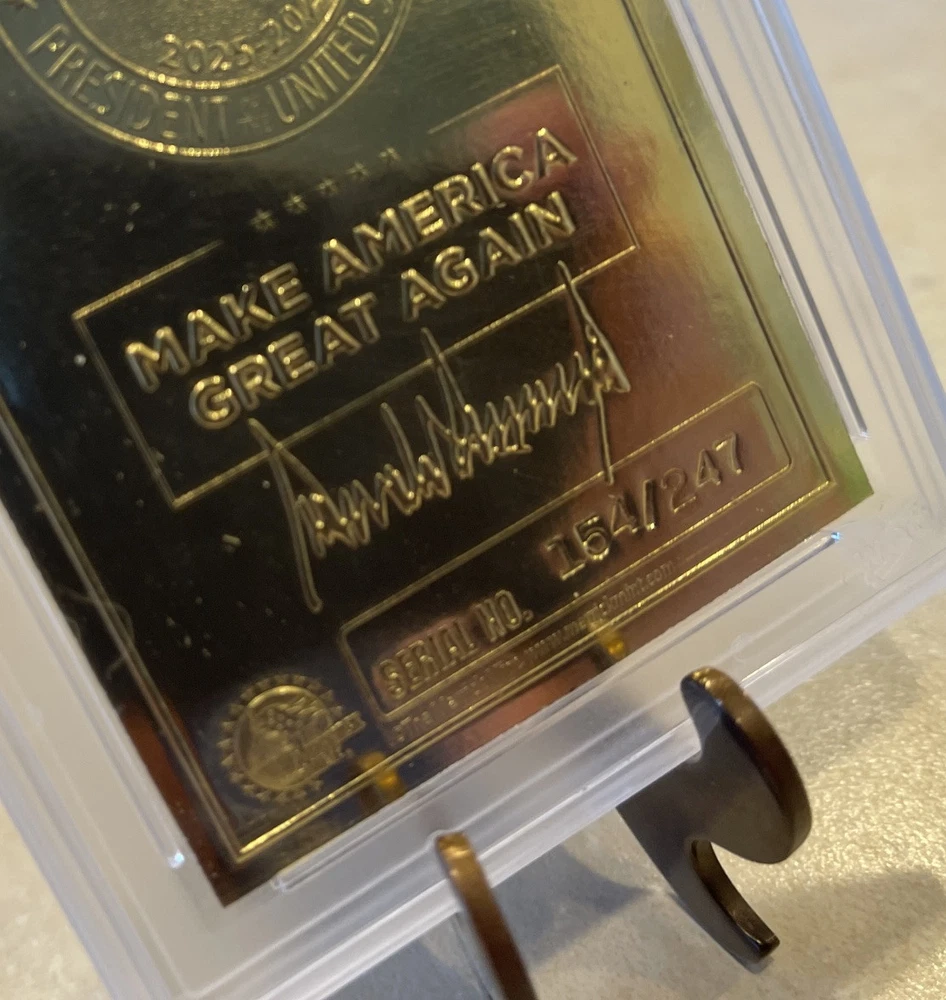 100% Authentic! All of my Trump collectibles are Original Collectibles from Donald Trump’s official site.Donald Trump "DREAM BIG AGAIN" Gold Numbered Trading Card 154/247 features a hologram and is graded Gem Mint 10. This non-sport trading card is part of the Donald Trump Election Victory set, manufactured by Merrick Mint in 2025. The card showcases a Silver Signature parallel with a normal graded size, and it is an original licensed reprint. It is a part of the US Presidents franchise, focusing on the featured person, Donald Trump.