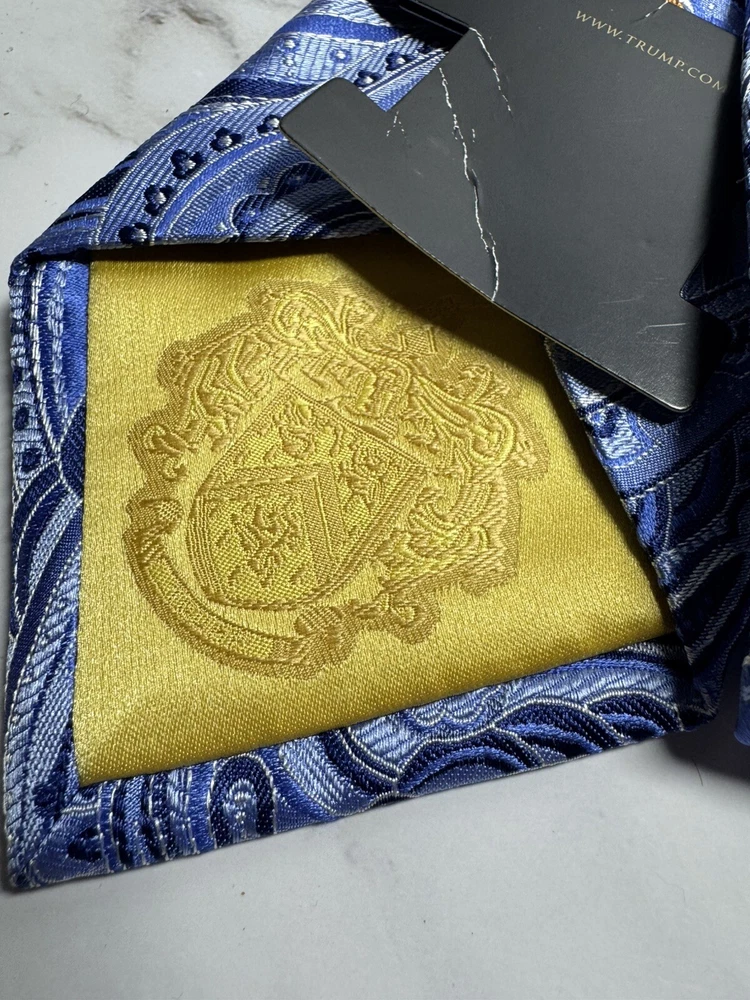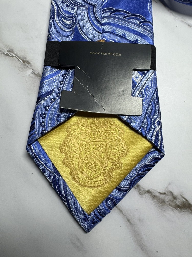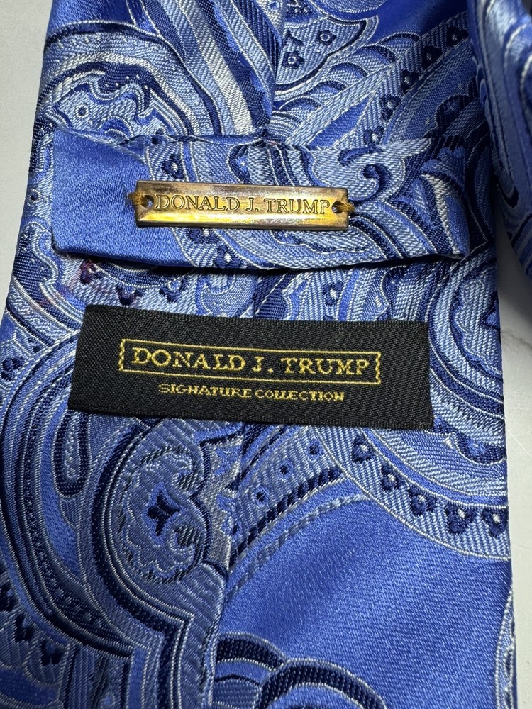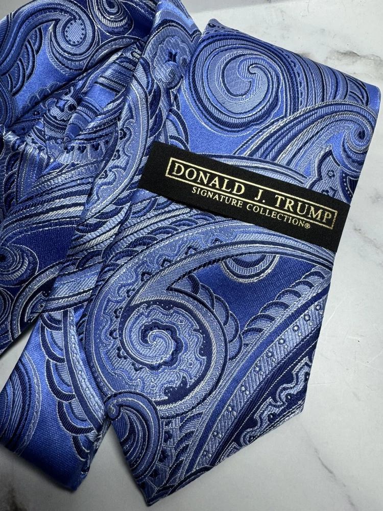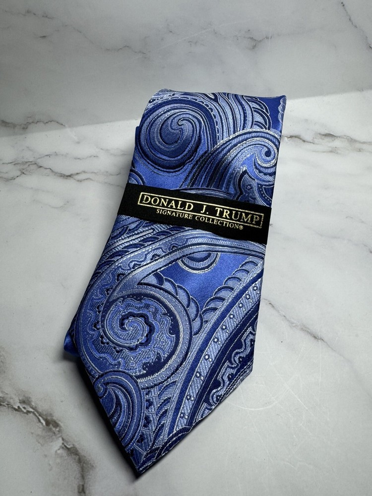 Vintage:NoCharacter:SilverAccents:Logo, Medallion, BuckleFeatures:AdjustableHandmade:NoItem Length:Long (More Than 60")Color:SilverMaterial:SilkPattern:PaisleyBrand:Donald J. TrumpStyle:PointedCountry/Region of Manufacture:ChinaDepartment:MenType:TieTheme:American, Donald TrumpItem Width:ClassicFabric Type:Silk