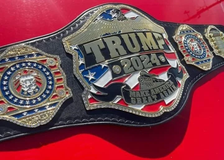 Donald Trump USA Presidential Election 2024 Championship Belt Features: 1. Brass metal plates 2. Real cowhide floppy leather strape in black colour 3. Gold plating 4. Golden tip on the end 5. Plates thickness 2mm Show your support for Donald Trump in the 2024 Presidential Election with this stylish Championship Belt. The belt is perfect for wrestling fans and collectors alike, and features the iconic "Make America Great Again" slogan. The belt is made in Pakistan and is 52 inches in size, with a sleek black color that will complement any outfit. This belt is a must-have for any fan of Donald Trump or wrestling, and is perfect for wearing to rallies or displaying in your collection. Don't miss out on the chance to own this unique and stylish belt that will showcase your support for one of the most iconic figures in American history.