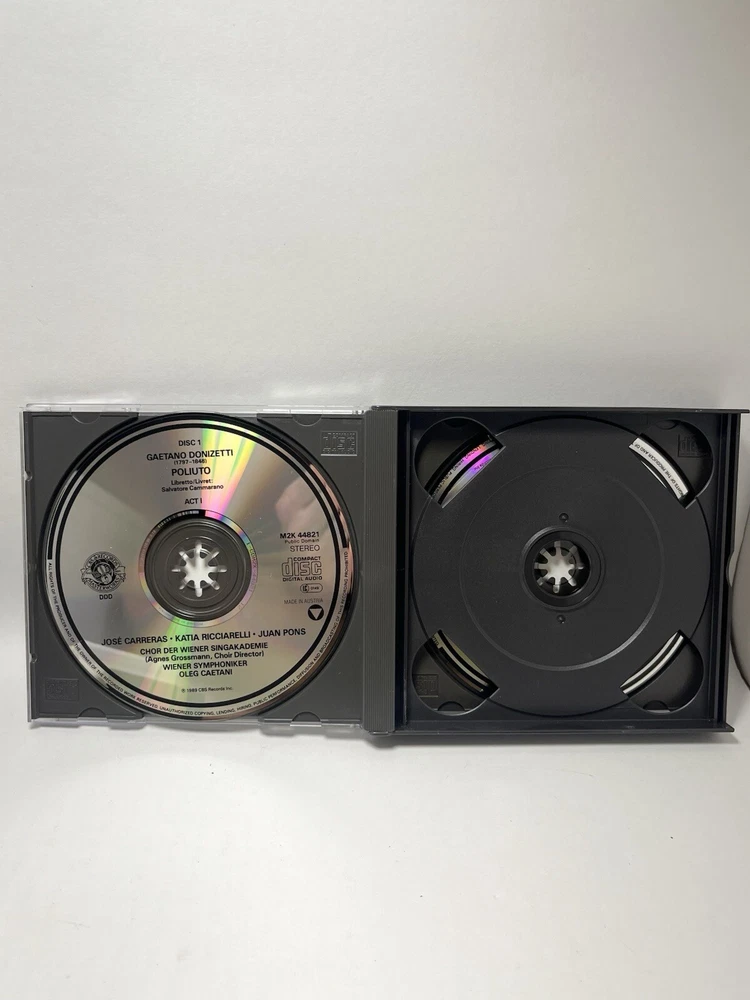 This is a listing for a Donizetti Poliuto Jose Carreras Katina Ricciarelli Juan Pons Oleg Caetani 2CD Set CBS. PLEASE SEE PHOTOS FOR THE PRODUCT YOU WILL RECEIVE! MORE PHOTOS ARE AVAILABLE UPON REQUEST! This set is in very good used condition. Overall, it has minimal signs of wear. The set includes the original box, inlay, and discs. The box has some small wear to the edges. The jewel case may have a few scratches and scuff marks to it, but the discs are in excellent used condition with no signs of any scratches. The inlay has no major signs of wear to it. PLEASE REACH OUT IF YOU HAVE ANY QUESTIONS OR OFFERS! If an item is purchased on business days between the hours of 12AM-10PM, the item will be in the mail shipped the following day.