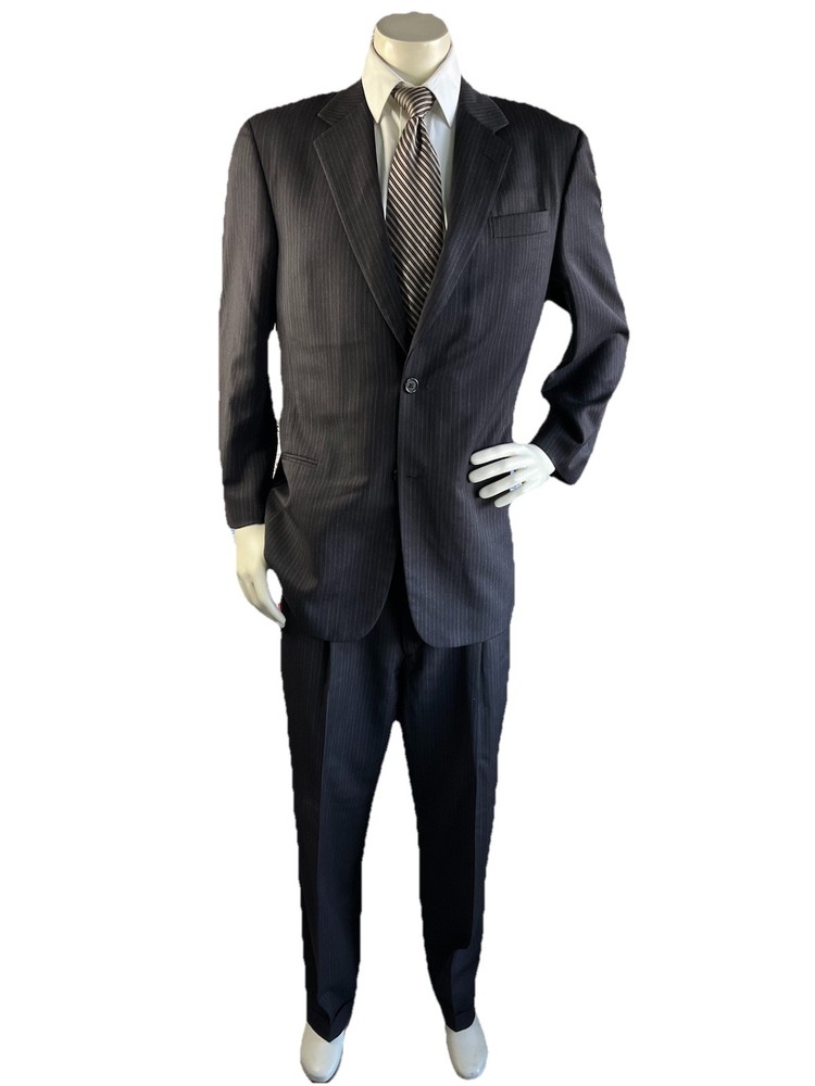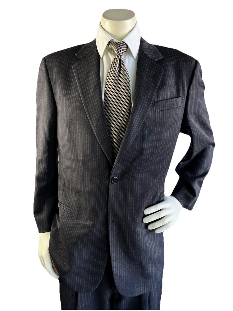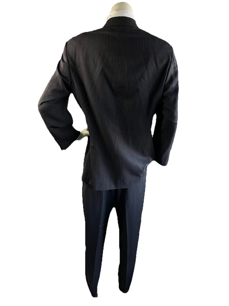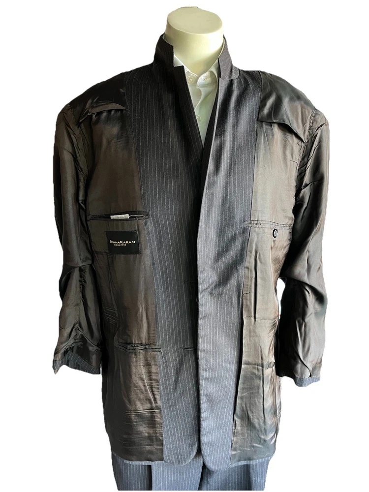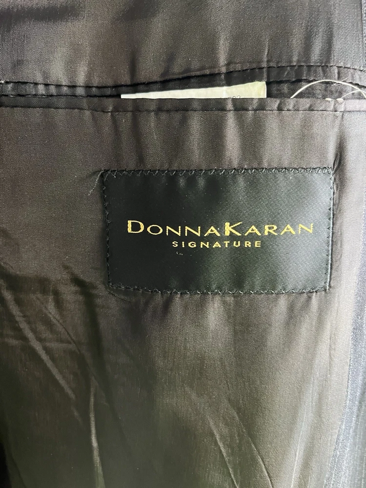 Front Type: Pleated Jacket Vent Style: Ventless Color: Black Jacket/Coat Length: Regular Number of Pieces: 2 Piece Jacket Cut: Single Breasted Style: 2 Pieces Material: Wool Waist Size: 34 in Chest Size: 42 Theme: Mens; Suit; Suit Seperate; Suit Jacket; Blazer; Sport Coat; Old M Brand: Donna Karan Jacket Front Button Style: Three-Button Type: Suit Vintage: No Country/Region of Manufacture: Italy Pattern: Stripe Fit: Classic Jacket Lapel Style: Notch Size Type: Regular Size: 42 Department: Men Inseam: 29 in