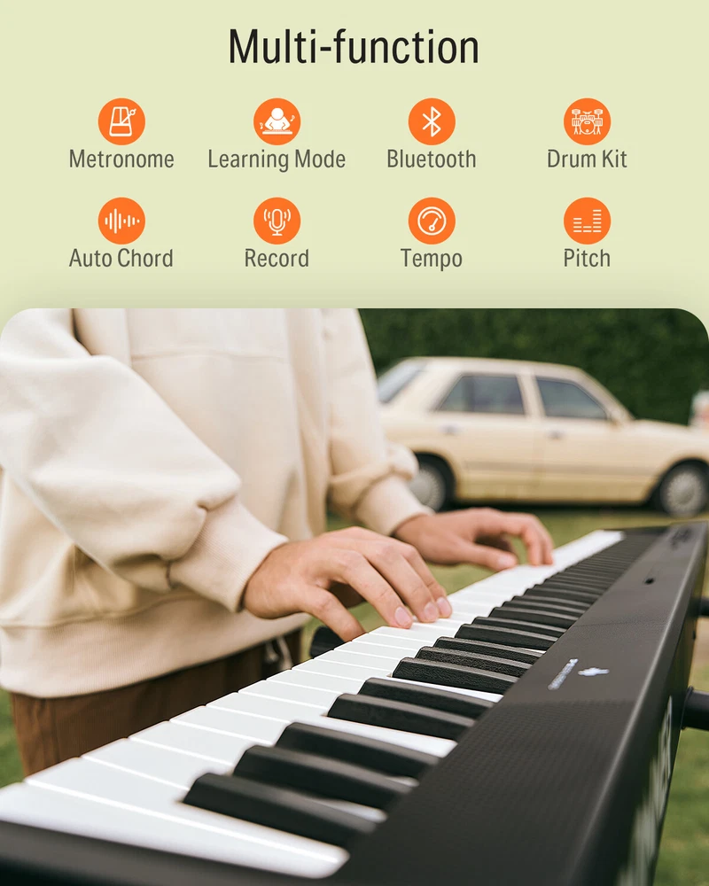 Q&A Q: How long does it usually take to recharge? ▼ Q: How long does it usually take to recharge? ▼ Charging time is about 4H, please charge it more than 6H for the first time. The charging indicator is red and turms green when it is full. Please note that the EP-10 is not applicable to PD fast charging line. Q: What should you do if you find that the digital piano won't turn on? ▼ Q: What should you do if you find that the digital piano won't turn on? ▼ First of all, please check that the digital piano is charged, if it can't turn on after charging please contact Eastar for assistance. Q: Will it work with a phone and app like yousician piano? ▼ Q: Will it work with a phone and app like yousician piano? ▼ Yes, the product has Bluetooth MIDI function, which can be connected to a mobile phone and used together with an APP. 【 Ultra-Portable Design 】The DP-10 folding piano weighs only 8 pounds, so you can move it easily. At only 24.8 inches folded up, this piano is lightweight and portable, so it folds up for air travel, fits in the trunk, and is very convenient for everyday storage at home . You can take it anywhere you want at any time. 【 88 Key Full Size Semi Weighted Keyboard 】The digital piano with 88 standard size keys, providing you with a piano-like finger touch and key depth. The foldable piano also features intelligent strength sensing, with different strengths presenting different volumes, perfectly and truly reflecting the player's feelings. 【 Multi-Functional Electric Keyboard 】The portable piano has a clear LCD display, 128 tones and rhythms, and 21 demonstration tracks. It also includes dual keyboards, metronome, transpose, auto chord, intensity switch, sustain, tremolo, keyboard drums and other functions. It can perfectly meet the usual practice needs of beginners. 【 Multiple External Connections 】You can select the Bluetooth name of this piano in the MIDI setting interface of the external device or software compatible with this electronic piano to complete the connection. So that the beginner can learning piano by the teaching APP. You can connect many devices(Headphones, Pedal, Audio Devices, Computers, etc) to obtain a better training experience through various sockets(Headphone, AUX OUT, USB-MIDI) 【 Great for All Levels 】This digital piano is made of premium abs ensures reliable structure for prolonged use. Equipped with a perfect learning keyboard for teaching functions, it is suitable for adults, children, beginners and users of all levels. Q&A Q: How long does it usually take to recharge? ▼ Q: How long does it usually take to recharge? ▼ Charging time is about 4H, please charge it more than 6H for the first time. The charging indicator is red and turms green when it is full. Please note that the EP-10 is not applicable to PD fast charging line. Q: What should you do if you find that the digital piano won't turn on? ▼ Q: What should you do if you find that the digital piano won't turn on? ▼ First of all, please check that the digital piano is charged, if it can't turn on after charging please contact Eastar for assistance. Q: Will it work with a phone and app like yousician piano? ▼ Q: Will it work with a phone and app like yousician piano? ▼ Yes, the product has Bluetooth MIDI function, which can be connected to a mobile phone and used together with an APP. 【 Ultra-Portable Design 】The DP-10 folding piano weighs only 8 pounds, so you can move it easily. At only 24.8 inches folded up, this piano is lightweight and portable, so it folds up for air travel, fits in the trunk, and is very convenient for everyday storage at home . You can take it anywhere you want at any time. 【 88 Key Full Size Semi Weighted Keyboard 】The digital piano with 88 standard size keys, providing you with a piano-like finger touch and key depth. The foldable piano also features intelligent strength sensing, with different strengths presenting different volumes, perfectly and truly reflecting the player's feelings. 【 Multi-Functional Electric Keyboard 】The portable piano has a clear LCD display, 128 tones and rhythms, and 21 demonstration tracks. It also includes dual keyboards, metronome, transpose, auto chord, intensity switch, sustain, tremolo, keyboard drums and other functions. It can perfectly meet the usual practice needs of beginners. 【 Multiple External Connections 】You can select the Bluetooth name of this piano in the MIDI setting interface of the external device or software compatible with this electronic piano to complete the connection. So that the beginner can learning piano by the teaching APP. You can connect many devices(Headphones, Pedal, Audio Devices, Computers, etc) to obtain a better training experience through various sockets(Headphone, AUX OUT, USB-MIDI) 【 Great for All Levels 】This digital piano is made of premium abs ensures reliable structure for prolonged use. Equipped with a perfect learning keyboard for teaching functions, it is suitable for adults, children, beginners and users of all levels. On Oct 28, 2024 at 01:11:29 PDT, seller added the following information: