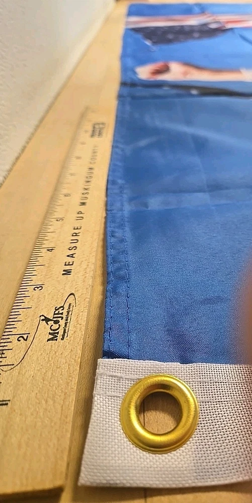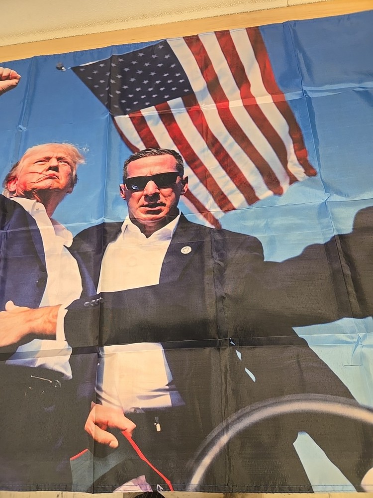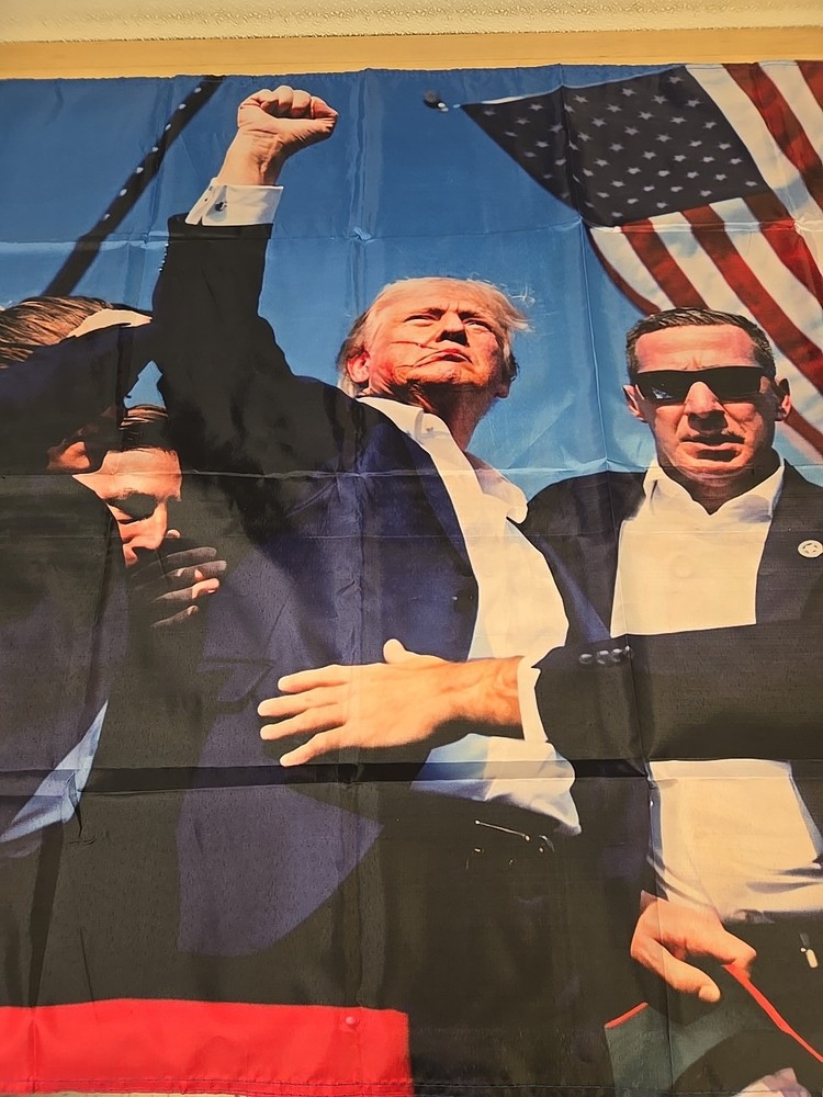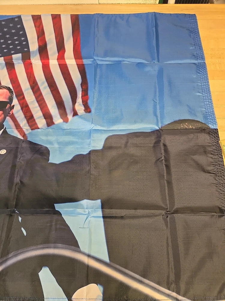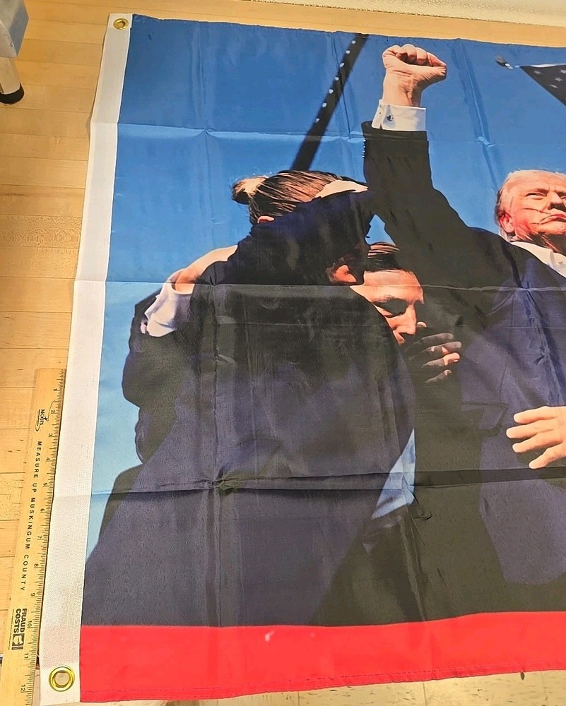 The product is a 3ft × 5ft American USA patriot hero flag featuring the likeness of Donold Trump. The flag is double-sided and has a patriotic theme, perfect for any occasion. Made in the United States, the multicolor flag showcases the day that President Trump was almost assassinated by being shot in the ear and afterwards standing strong by showing a fist to the crowd. The picture of President Trump on that day represents honor & American pride and values. The bag has been open but the flag has never been used.