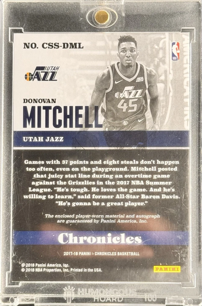It is a 2018 Panini Chronicles trading card featuring Donovan Mitchell of the Utah Jazz. This autographed card is a game-worn Rookie Patch Autograph (RPA) with memorabilia, serial numbered out of 99, in a Blue parallel variety. The card number is CSS-DML and it belongs to the National Basketball Association (NBA). GAME WORN RPA. CARD SHIPS IN MAG.