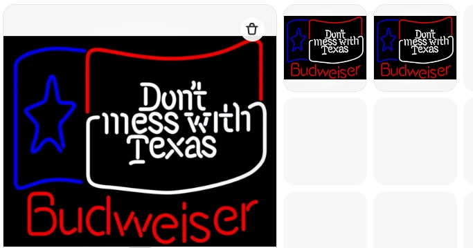 "D on't Mess with Texas" Budweiser---- NEON Sign Dimensions: approx 10" x 16" x 2" Product Features: Striking neon-style design with "Don't Mess with Texas" text over iconic Budweiser logo Equipped with adjustable dimmer control for customizable brightness (10%-100% range) Inline power switch provides easy access to on/off and dimming functions Flexible silicone LED tubing creates a vibrant, authentic neon-like glow Clear acrylic backing provides sturdy support and clean appearance Pre-drilled mounting holes with included hanging chain Lightweight construction (under 2 pounds) Technical Specifications: Power Source: Standard USB connection Operating Voltage: 5V DC (safe, low-voltage operation) Construction: Durable silicone LED strips on acrylic backing Lighting: Bright, energy-efficient LED technology Temperature: Cool-running design Easy plug-and-play installation Package Includes: LED Neon-Style Sign (12" x 18" x 2") USB Power Cord with Dimming Controller Mounting Chain Set Basic mounting hardware Key Benefits: Safe Operation: No glass, low voltage, minimal heat Energy Efficient: Low power consumption Durable Design: Impact-resistant materials Simple Setup: Just plug into any USB port Adjustable Light Output: Control brightness to suit your space Silent Operation: No buzzing or noise Basic Care: Dust with soft, dry cloth as needed Keep USB connection secure Avoid exposure to excessive moisture Sold as-is, all functions working including adjustabl e dimmer