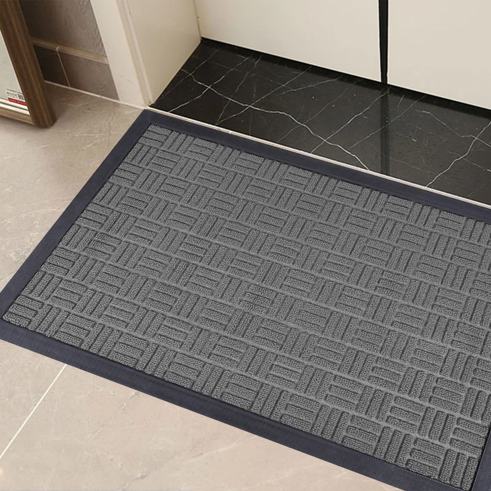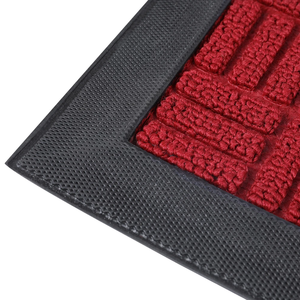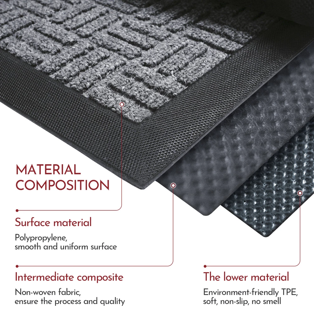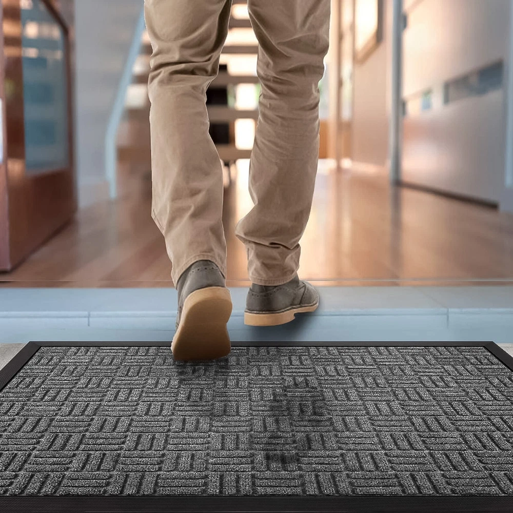 Door Floor Mat Heavy Duty Entryway Mats for Indoor Outdoor Rug + Rubber Backing Feature Upgraded Material: Our door mats are constructed of high-quality polypropylene fiber on the surface and the all-natural rubber on the bottom, eco-friendly materials are safe and odorless, making the mat durable and strong, soft and flexible. Our entryway mat can decorate modern homes. Versatile Protector: Put it in front of the door, the slightly raised polypropylene fabric not only decorates your home with a modern style but helps to scrap off dust, grit, mud, sand,grass or snow and absorb moisture from shoes, preventing everyday dirt things being brought into the house and staining the floor. With heavy duty rubber beveled border helps to form a retention dam to trap moisture, mud or other messy unwanted debris from tracking into your home; Non-Slip Backing: Our door mat has a powerful non-slip backing as there is a rubber bottom that stays on the ground stable and firm, your kids and pets can run and sprint on it safely in and won't slip or scuff floors. You can [lace it in the kitchen, front door, entryway, hall, patio, garage, laundry, bathroom. Caring Instruction: When you need to clean it, just sweep with a broom or shake the dirt off over the garbage is OK. For a deeper clean, wipe with a damp cloth and mild soap, or use a garden hose to rinse the mat outdoors Specification Type Outdoor Mat Material High-quality polypropylene fiber Bottom Material Rubber Color Gray, Black, Wine Red, Brown Pattern Solid Size 18 x 30 inch/24 x 36 inch QTY 1 Pc Thickness 0.2 inch Feature Anti-wrinkle, Stain Resistant, Anti-Slide Room Doorway, Gate, Porch Package Content 1 x Outdoor Mat