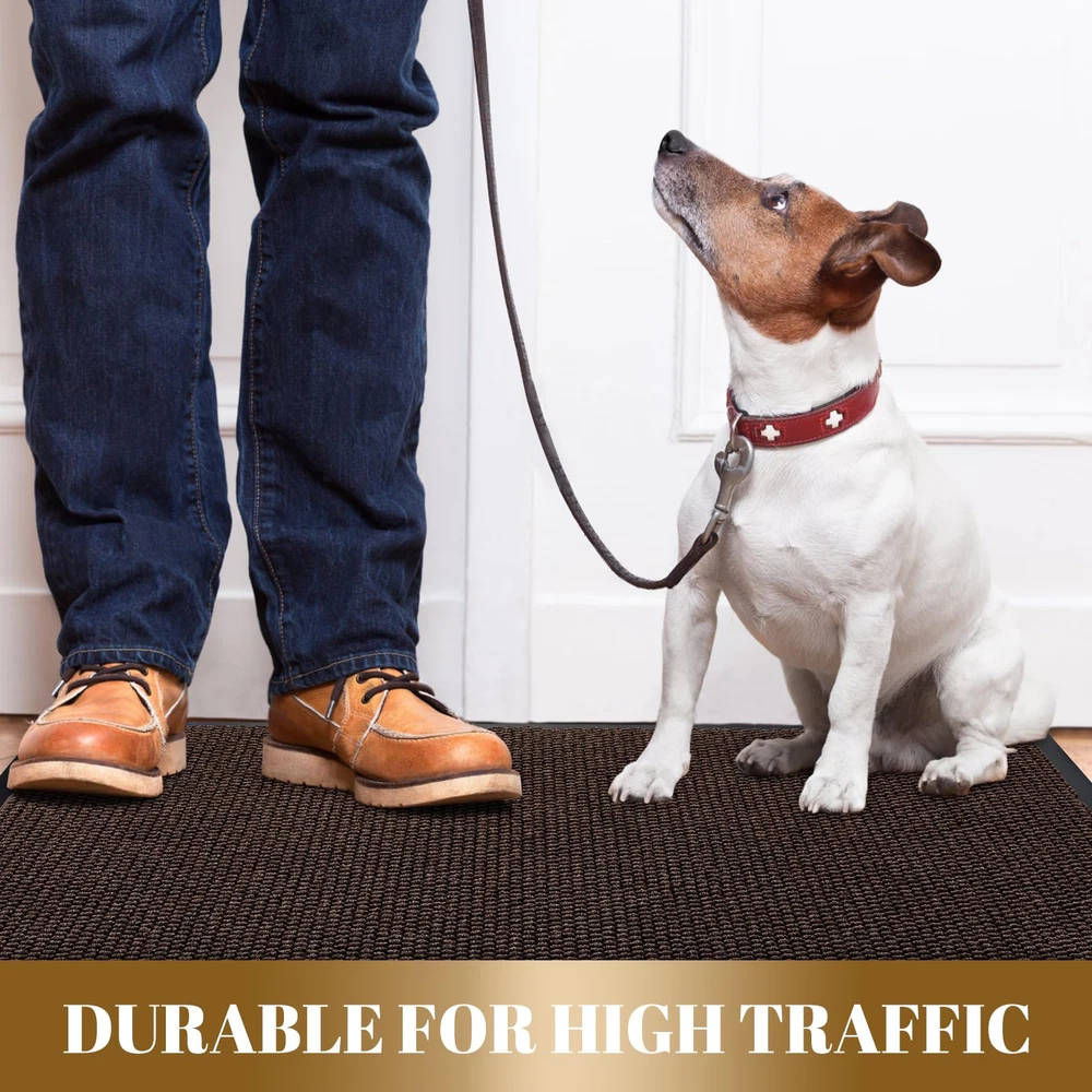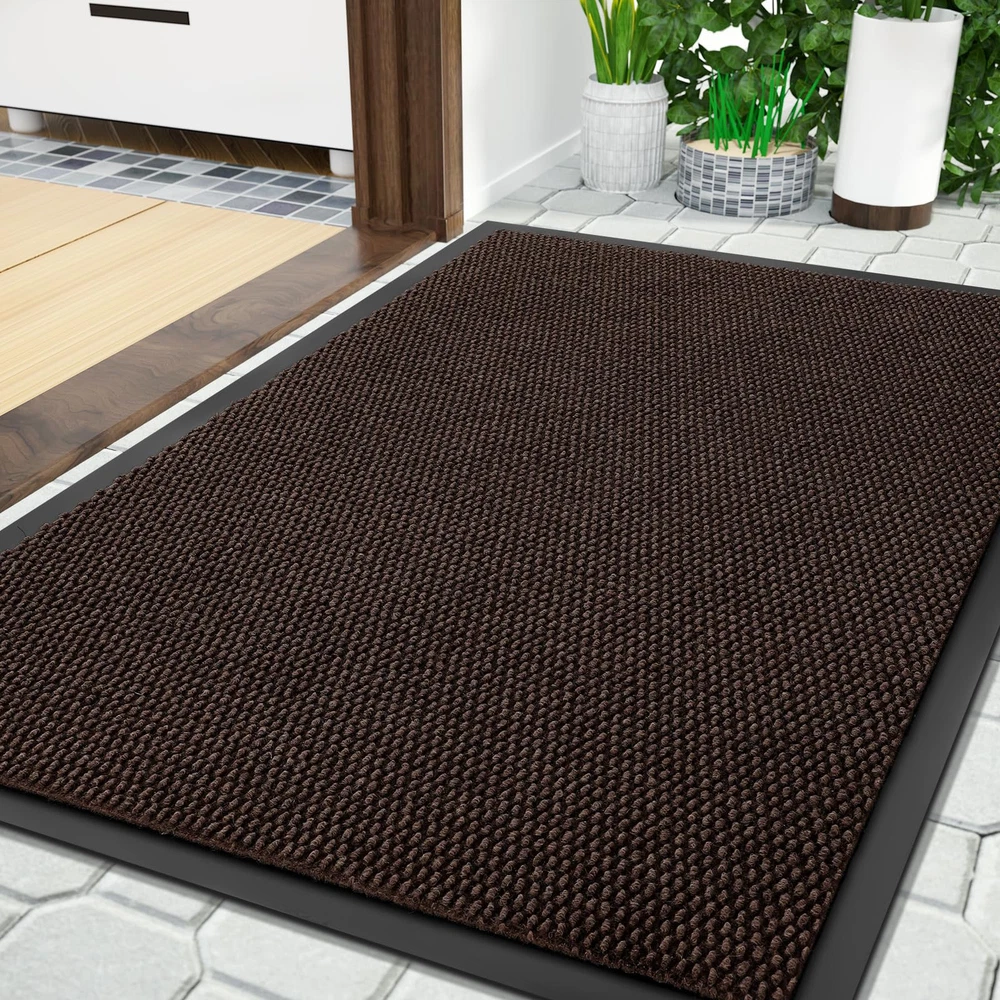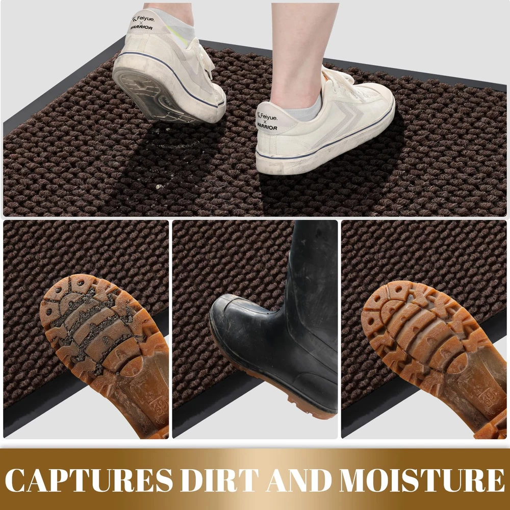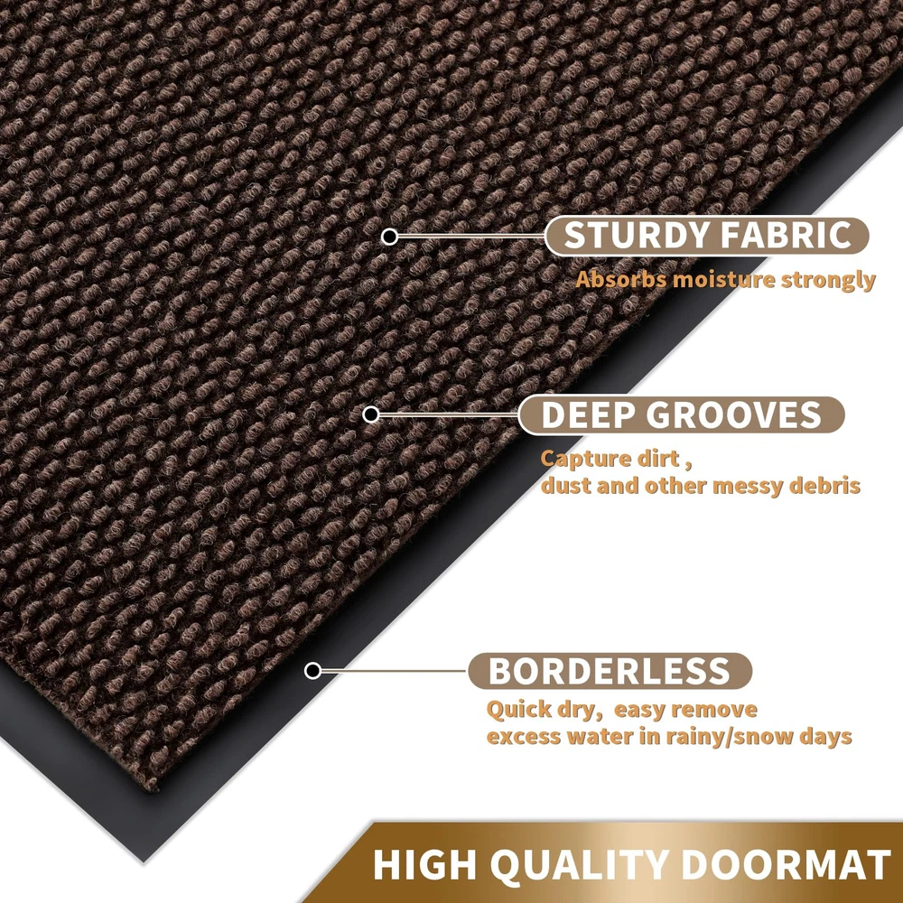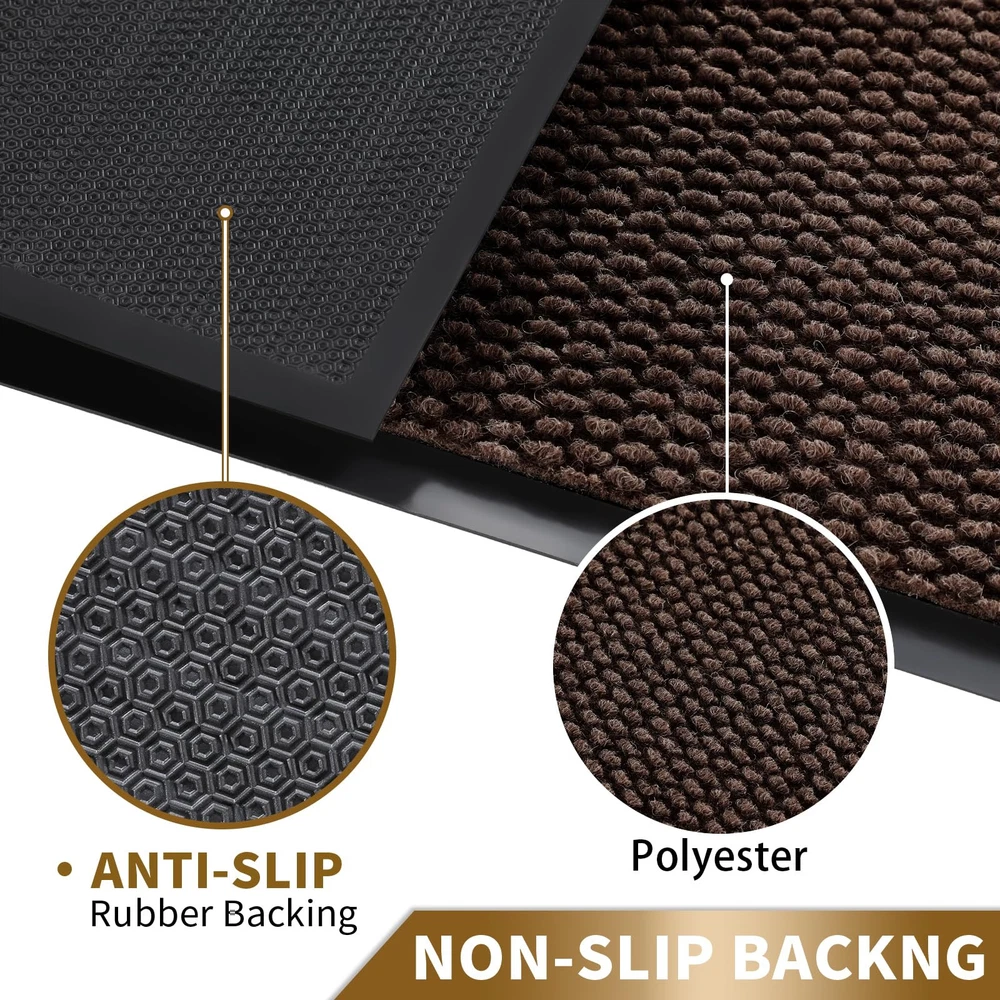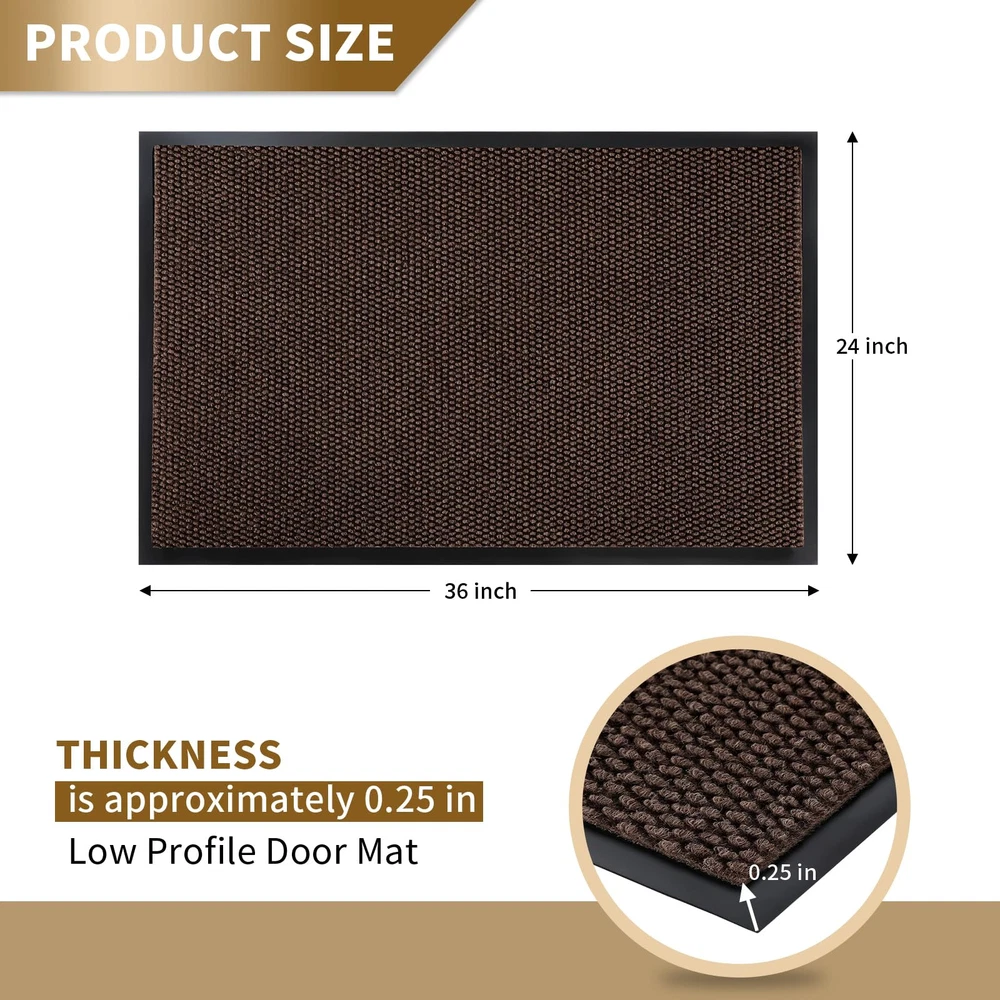 【NON-SLIP RUBBER BACKING】:inside door mat outside entrance, 0.20 inch slim design, can slide under most doorways without snagging rolls.The indoor mat is made of high quality natural rubber backing with higher tensile strength and tear resistance, less odor than synthetic rubber, preventing you from slipping in and out and keeping you safe.At the same time, the rubber backing prevents water and mud from seeping into the floor, effectively protecting your interior floor. 【Easy to Clean】:exterior door mat, Just use a vacuum cleaner, or sweep with a broom, or tap the backing and shake the doormat. For more in-depth cleaning, use a washing machine or garden hose to rinse the floor mat, then hang it in a ventilated place to air dry it or use a dryer. 【Stain & Fade Resistant】:The surface of this outside matt front door all weather is made of high-quality polyester, unique Hot-melt Planting Production Process, which is designed to be sturdy, strong and flexible. The doormat in outside can withstand a variety of weather and seasonal changes, whether it is sunny, rainy or snowy. 【Capture Dirt and Moisture】:shoe mat adopts classic square grid deep groove design, forming a detention dam extending in all directions, helping to capture dirt, dust, gravel, mud, sand, grass or other messy debris and prevent them from entering Indoor; The surface of floor mat beautifully woven polyester fabric absorbs moisture, and the borderless design allows the doormat to keep water from pooling on rainy or snowy days, keeping your home dry and clean. 【Wide Use】:versatile dirt trapper door mat for house are stylish and practical, suitable for indoor use to keep the floors of homes, living spaces, lobbies and offices clean, or outdoor use in front doors, sidewalks, terraces, garages, barns, driveways and many others busy areas; Heavy and sturdy materials, soft and flexible;Simple and stylish design complements any decoration.