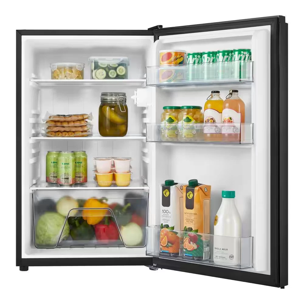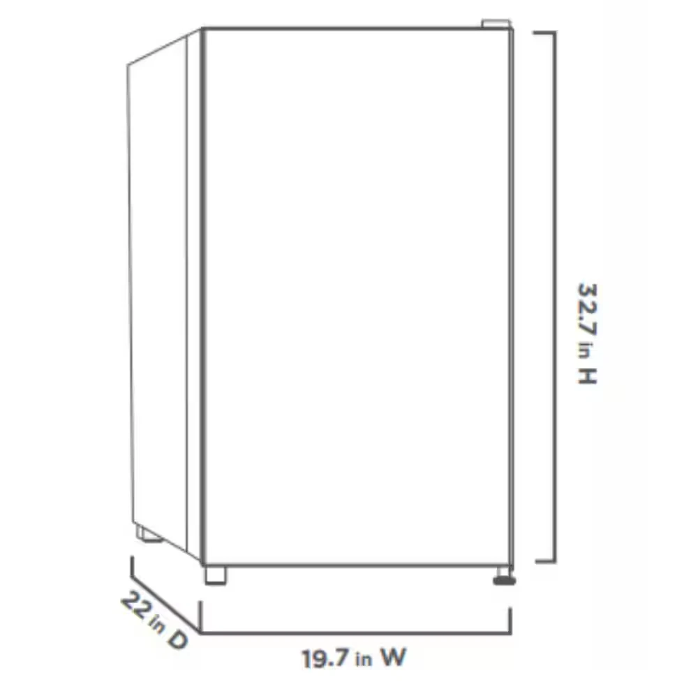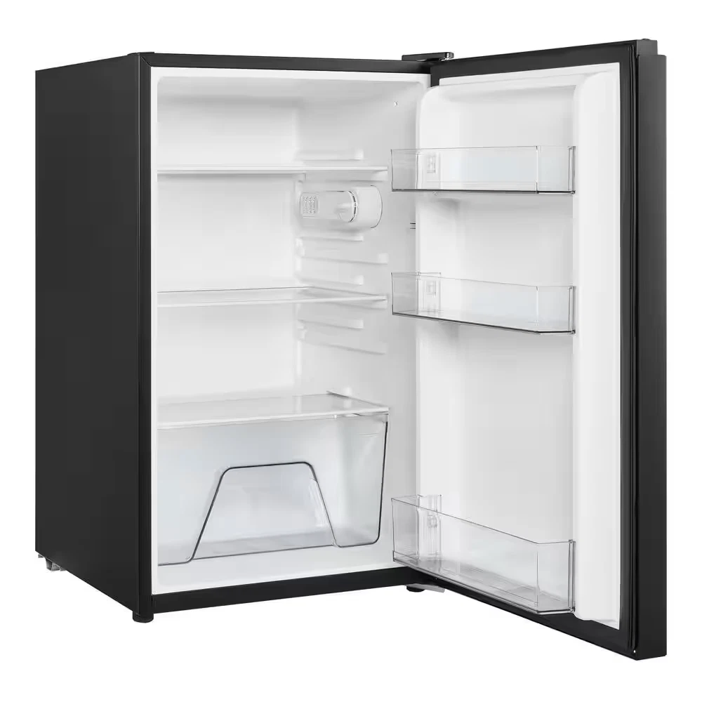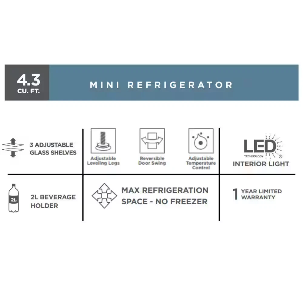 Model: Does not apply Freezer Capacity (cu ft): 0 cu ft UPC: 726084962989 Installation Depth: Counter Depth Color: Does not apply Depth (Including Handles) (in): 22 in Freezer Features: No Additional Features Number of Freezer Baskets/Bins: No Baskets/Bins Water Filter Replacement Model#: Not applicable Appliance Category: Refrigerator Color - Appliance Cabinet: Black Shelf Material - Refrigerator: Glass Refrigerator Capacity (cu ft): 4.3 cu ft Type: Does not apply Color/Finish: Black Operational Features: Dial Temperature Control Number of Freezer Shelves: No Shelves Installation: Does not apply Number of Doors: 1 Door Appliance Type: Compact Refrigerator Manufacturer Warranty: 1 Year Parts and Labor; 5 Years Compressor (Part Only) Depth (Less Door) (in): 19.3 in Appliance Series: Not Applicable Hardware Color/Finish: Black Indoor/Outdoor: Indoor Product Weight (lb): 47.84 lb Storage Features: Crisper Drawer,Removable Shelves Ice Maker Features: No Ice Maker Handle Type: Recessed Handle Refrigeration Dispenser Features: No Dispenser Depth (Excluding Handles) (in): 22 in Number of Refrigerator Shelves: 3 Shelves Returnable: 90-Day Brand: Does not apply Temperature Control Type: Internal Analog Freezer Type: No Freezer gtin13: 726084962989 Color - Door Handle(s): Black Total Capacity (cu ft): 4.3 cu ft Energy Efficiency Tier Rating: Not CEE rated Defrost Method: Manual Depth With Door Open 90 Degrees (in): 39.7 in Hardware Color/Finish Family: Black Color/Finish Family: Black General Features: Interior Light Item Width: Does not apply Item Height: Does not apply