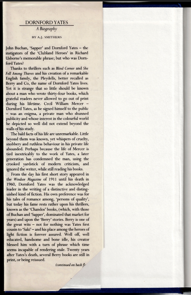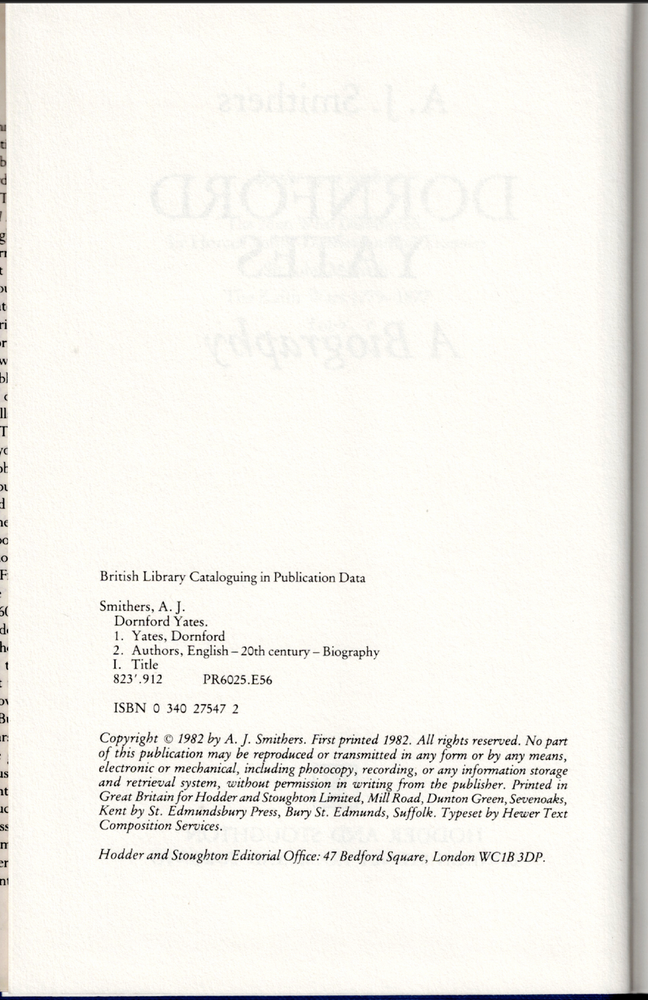 Dornford Yates - A Biography ; by A J Smithers - 1st ed Hardcover Book Dornford Yates - A Biography ; by A J Smithers - 1st ed Hardcover Book This copy is a first edition in VERY GOOD+ used condition overall. The dust-jacket has a fine 1cm tear along the lower edge, it has now been covered in clear, removable, protective film. The boards and binding are in excellent order. The pages DO NOT have any names, inscriptions or marking of text. Click here to visit PATRICK ANDREAS QUALITY BOOKS Store Home Page . Listing and template services provided by inkFrog