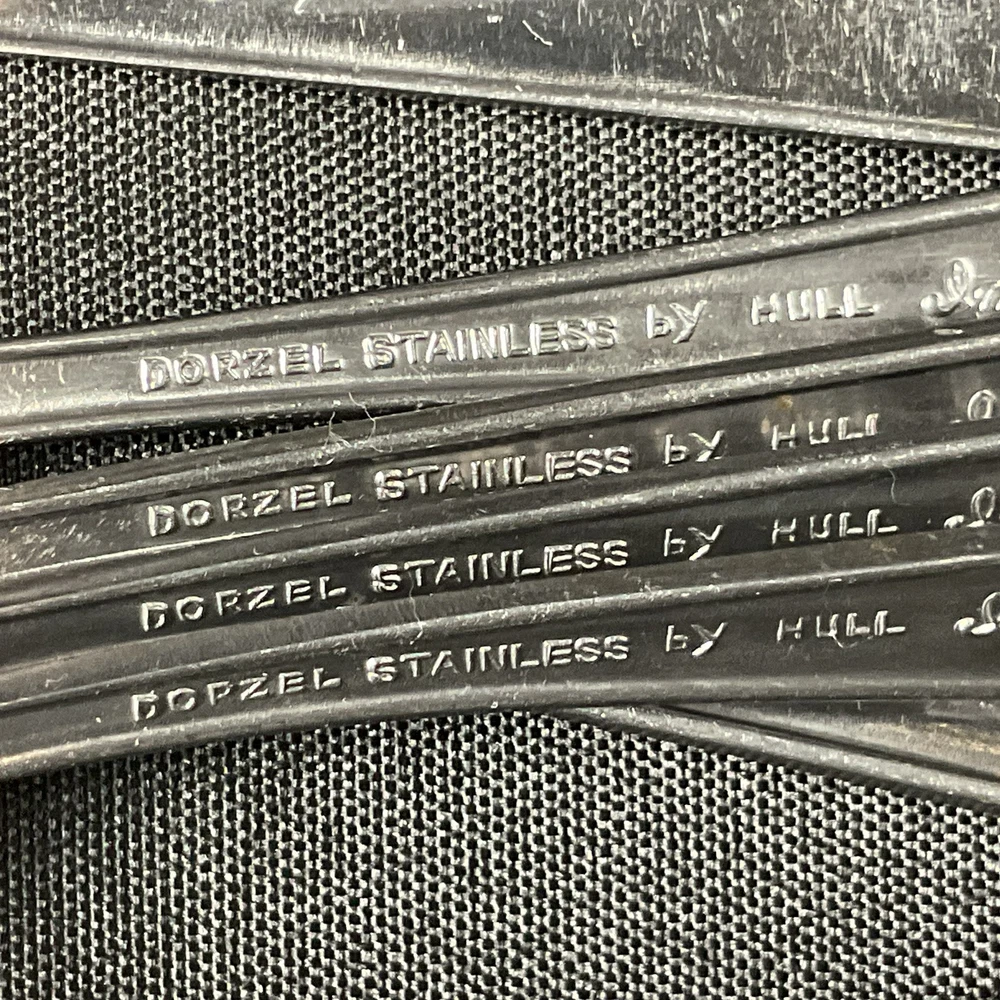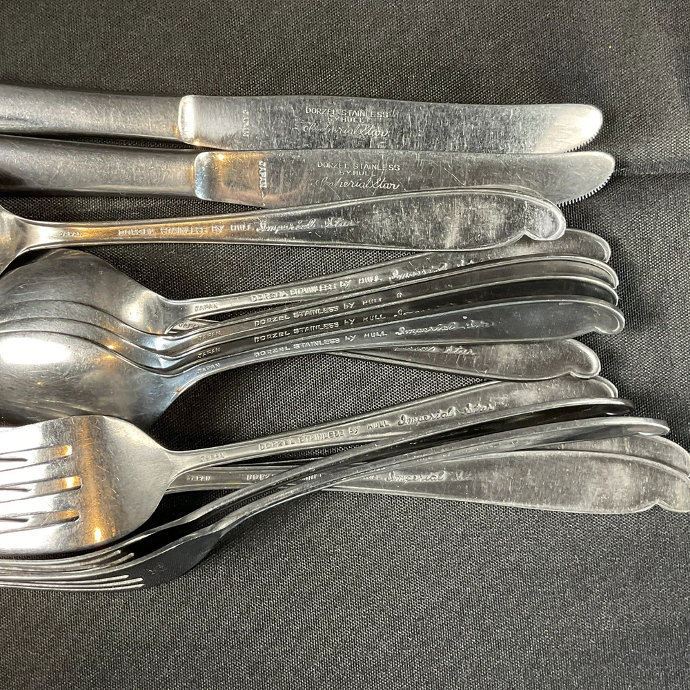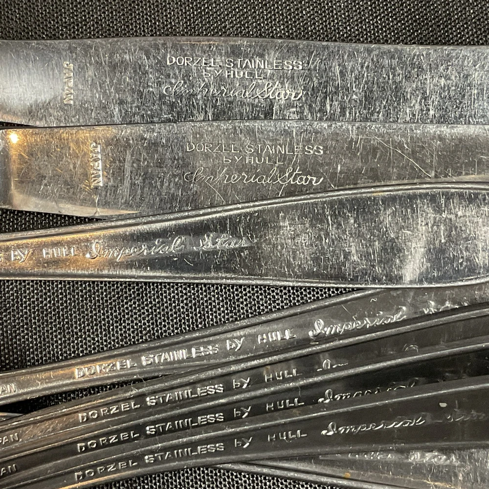 Dorzel Stainless By Hull Imperial Star Flatware Made In Japan Lot of 13 includes 2 knives, 1 tablespoon, 5 teaspoons, 3 salad forks, 2 dinner forks. In very good preowned vintage condition. Please see photos for measurements and additional details.