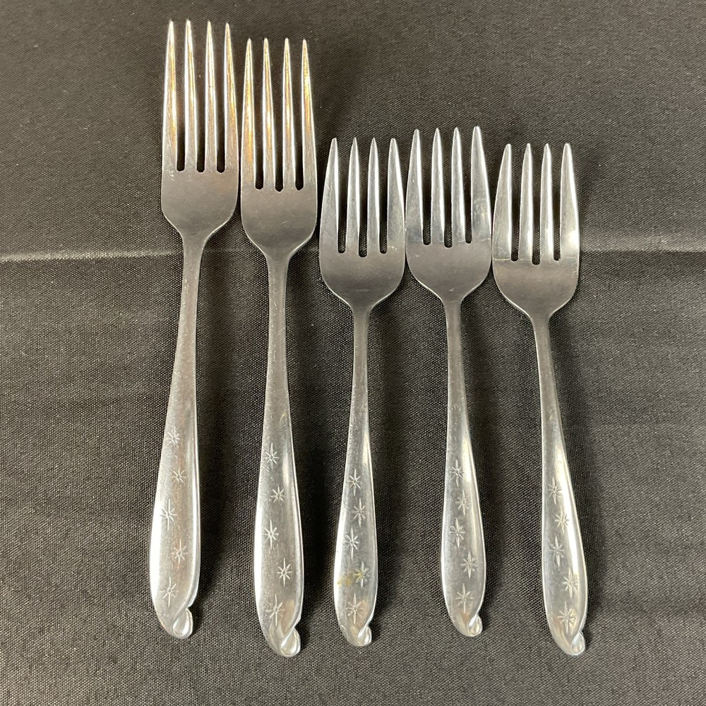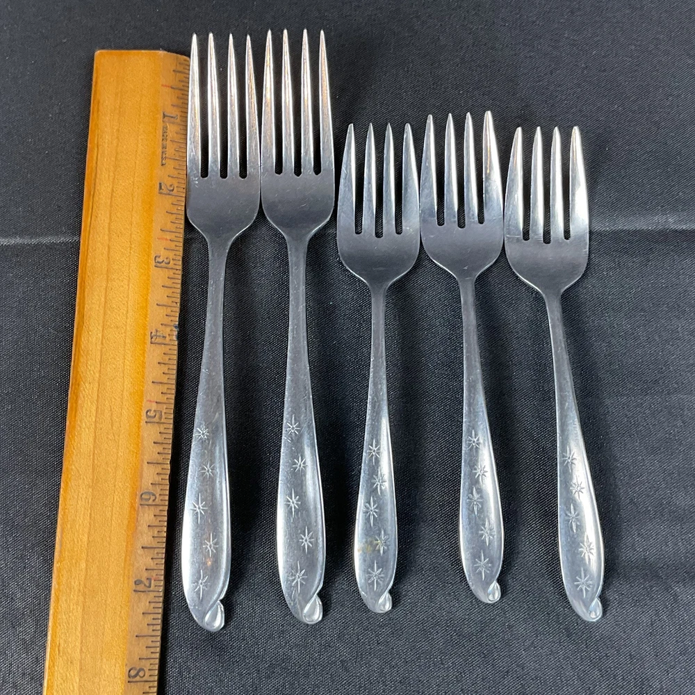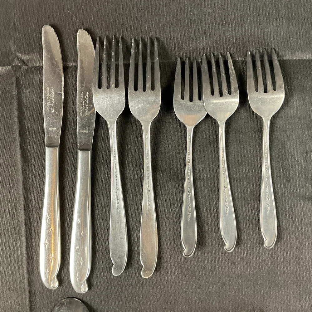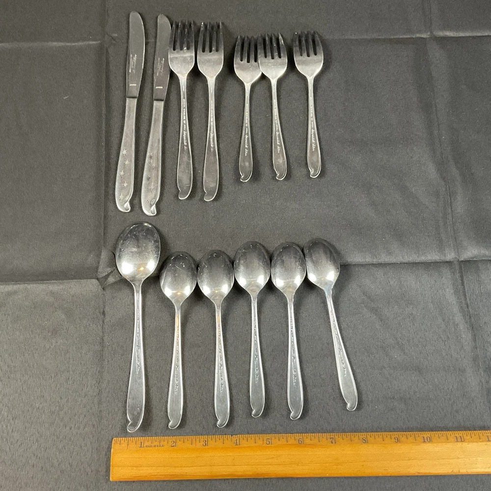 Dorzel Stainless By Hull Imperial Star Flatware Made In Japan Lot of 13 includes 2 knives, 1 tablespoon, 5 teaspoons, 3 salad forks, 2 dinner forks. In very good preowned vintage condition. Please see photos for measurements and additional details.