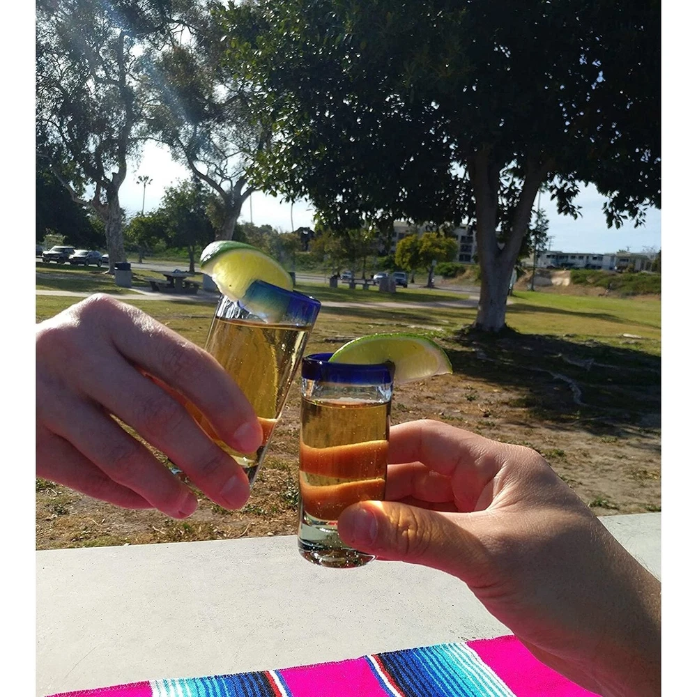 This traditional set of 6 hand blown tequila shot glasses with a blue rim is perfect for your next fiesta! Use them to serve tequila or your favorite liquor of choice. The set adds a great sense of elegance to the dining room that will be enjoyed by everyone. HANDMADE - Each Mexican blown glass is handmade by skilled artisans using techniques handed down from generation to generation. TRADITION - These traditional shot glasses showcase iconic Mexican style. QUALITY - All of our Mexican glassware is made from eco-friendly recycled glass and are lead free. Sturdy and dishwasher safe. SIZE - Each tequila shot glass is approximately 3.9 inches tall and 1.6 inches in diameter. Each glass holds 2 fluid ounces. UNIQUE -Each shot glass is artisan handmade and may vary slightly in size, color and Free Shipping Over $49.99* Details Dos Suenos Hand Blown Mexican Tequila Shot Glasses - Set of 6 Cobalt Blue Rim Product Description: This traditional set of 6 hand blown tequila shot glasses with a blue rim is perfect for your next fiesta! Use them to serve tequila or your favorite liquor of choice. The set adds a great sense of elegance to the dining room that will be enjoyed by everyone. HANDMADE - Each Mexican blown glass is handmade by skilled artisans using techniques handed down from generation to generation. TRADITION - These traditional shot glasses showcase iconic Mexican style. QUALITY - All of our Mexican glassware is made from eco-friendly recycled glass and are lead free. Sturdy and dishwasher safe. SIZE - Each tequila shot glass is approximately 3.9 inches tall and 1.6 inches in diameter. Each glass holds 2 fluid ounces. UNIQUE -Each shot glass is artisan handmade and may vary slightly in size, color and design.