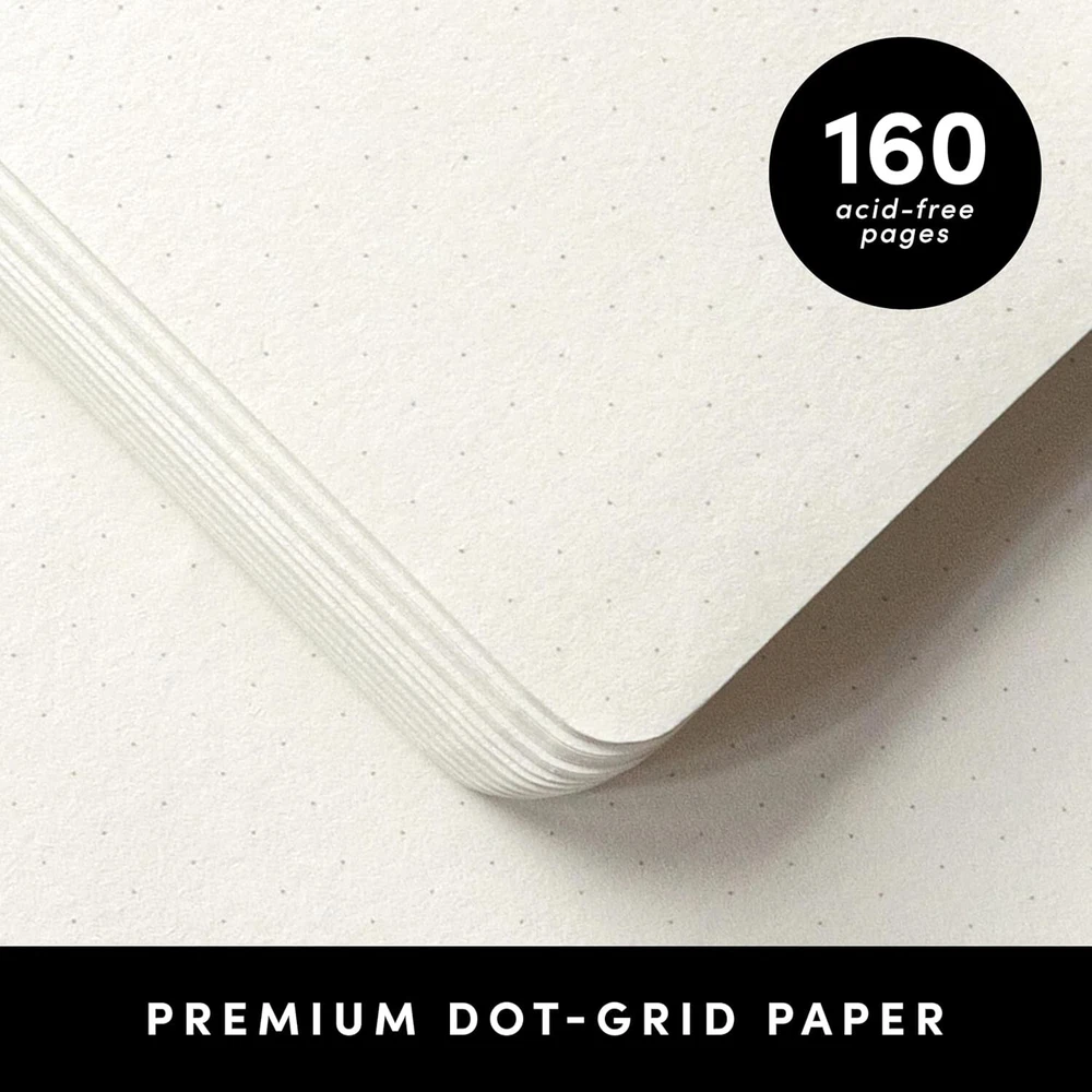 BEST-SELLING HARDCOVER JOURNAL: This medium 5.6 in by 8 in dotted notebook features durable and water-resistant vegan leather cover, rounded corners, 160 pages, inner expandable pocket, sticker labels, ribbon bookmark & elastic closure band. PREMIUM PAPER: Made with high-quality, 100 gsm acid-free paper in light ivory color, our journal paper is thicker than average notebooks & writing pads, so you can confidently use most pens, pencils, and markers without ghosting and bleed-through. LAY FLAT DESIGN FOR WRITING EASE: Our thread-bound notebook is designed to lay flat, making it easier to write for both right and left-handed users. Artistic bullet journaling, note taking, and drawing has never been more convenient. INNER POCKET: Includes an expandable inner storage pocket to keep track of appointment cards, notes, receipts, and more. Personalize your journal cover & spine with the sheet of sticker labels included. VIBRANT & BOLD COLORS: Our journals are designed in a variety of beautiful and fun colors available in a selection of page styles, including Lined (for notetaking & journaling), Blank (for sketching), and Dotted (for bullet journaling).