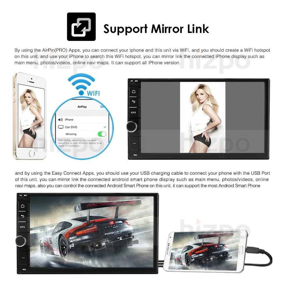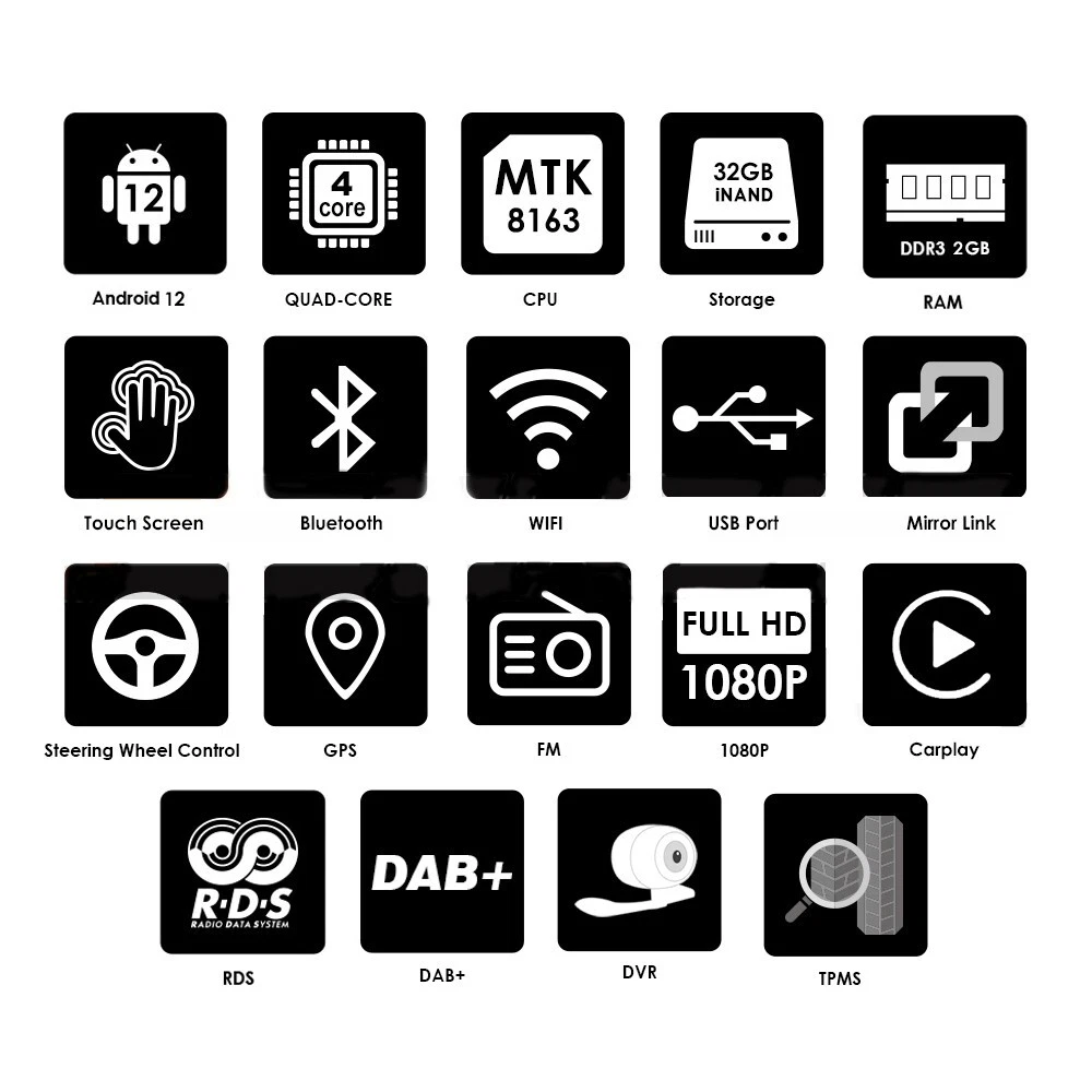 - Power Supply: DC 12V (allowance range: 10.8-14.5V) - Max. Current: 10A - Screen Size: 7 inch General - Operation System: Android 12 - CPU:MTK 8163 4*1.3GHz - RAM: 2GB - ROM: 32GB System - Touch Screen: Yes - Resolution: 1024*600 - Capacitive or Resistance Screen: Capacitive - Built-in Clock and Calendar: Yes, show real time and can use network-provided time - Main Menu Status Bar display: Can be changed to Music/Radio/BT-Stereo Player and Clock/Date/Week - Change Apps-Icon Position: Yes - Key Backlight Color: 7 Button light colors, support RGB Combination Display - WiFi: Built-in WiFi Modem, support 802.11b/g/n - 4G Dongle included: Not Included, you can contact us to buy it together WiFi & 4G - Explorer: Opera, UCWeb, SkyFile, Dolphin and more explorer for your selection - Online Entertainment: Online Video, TV, Movie, Music, Radio, Video Chat - Online Navigation: Online Maps Navigating - Online Games: Yes, online play or you can download it from play store - Online Communication: WeChat, Twitter, Facebook, Skype, Gmail, Whatsapp etc. - Read and edit Office Software: Yes, support Word, Excel, Powerpoint, PDF, TXT Internet - Format: MP3/WMA/MP2/OGG/AAC/MA4/FLAC/APE/WAV etc. Could play via song list - Record: MP3, WMA - Other: LRC synchronized display; ID3 search; Search by files; Album Picture; User-defined audio effect - Amp IC: YD7388 - SNR: Noise rations:=90dB Audio - Format: Support AVI (H.264, DIVX, XVID), RM, RMVB, MKV (H.264, DIVX, XVID). WMA, MOV, MP4 (H.264, MPEG, DIVX, XVID). DAT (VCD format). VOB (DVD format). PMP, MPEG, MPG. FLV (H.263, H.264). ASF, TS, TP, 3GP, MPG etc. =30 formats, Playing internet video directly (while downloading) - Play: Up to 1920*1080 Pixels, 30Mb. Fluent play without light spot Video - Operation System: Android - Support Maps: Android Map,, Sygic, Kudos - Voice Guidance: Yes - Support 2D/3D Map Views: Yes - Dual Zone: Yes, navigating while music playing - Online Navi: Yes, support maps online navigating GPS - Hands Free: Yes - A2DP (Bluetooth Stereo Music): Yes, can play stereo music through Bluetooth - Bluetooth Music Control: Yes, play/pause/previous/next - PB-Download: Yes, can download phonebook from mobile to this unit - PB-Search: Yes, can use the first letter to search contact member in PB-Listings - Calling Records: Yes, Dialed Call, Received Call, Missed Call - Setup: Auto Answer, Auto connect, Device name - Built-in Microphone: Yes, on the front panel - Bluetooth IC: Bluebooth MT6625LN Bluetooth - FM Tuning Range: 87.5-108MHz - FM Increment: 0.05MHz(EU)/0.1MHz(US) - FM Area: Europe/USA1/USA2/Japan/Russia - RADIO IC: MT6625LN(8035) - RDS: On/Off - It doesn't support XM radio, but you can access the same channels using the XM radio app. Radio - Position: 2 USB Port, can be connected with Media/Camera/DAB+ Box / Smartphone - Capacity: 2TB - Play MP5 Videos: Yes, can play RMVB Videos up to 1080P - Touch Music Title to play directly: Yes USB - Built-in Car Recorder App: Yes, just connect a USB Camera to use this function - Support HD CCD Camera: Yes, 1080P - Play recorded Video directly: Yes - Storing Position: Nand Flash/GPS Card/SD Card/USB Storage can be changed DVR - Built-in DAB Player App: Yes - Connection Port: USB - Power Supply to DAB+ Box directly: Yes - Touch Control DAB+ Box on unit: Yes DAB(+)-IN - Built-in Digital TV Tuner: No (you can contact us to buy it together) - External Port for TV Box: Yes, Support DVB-T/DVB-T2/ATSC/ISDB Box - Power Supply to TV Box directly: Yes, you can connect our TV Box to achieve this function - Remote Control the TV Box on unit: Yes, you can use the Remoter of the TV Box to achieve this function DTV-IN - Textbook: Could change font, font color, background color, bookmark, reading E-book while listening music - Photo Viewer: Support JPS, BMP, PNG, GIF etc. format. play by revolve, Powerpoint Support 4096*4096 Pixels - Wallpapers: 5 live wallpapers, 17 standard wallpapers, support DIY wallpaper from Gallery - APK Installer: Support Android Package installer - Support Torque Pro(OBD2 &Car): Yes, you can connect a Bluetooth OBD2 Scanner Tool to use this function - Support Mirror Link function: Yes, support screen mirroring from iPhone and android smartphone - Support TPMS: YES (Not Included, you can contact us to buy it together) Additional - WiFi/Hotspot/Bluetooth: Yes - Brightness level adjustable: Yes - Wallpaper: Wallpapers/Live Wallpapers/Gallery - Sound: Key Tone & Volume - Storage: Display Internal Storage/Nand Flash/Connected Device Storage - Apps: Running Apps display/force stop/uninstall - Security: Yes - Accounts: Yes - Languages and Input: more than 70 Languages and choose input method - Backup and Reset: Yes - Date and Time: Setting Date&Time by yourself or choose GPS/network-provided time - Accessibility: Yes - GPS: Yes, GPS application options/monitoring/sound mode/mixing ratio - Driving safety: Watching Video, Reversing X-mirror/Volume, Reversing Trajectory/radar Display, Rear view ruler - Amplifier: Rock/Pop/Jazz/Classic/Flat/Voice/Custom - Steering Wheel Control: Yes - Factory Settings: choose Radio Band and 88 Open-Unit-Logos - About Device: Display Parameter Info. Setup - AUX Video In: One - Rear-View Camera Video In: One - AUX Audio In: R/L - DTV Box In: One - DAB+ Box In: One - Car DVR In: One - Radio Antenna In: One - GPS Antenna In: One Input - Audio Out: Two (AUX R OUT, AUX L OUT) - Surround Speaker Out: 4*50w - Subwoofer Output: One Output - 1*Power Cable - 2*USB Adapter Cable - 1*GPS Antenna - 1*RCA Harness - 1*Rear Camera input RCA Cable - 2*Install Fittings with Screws - 1*Facia Frame - 1*External Microphone Accessories