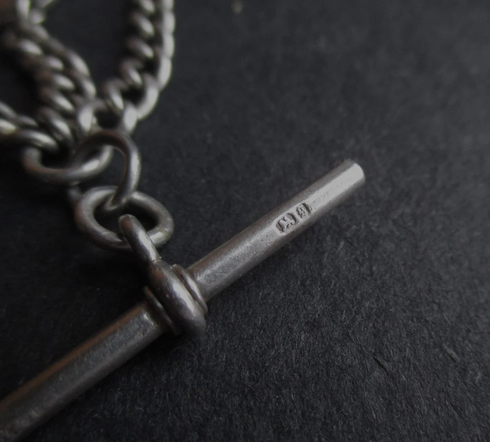 William thorneywork birmingham 1881 sterling silver double albert pocket watch with lions on the links some slightly rubbed .1911 silver sixpence fob. Sterling silver links . Solid silver (tested) clips matching in style on marked SS for sterling silver the other Real Silver. Good condition springy clips .weight 29g . t bar 1.5 inches. chain 17.5 inches long. 5mm wide.