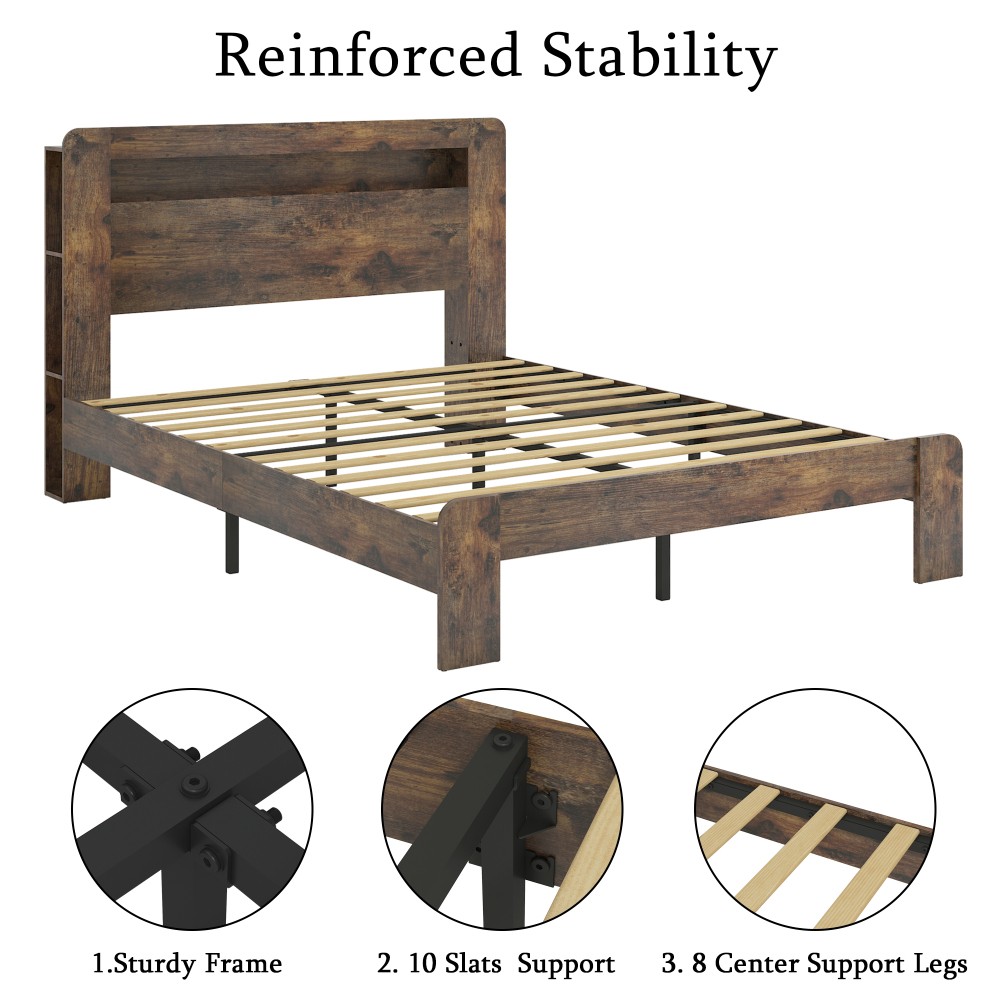 eBay Full Size Wood Platform Bed Frame with LED Headboard & USB Full Size Wood Platform Bed Frame - Dark Brown with LED Headboard, USB Ports & Storage Color: Dark Brown | Material: Metal & Wood | Wood Tone: Brown | Bed Size: Full Style: Vintage, Modern, Multifunctional | Applicable Scene: Bedroom | Box Spring Required: No Product Dimensions (Assembled) Length: 81.61 inches | Width: 53.93 inches | Height: 42.54 inches | Weight: 74.36 lbs Note: Product dimensions are as provided; slight variance from feature section is due to measurement standard differences. Package Dimensions Length: 58.27 inches | Width: 16.34 inches | Height: 6.10 inches | Weight: 82.06 lbs Key Features Storage Headboard with Charging Station: Equipped with 2 standard plug outlets, 2 USB ports, and a 6-foot long power cord, plus cable management to keep wires organized. Charge your phone, tablet, or other devices conveniently while in bed, and keep small items like glasses, books, and remotes within easy reach—combining functionality and convenience. Sturdy & Noise-Free Construction: Built with wood slats and a metal-wood composite frame, reinforcing sturdiness and durability. The structure provides optimal support for all types of mattresses (memory foam, innerspring, latex) without the need for a box spring. Anti-slip and anti-noise design ensures a quiet night’s sleep, no creaks or wobbles. Vintage 2-in-1 Headboard: Blends practical storage with comfortable back support, featuring a vintage-style shelf headboard that complements any bedroom decor—from rustic to modern. Adds a touch of elegance while keeping daily essentials organized, balancing style and utility. Space-Saving & Easy Assembly: Generous under-bed clearance creates extra storage space for boxes, baskets, or seasonal items, maximizing your bedroom space. All parts are clearly labeled and numbered, with included tools and step-by-step instructions—assemble quickly without professional skills, saving time and hassle. LED Light Headboard: Integrated LED lights in the headboard add a warm, ambient glow to your bedroom, perfect for reading, relaxing, or setting a cozy mood. Easily adjust brightness or turn on/off for customizable lighting needs. After-Sales Guarantee ✅ 1-Year Quality Warranty: We offer a 1-year warranty against manufacturing defects, ensuring your bed frame is durable and reliable for long-term use. ✅ 30-Day Free Return & Exchange: Enjoy a 30-day hassle-free return and exchange policy if you’re not completely satisfied. Your satisfaction is our top priority. Note: Mattress is not included. This full-size bed frame is designed to fit standard full-size mattresses, offering a perfect blend of style, functionality, and comfort for any bedroom.