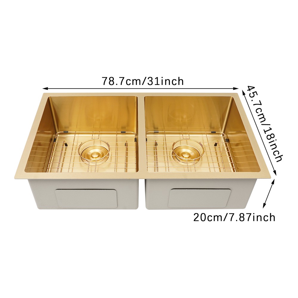 This double-bowl sink is a game-changer for any kitchen! The 304 stainless steel construction feels solid and durable, while the golden finish adds a touch of elegance. I love the spacious dual bowls—perfect for washing dishes and prepping food at the same time. The included grid and drainer make cleanup so much easier, and it wipes clean in seconds. It fits seamlessly into my countertop and instantly elevates the whole space. Highly recommend for anyone wanting both style and functionality!