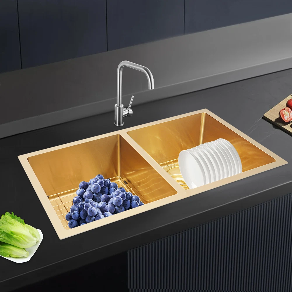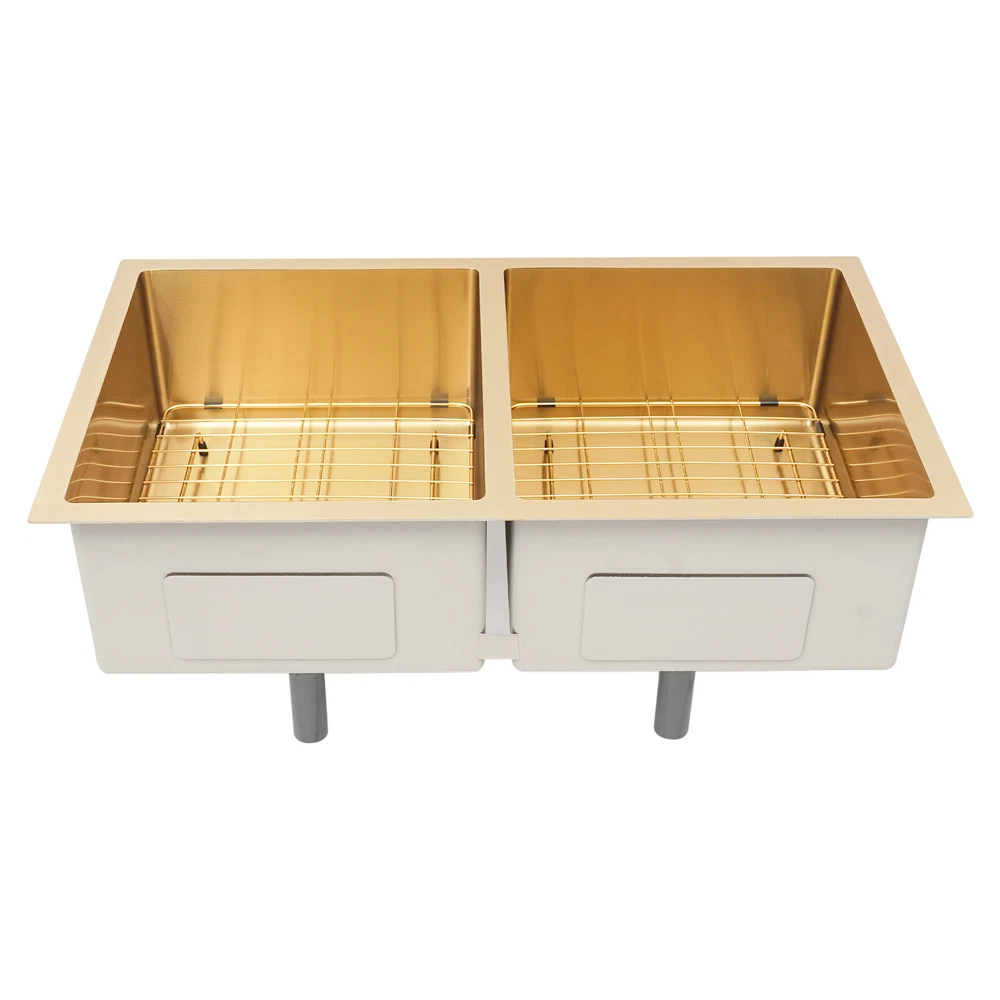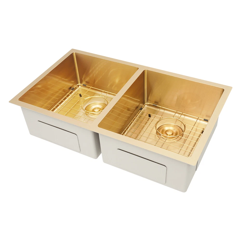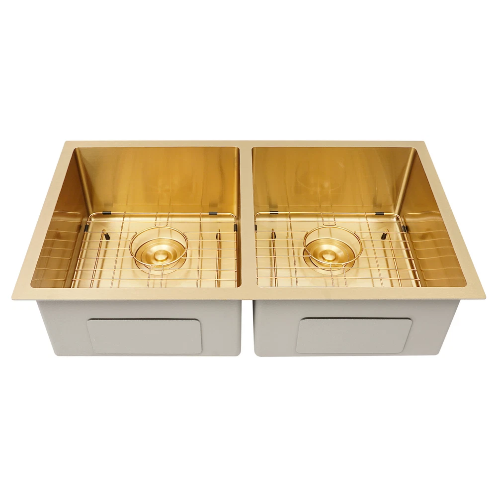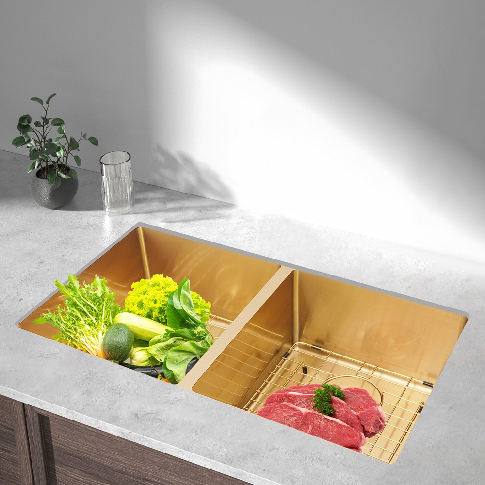 Double Bowl Sink Kitchen Sink 304 Stainless Steel Sink with Grid and Drainer Description Looking for a stylish yet functional sink? Our premium double-bowl sink combines elegance with durability, featuring a stunning golden finish and high-class construction. The dual-bowl design offers plenty of space for multitasking, while included accessories add convenience. Designed to fit most kitchens, it’s easy to clean—just wipe it to maintain its shine. More than just a sink, it’s a statement piece that enhances your kitchen. Key Features Build to Last: Made of premium 304 stainless steel with nano-coating, anti-oxidation, and spraying processes, the product is wear-resistant, rust-resistant, and not easy to deform, ensuring a long service life. Improving Efficiency: The double-bowl design and an overall dimensions of 33.07*20.08*11.42 inches can hold enough tableware at one time, so you can clean them in just one go without batch, which greatly improves efficiency. User-friendly Design : The silent pads around the product and the anti-condensation coating at the bottom can reduce noise and condensation water, maintain a quiet environment, and keep the interior of the cabinet dry. Aesthetic Appeal: Its unique color not only adds a touch of elegance but also sets it apart from ordinary sinks, making your kitchen exude a high-end and stylish atmosphere. Various Accessories: The product comes with necessary components, including a double-bowl sink, 2 bottom grids, 2 drainers, and various other accessories, saving you the hassle of sourcing individual parts separately, and meeting your various kitchen-sink-related needs. Customizable Design: You can freely choose to install the sink above, in, or under the countertop, suiting your countertop design and personal taste. Thoughtful Design: The large drainage hole and X-shaped flow lines enable water to drain rapidly, preventing accumulation at the sink bottom, keeping the sink clean and hygienic and making it simpler to maintain a fresh-smelling and spotless kitchen sink. Easy to Clean: The product has a smooth and flat surface, reducing the time and effort spent on daily maintenance and keeping the sink looking clean and hygienic. Buy with Confidence: We stand behind all our guests and look forward to assisting you with your purchase. It is our pleasure to answer your confusion and questions. Details Sealing Gasket: It can ensure the sealing of the connecting parts, creating a fresher and drier kitchen environment for you. Practical Lid: It blocks odors and keeps water in the sink, enhancing both hygiene and convenience. Bottom Grids: They can prevent pots or utensils from directly contacting the bottom of the sink, protecting the surface of the bottom and the integrity of the anti-condensation coating. Application It is suitable for commercial kitchens, homes, backyards, garages, balconies, laundry rooms, indoor and outdoor restaurants, bars, hotels, cafes, etc. It can be mounted either way above, in, or under the countertop. Specification Material: 304 Stainless Steel Process: Nano Coating, Anti-oxidation, Spraying Color: Gold Style: Modern Shape: Rectangular Mounting Type: Above, In or Under the Countertop Number of Bowls: 2 Package Size: 84*51*29cm/33.07*20.08*11.42in Sink Outer Size: 78.7*45.7*20cm/31*18*7.87in Gross Weight: 9kg/19.84lbs Net Weight: 8.55kg/18.85lbs Package Included 1* Double Bowl Sink 2* Drainers 2* Sink Bottom Grids 2* Lids Other Accessories for Assembly and Use Notes Please check the product size carefully before purchasing. Please note that the product does not include other items. Please allow the slight color difference caused by the shooting light and 1-3cm error due to manual measurement, and make sure you do not mind befo Payment Delivery details Terms of sales About us Contact us Payment We accept ebay payment 。 Fees such as import duties, taxes are not included in the item price or shipping costs. These charges are the buyer's responsibility. Delivery details Shipping: 2-9 working days to: USA Terms of sales We maintain high standards of excellence and strive for hundred percent customer satisfaction. Feedback is very important to us. We hope that you contact us immediately before you give neutral or negative feedback, so that we can address your concerns. It is impossible to address issues if we do not know about them! About us Your satis faction is our ultimate goal. We work hard to earn your trust and future business. Our certified technicians have tested each item before shipping. The unit comes with 1 year limited warranty on all manufacturing defects. a) If you receive a defective item, you may return it or ask for a discount. Please contact us within 14 days after you receive the package. b) What you returned must be intact and in its original packaging as re? u. Customer is responsible for shipping costs of the returned item. c) We will cover the cost of shipping back t with the shipping rate indicated in the registration page. We will send you a new unit or refund the full payment you paid. Thank you. Contact us Business Hour Business Hour: Monday To Friday: 8:30 AM to 5:00 PM (Beijing China time) Due to time zones, our reply to your questions may not be immediately. But within above working time, we will reply your email within 24 hours. If it's non-workdays, please kindly be patient and wait till Monday. Please contact us with ebay message. Please feel free to contact us if you have any questions. Monday To Friday: 8:30 AM to 5:00 PM (Beijing China time) Due to time zones, our reply to your questions may not be immediately. But within above working time, we will reply your email within 24 hours. If it's non-workdays, please kindly be patient and wait till Monday. Please contact us with ebay message. Please feel free to contact us if you have any questions.