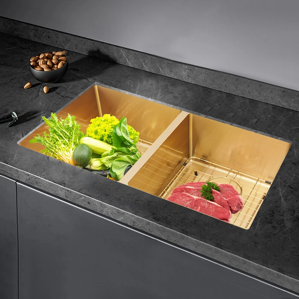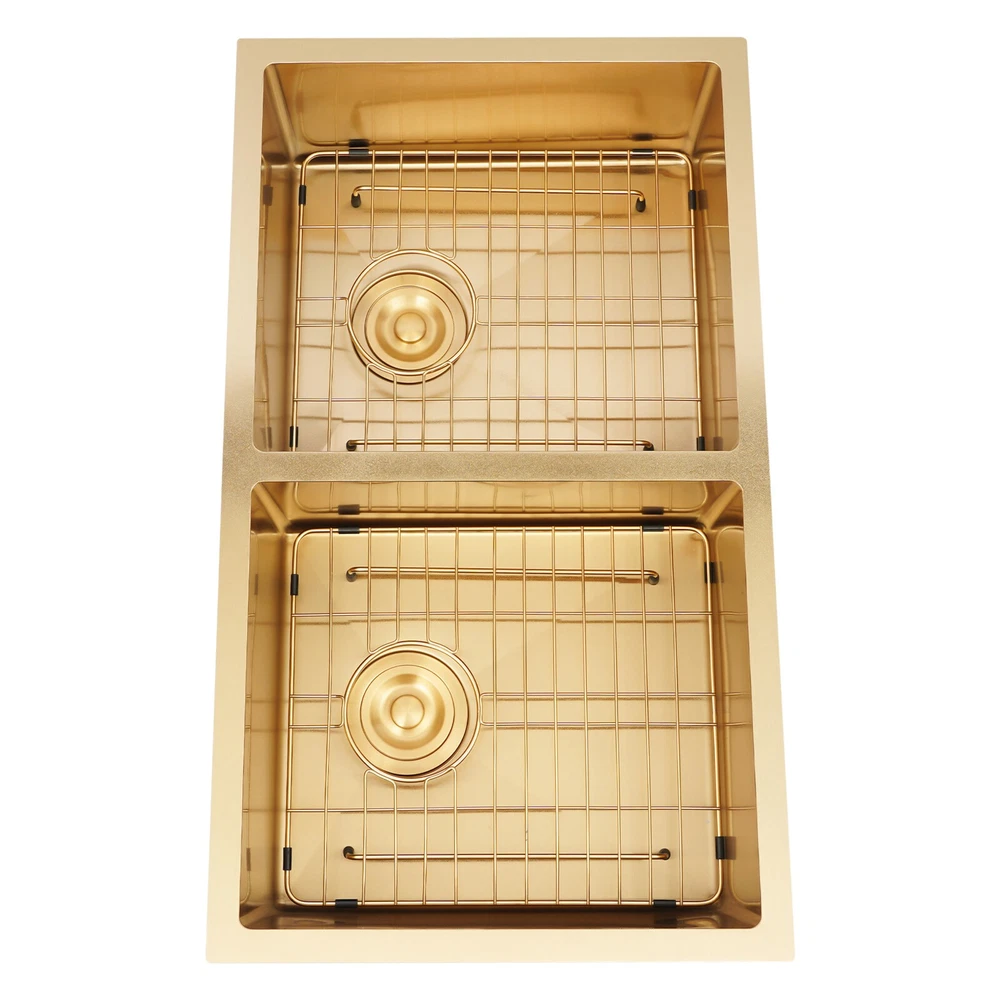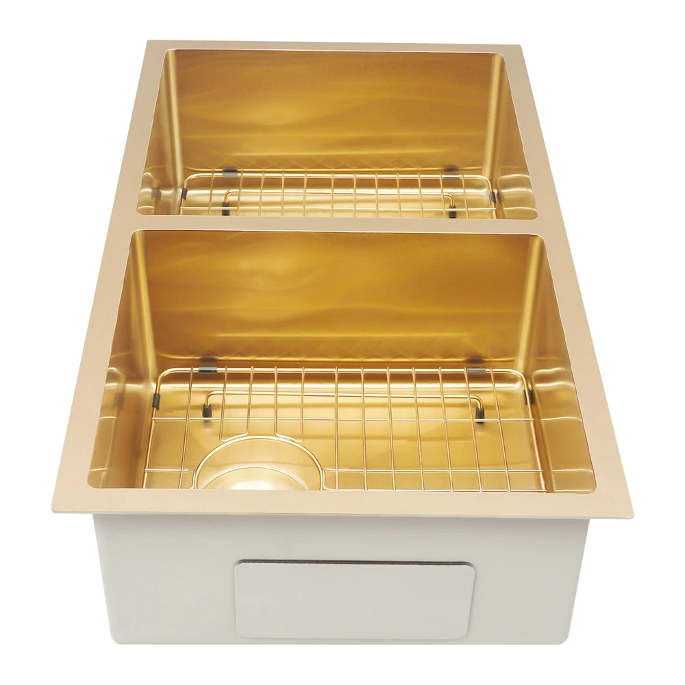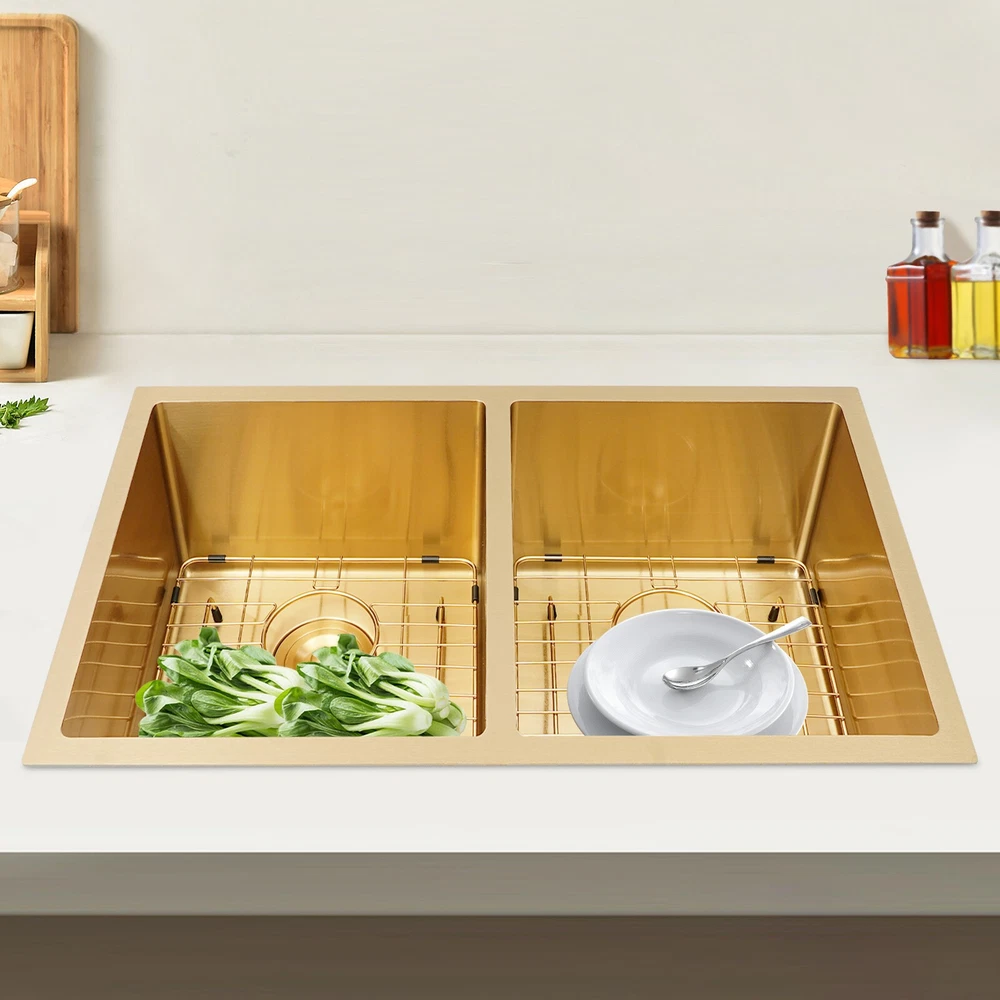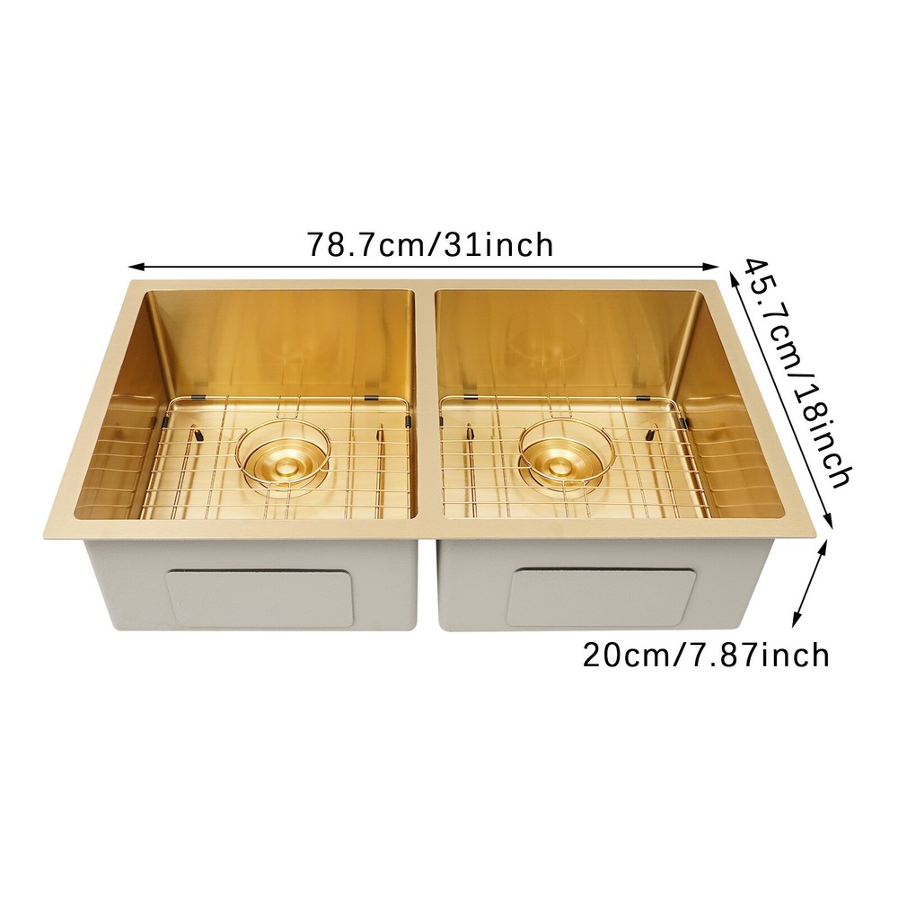 Double Bowl Sink Kitchen Sink 304 Stainless Steel Sink with Grid and Drainer Description Looking for a stylish yet functional sink? Our premium double-bowl sink combines elegance with durability, featuring a stunning golden finish and high-class construction. The dual-bowl design offers plenty of space for multitasking, while included accessories add convenience. Designed to fit most kitchens, it’s easy to clean—just wipe it to maintain its shine. More than just a sink, it’s a statement piece that enhances your kitchen. Key Features Build to Last: Made of premium 304 stainless steel with nano-coating, anti-oxidation, and spraying processes, the product is wear-resistant, rust-resistant, and not easy to deform, ensuring a long service life. Improving Efficiency: The double-bowl design and an overall dimensions of 33.07*20.08*11.42 inches can hold enough tableware at one time, so you can clean them in just one go without batch, which greatly improves efficiency. User-friendly Design : The silent pads around the product and the anti-condensation coating at the bottom can reduce noise and condensation water, maintain a quiet environment, and keep the interior of the cabinet dry. Aesthetic Appeal: Its unique color not only adds a touch of elegance but also sets it apart from ordinary sinks, making your kitchen exude a high-end and stylish atmosphere. Various Accessories: The product comes with necessary components, including a double-bowl sink, 2 bottom grids, 2 drainers, and various other accessories, saving you the hassle of sourcing individual parts separately, and meeting your various kitchen-sink-related needs. Customizable Design: You can freely choose to install the sink above, in, or under the countertop, suiting your countertop design and personal taste. Thoughtful Design: The large drainage hole and X-shaped flow lines enable water to drain rapidly, preventing accumulation at the sink bottom, keeping the sink clean and hygienic and making it simpler to maintain a fresh-smelling and spotless kitchen sink. Easy to Clean: The product has a smooth and flat surface, reducing the time and effort spent on daily maintenance and keeping the sink looking clean and hygienic. Buy with Confidence: We stand behind all our guests and look forward to assisting you with your purchase. It is our pleasure to answer your confusion and questions. Details Sealing Gasket: It can ensure the sealing of the connecting parts, creating a fresher and drier kitchen environment for you. Practical Lid: It blocks odors and keeps water in the sink, enhancing both hygiene and convenience. Bottom Grids: They can prevent pots or utensils from directly contacting the bottom of the sink, protecting the surface of the bottom and the integrity of the anti-condensation coating. Application It is suitable for commercial kitchens, homes, backyards, garages, balconies, laundry rooms, indoor and outdoor restaurants, bars, hotels, cafes, etc. It can be mounted either way above, in, or under the countertop. Specification Material: 304 Stainless Steel Process: Nano Coating, Anti-oxidation, Spraying Color: Gold Style: Modern Shape: Rectangular Mounting Type: Above, In or Under the Countertop Number of Bowls: 2 Package Size: 84*51*29cm/33.07*20.08*11.42in Sink Outer Size: 78.7*45.7*20cm/31*18*7.87in Gross Weight: 9kg/19.84lbs Net Weight: 8.55kg/18.85lbs Package Included 1* Double Bowl Sink 2* Drainers 2* Sink Bottom Grids 2* Lids Other Accessories for Assembly and Use Notes Please check the product size carefully before purchasing. Please note that the product does not include other items. Please allow the slight color difference caused by the shooting light and 1-3cm error due to manual measurement, and make sure you do not mind befo