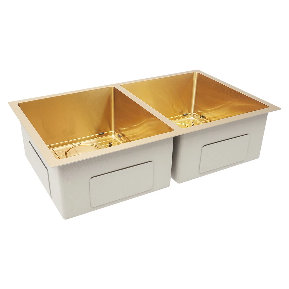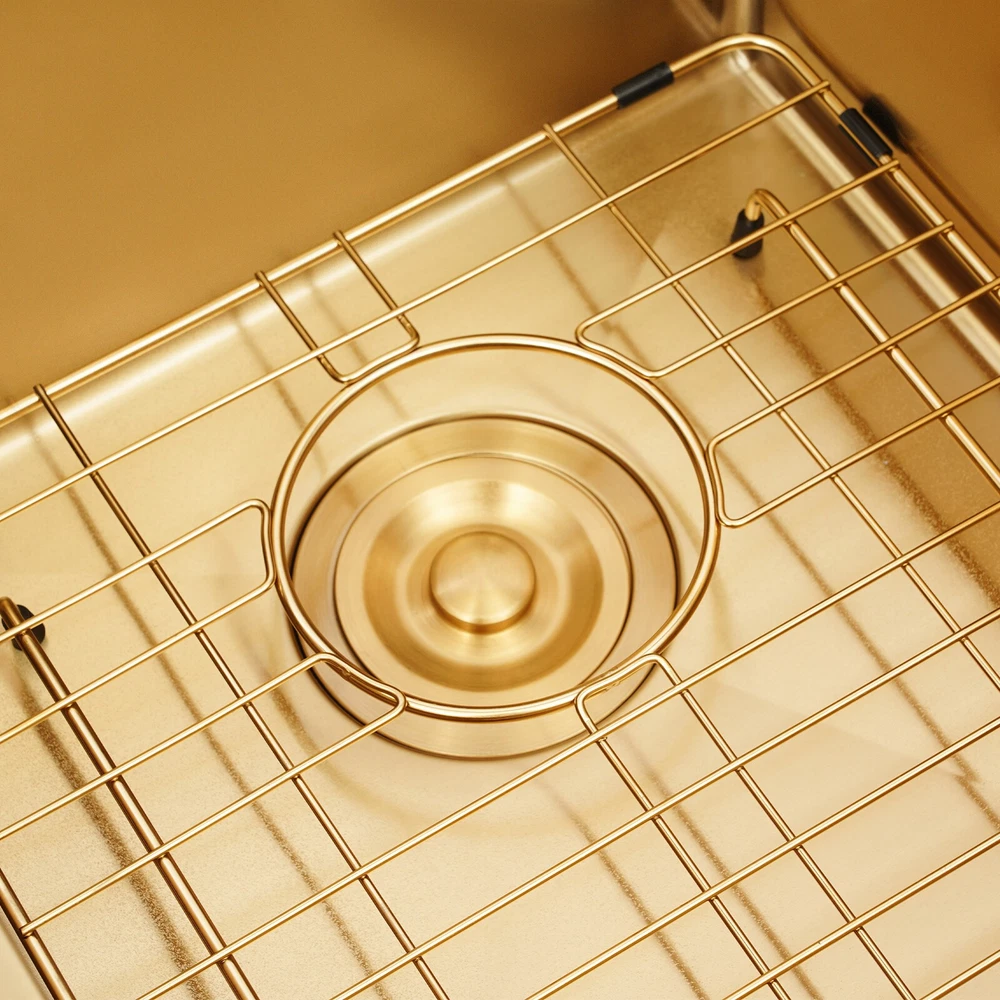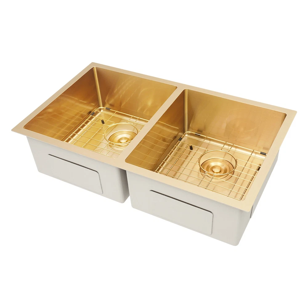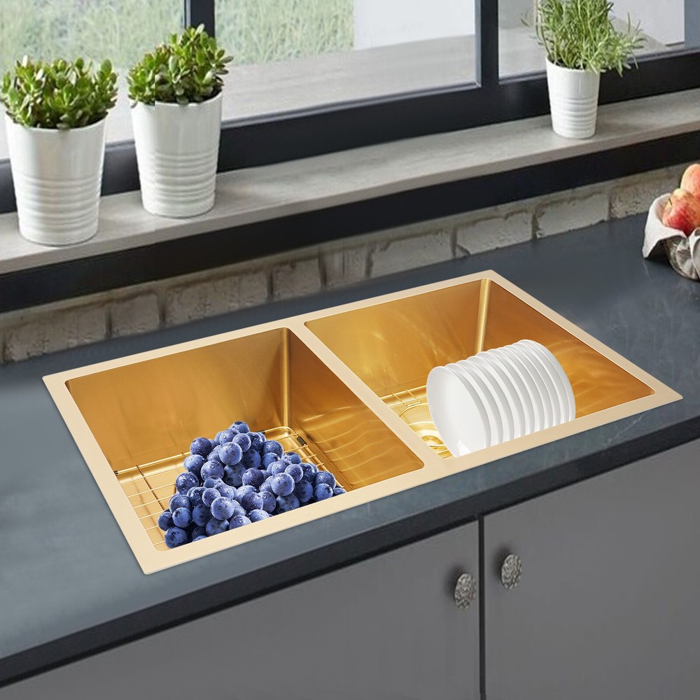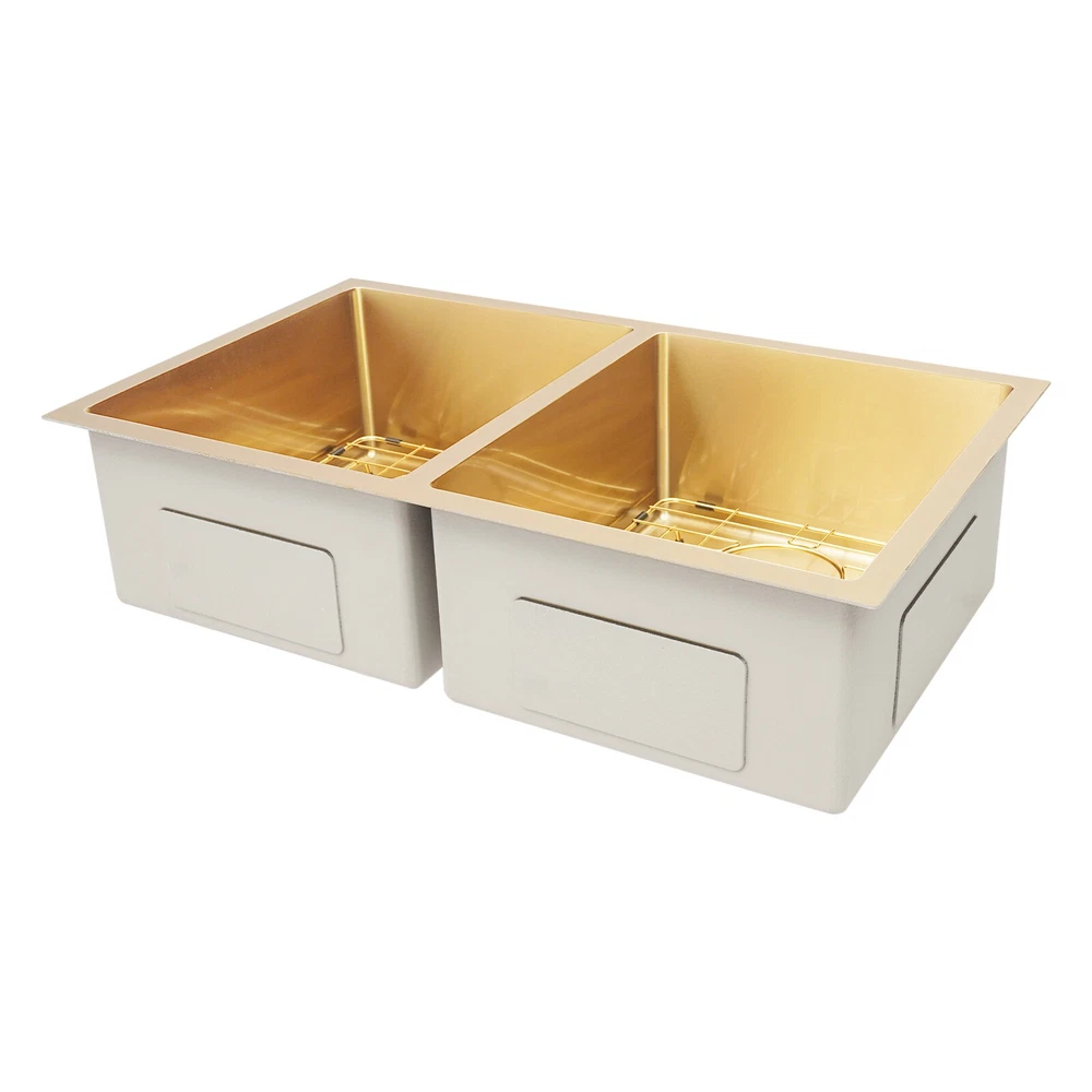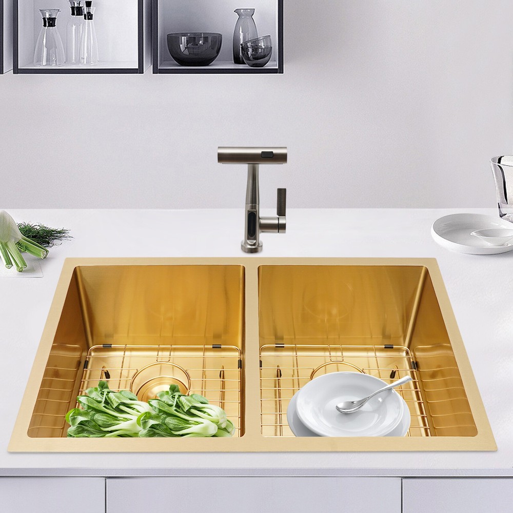Double Bowl Sink Kitchen Sink 304 Stainless Steel Sink with Grid and Drainer Description Looking for a stylish yet functional sink? Our premium double-bowl sink combines elegance with durability, featuring a stunning golden finish and high-class construction. The dual-bowl design offers plenty of space for multitasking, while included accessories add convenience. Designed to fit most kitchens, it’s easy to clean—just wipe it to maintain its shine. More than just a sink, it’s a statement piece that enhances your kitchen. Key Features Build to Last: Made of premium 304 stainless steel with nano-coating, anti-oxidation, and spraying processes, the product is wear-resistant, rust-resistant, and not easy to deform, ensuring a long service life. Improving Efficiency: The double-bowl design and an overall dimensions of 33.07*20.08*11.42 inches can hold enough tableware at one time, so you can clean them in just one go without batch, which greatly improves efficiency. User-friendly Design : The silent pads around the product and the anti-condensation coating at the bottom can reduce noise and condensation water, maintain a quiet environment, and keep the interior of the cabinet dry. Aesthetic Appeal: Its unique color not only adds a touch of elegance but also sets it apart from ordinary sinks, making your kitchen exude a high-end and stylish atmosphere. Various Accessories: The product comes with necessary components, including a double-bowl sink, 2 bottom grids, 2 drainers, and various other accessories, saving you the hassle of sourcing individual parts separately, and meeting your various kitchen-sink-related needs. Customizable Design: You can freely choose to install the sink above, in, or under the countertop, suiting your countertop design and personal taste. Thoughtful Design: The large drainage hole and X-shaped flow lines enable water to drain rapidly, preventing accumulation at the sink bottom, keeping the sink clean and hygienic and making it simpler to maintain a fresh-smelling and spotless kitchen sink. Easy to Clean: The product has a smooth and flat surface, reducing the time and effort spent on daily maintenance and keeping the sink looking clean and hygienic. Buy with Confidence: We stand behind all our guests and look forward to assisting you with your purchase. It is our pleasure to answer your confusion and questions. Details Sealing Gasket: It can ensure the sealing of the connecting parts, creating a fresher and drier kitchen environment for you. Practical Lid: It blocks odors and keeps water in the sink, enhancing both hygiene and convenience. Bottom Grids: They can prevent pots or utensils from directly contacting the bottom of the sink, protecting the surface of the bottom and the integrity of the anti-condensation coating. Application It is suitable for commercial kitchens, homes, backyards, garages, balconies, laundry rooms, indoor and outdoor restaurants, bars, hotels, cafes, etc. It can be mounted either way above, in, or under the countertop. Specification Material: 304 Stainless Steel Process: Nano Coating, Anti-oxidation, Spraying Color: Gold Style: Modern Shape: Rectangular Mounting Type: Above, In or Under the Countertop Number of Bowls: 2 Package Size: 84*51*29cm/33.07*20.08*11.42in Sink Outer Size: 78.7*45.7*20cm/31*18*7.87in Gross Weight: 9kg/19.84lbs Net Weight: 8.55kg/18.85lbs Package Included 1* Double Bowl Sink 2* Drainers 2* Sink Bottom Grids 2* Lids Other Accessories for Assembly and Use Notes Please check the product size carefully before purchasing. Please note that the product does not include other items. Please allow the slight color difference caused by the shooting light and 1-3cm error due to manual measurement, and make sure you do not mind befo