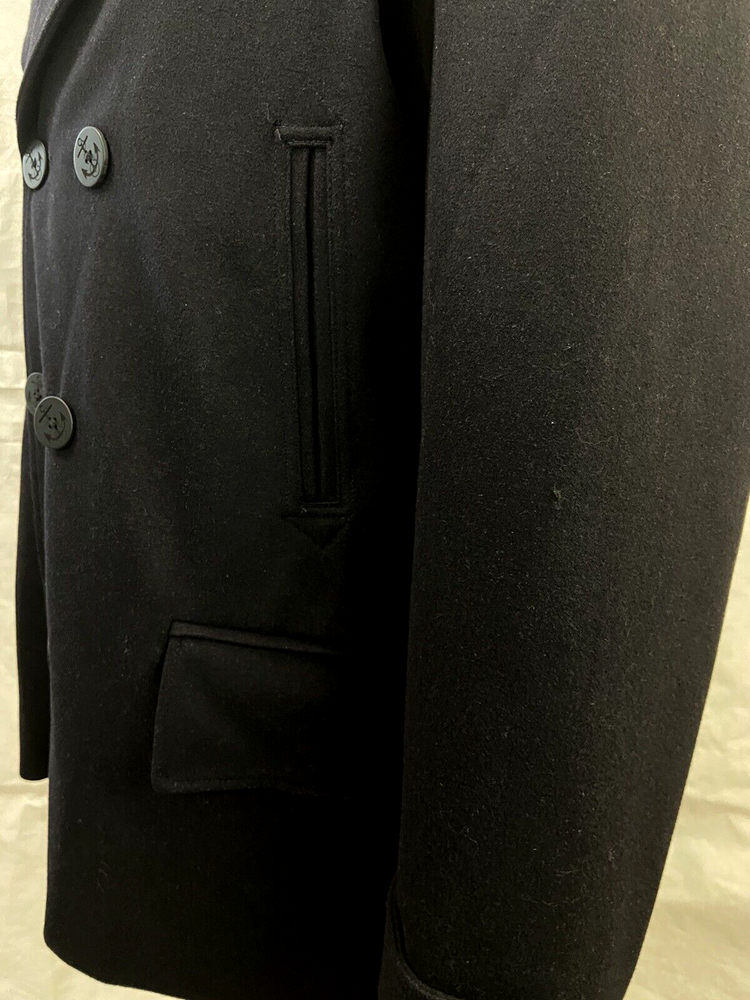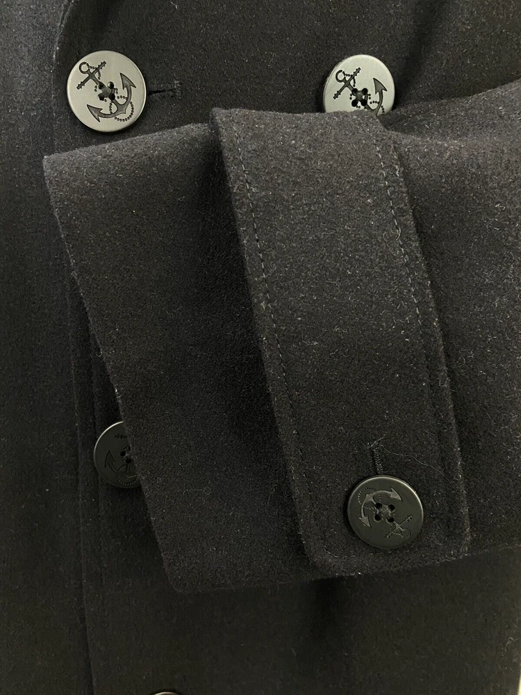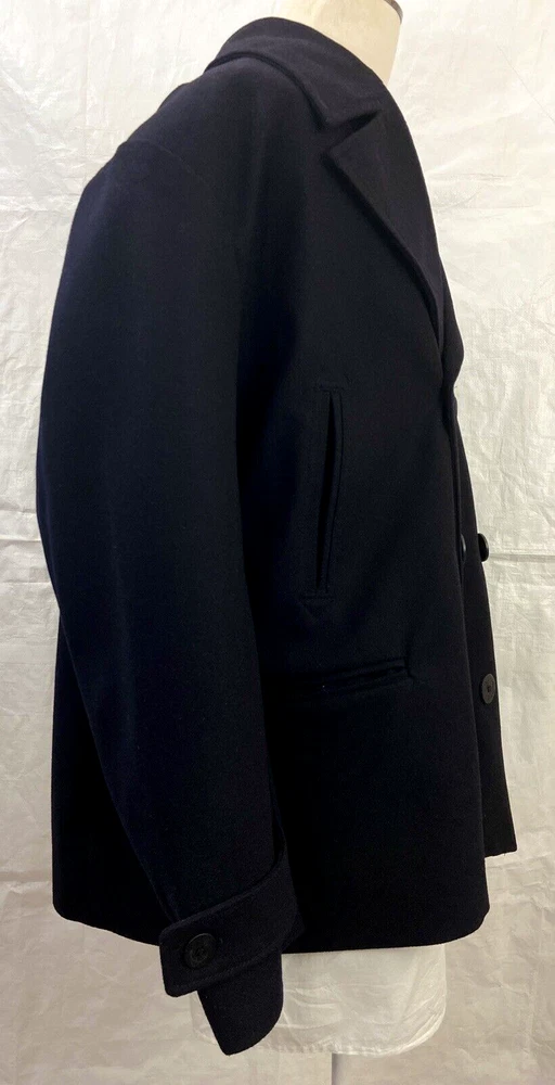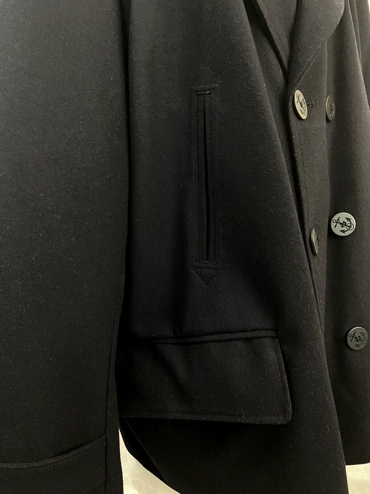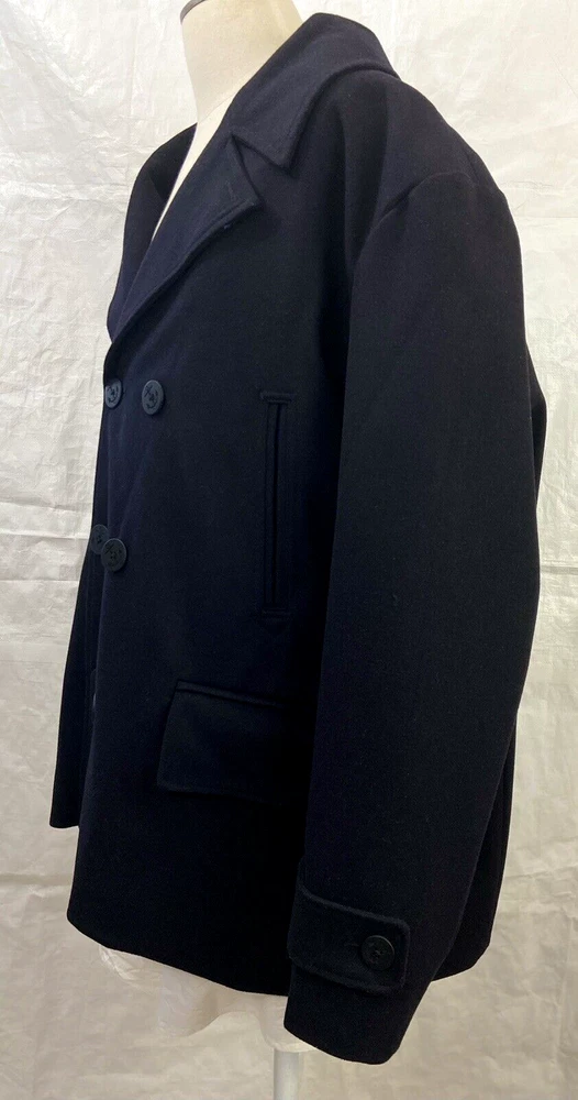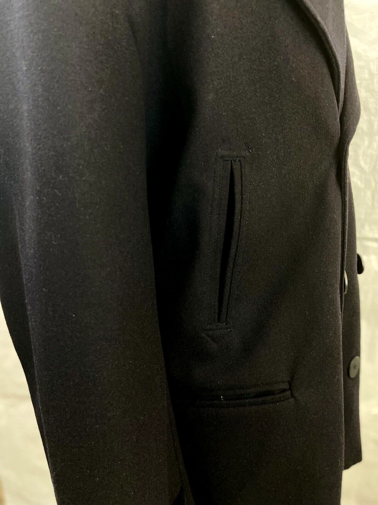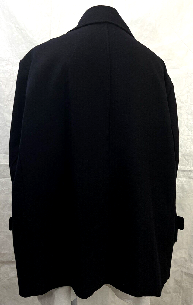 This black wool jacket by Mutual Weave is a classic pea coat style coat with a double-breasted button closure and spread collar. The coat is lined with polyester and has a quilted lining for added warmth. It features inner left pockets, shoulder pads, and pockets for added convenience. The coat is made of a blend of 41% wool, 41% polyester, and 7% acrylic, making it a durable and comfortable choice for any occasion. The coat is available in size 4XL and is suitable for big and tall men. It is suitable for travel, party/cocktail, casual, and business occasions. The coat has a mid-length and is designed with a solid pattern. The jacket has a chest size of 64 inches and is dry clean only. This designer pea coat is perfect for anyone who wants a classic and timeless piece in their wardrobe. Men's Double Breasted Bib Pea Coat Black Wool Jacket Overcoat 4XL Mutual Weave Mutual Weave Men's Black Double Breasted Peacoat Size 4XL New with tags. 41% Wool 41% Polyester 7% Acrylic Lining and filling - 100% Polyester Dry Clean Blue Lining Anchor Imprint on buttons Inside Left pocket Front slash pockets Great looking coat! MSRP $200 Measurements (measured with garment lying flat) Chest: 32" Shoulder to Shoulder: 22 1/2 inches Shoulder seam to Cuff (hem): 27 3/4 inches Length (measured from bottom of collar in back to hem): 33 inches Item # C2088.1 Comes from a smoke-free, pet-free environment. Returns will be accepted in original, unused, unworn condition, as described in this listing. Colors may appear to vary, depending on computer/phone screen. Thank you for viewing our product! Please visit our store to see all of our listings.