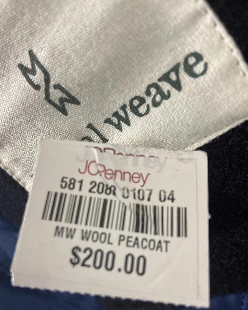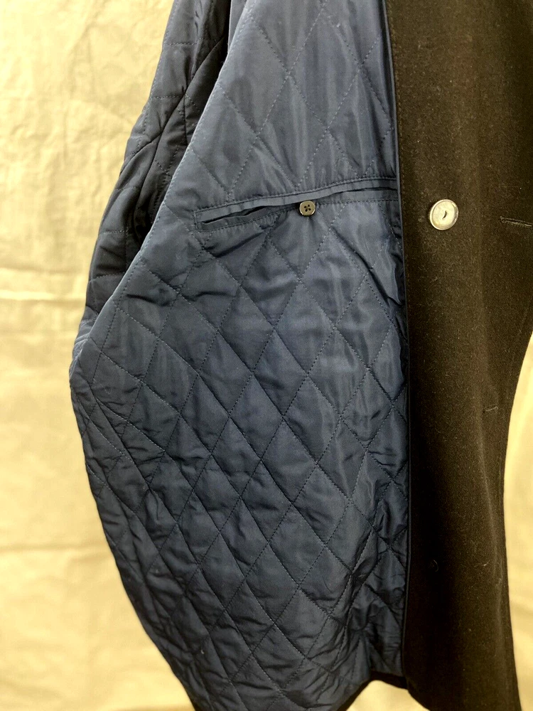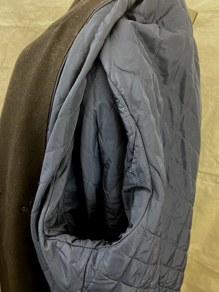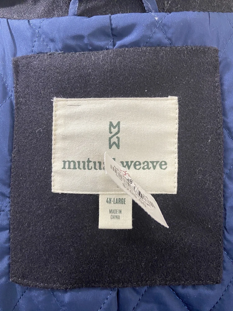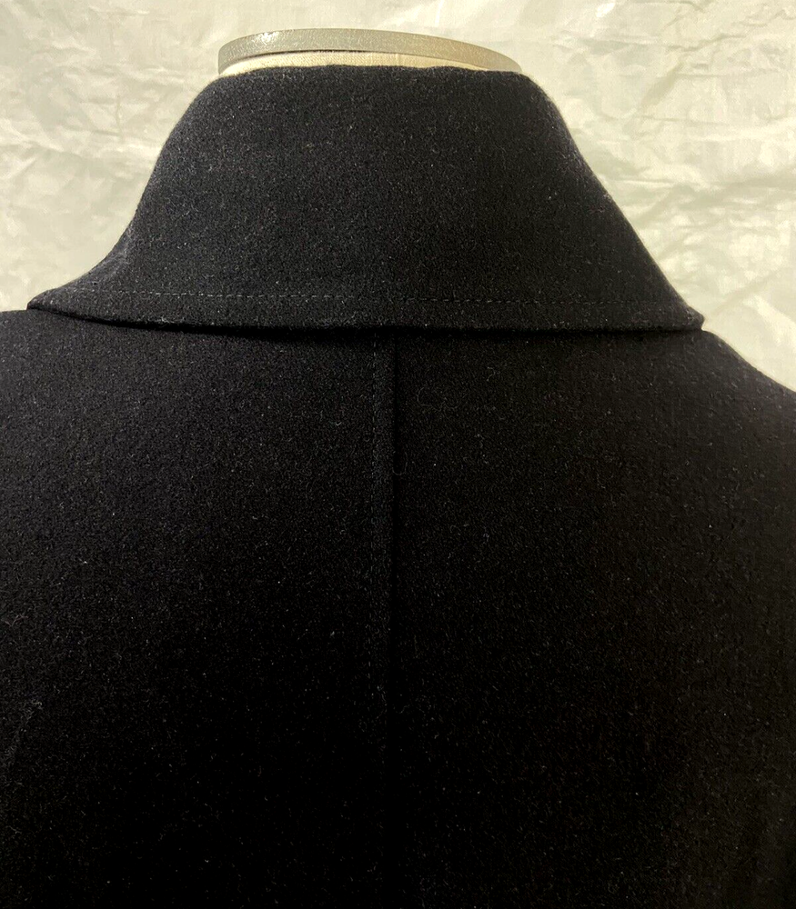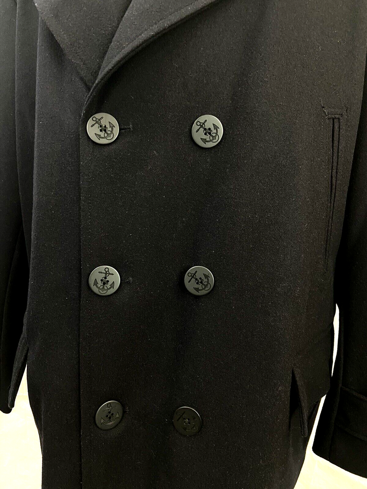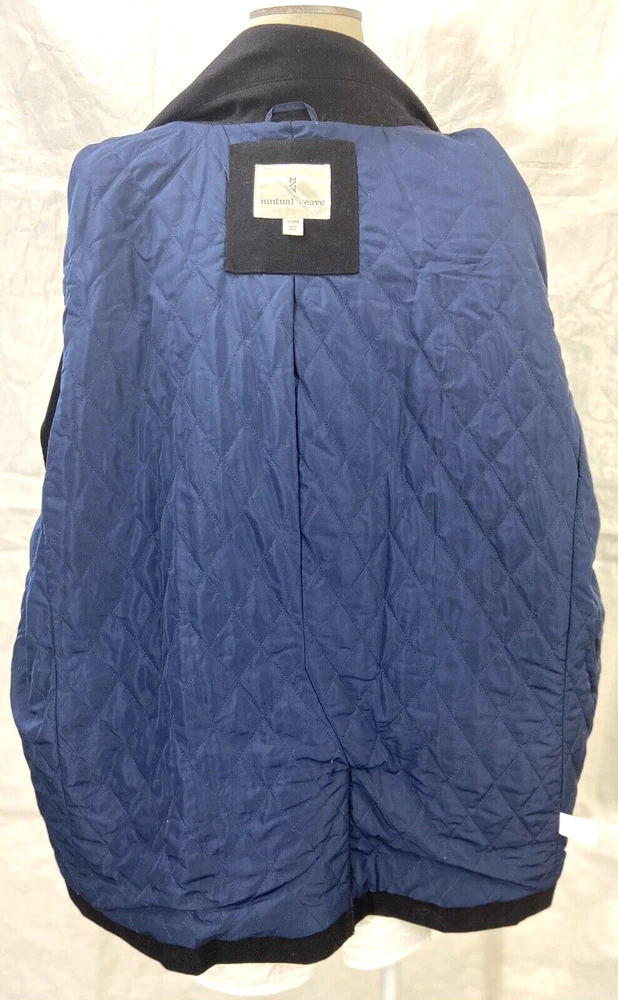 This black wool jacket by Mutual Weave is a classic pea coat style coat with a double-breasted button closure and spread collar. The coat is lined with polyester and has a quilted lining for added warmth. It features inner left pockets, shoulder pads, and pockets for added convenience. The coat is made of a blend of 41% wool, 41% polyester, and 7% acrylic, making it a durable and comfortable choice for any occasion. The coat is available in size 4XL and is suitable for big and tall men. It is suitable for travel, party/cocktail, casual, and business occasions. The coat has a mid-length and is designed with a solid pattern. The jacket has a chest size of 64 inches and is dry clean only. This designer pea coat is perfect for anyone who wants a classic and timeless piece in their wardrobe. Men's Double Breasted Bib Pea Coat Black Wool Jacket Overcoat 4XL Mutual Weave Mutual Weave Men's Black Double Breasted Peacoat Size 4XL New with tags. 41% Wool 41% Polyester 7% Acrylic Lining and filling - 100% Polyester Dry Clean Blue Lining Anchor Imprint on buttons Inside Left pocket Front slash pockets Great looking coat! MSRP $200 Measurements (measured with garment lying flat) Chest: 32" Shoulder to Shoulder: 22 1/2 inches Shoulder seam to Cuff (hem): 27 3/4 inches Length (measured from bottom of collar in back to hem): 33 inches Item # C2088.1 Comes from a smoke-free, pet-free environment. Returns will be accepted in original, unused, unworn condition, as described in this listing. Colors may appear to vary, depending on computer/phone screen. Thank you for viewing our product! Please visit our store to see all of our listings.