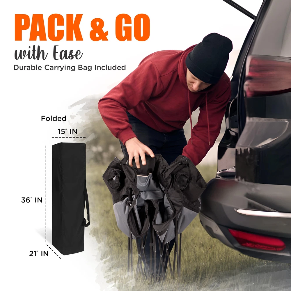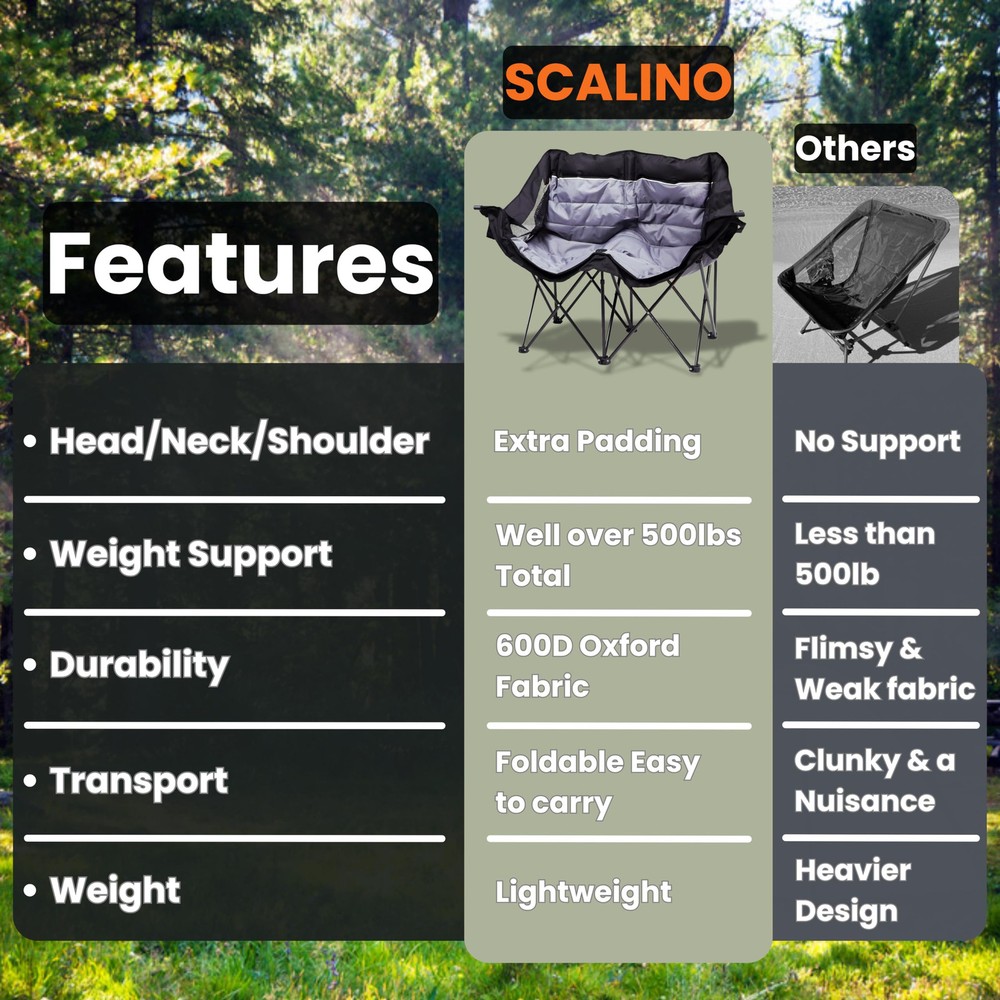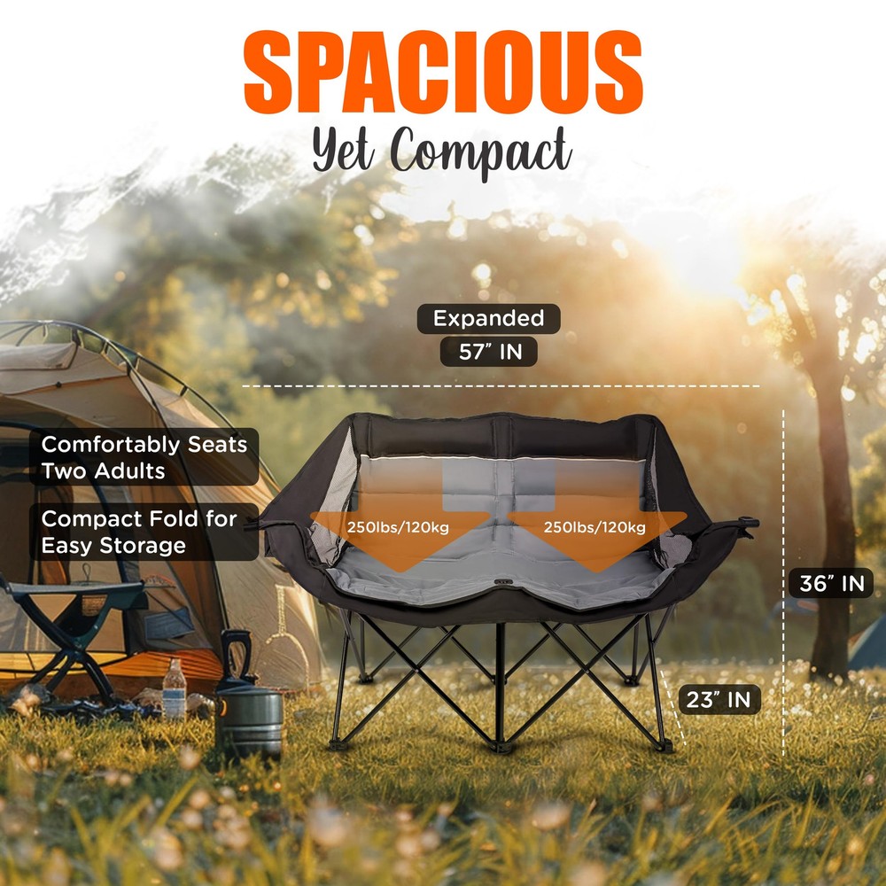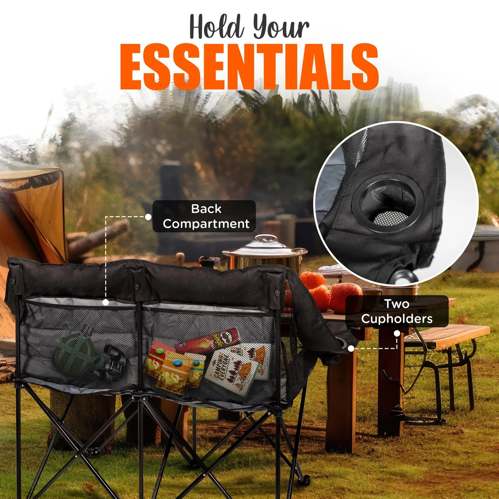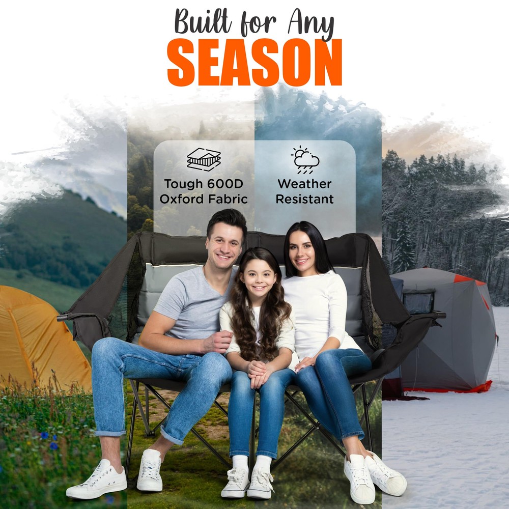 Upgrade your outdoor adventures with the ultimate comfort of the Two Person Camping Chair, a must-have for anyone seeking a spacious and durable seating solution. This love seat camping chair is designed for two, offering plenty of room to relax and enjoy your time in nature. With extra padding in the head and neck areas, it’s one of the most comfortable camping chairs for adults, perfect for lounging around the campfire or cheering at a sporting event. Whether you're camping, tailgating, or just hanging out in the backyard, this chair provides unmatched comfort and convenience. Built to withstand the demands of outdoor life, this oversized camping chair is made from tough 600D oxford fabric and can support up to 500 lbs. Its heavy-duty construction makes it one of the most durable large camping chairs available. The added bonus of a built-in cup holder means your drink is always within easy reach, making it an essential part of your gear, whether you're at a campsite or on the sidelines. It's one of the top choices for those looking for sport chairs for adults foldable and ready to go wherever your adventures take you. Convenience is key, and this folding loveseat doesn't disappoint. It folds up quickly into the included carry bag, so you can transport it effortlessly from one adventure to the next. Whether you're looking for a double lawn chair for your backyard or need an easy-to-carry solution for tailgating, this double seat camping chair delivers. The extra back pocket allows you to store small essentials, keeping everything within reach while you relax. Offering luxury and practicality, this chair is perfect for couples, friends, or anyone who wants to upgrade their outdoor seating experience. As one of the best luxury camping chairs, it combines both comfort and convenience, making it an essential item for any outdoor enthusiast. Whether you need a sturdy oversized folding chair for camping or one of the most versatile sideline chairs for adults, this double chair ensures you'll always have the best seat in the house. EXTRA PADDING - Enjoy extra comfort with reinforced padding in the head and neck area with the loveseat camping chair, perfect for lounging by the campfire or watching the sunset with loved ones, making your outdoor experience even more enjoyable. BUILT TO LAST - Enjoy outdoor relaxation with this heavy-duty double folding chair. Crafted from durable 600D oxford fabric, it effortlessly supports over 500lbs (240kg), ensuring lasting comfort and enjoyment. KEEP YOUR DRINK HANDY - With a built-in cup holder, the 2 person camping chair ensures your favorite beverage is always within arm's reach, making it easy to stay refreshed and hydrated throughout the day while enjoying nature. EASY PACK-UP - The camp couch includes a convenient bag for storing and transporting the chair, so you can move from one adventure to the next without hassle, ensuring you always have a comfortable seat wherever you go. STORAGE COMPARTMENT - An extra storage compartment in the back of the double chair offers convenient space for your essentials, keeping them close at hand and organized, so you can easily access snacks, gadgets, or personal items.