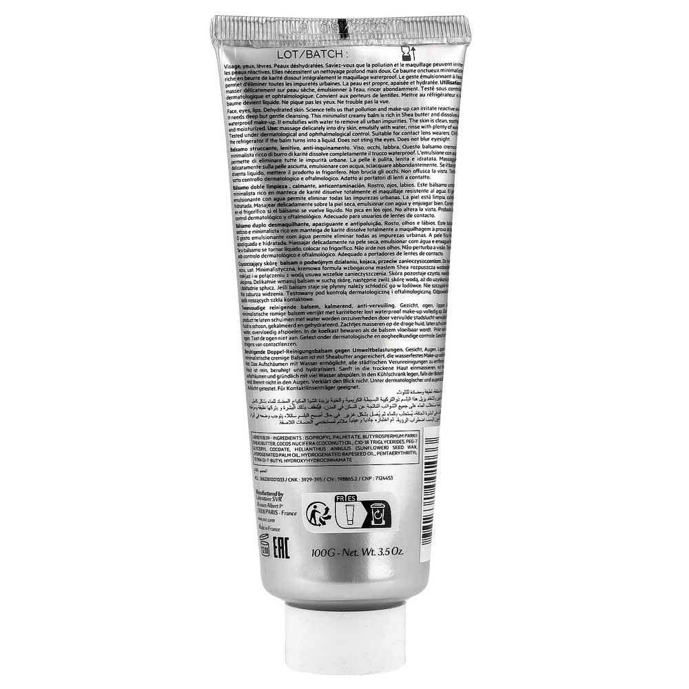 9 Ingredients Soothing, Anti-Pollution Intolerant, Reactive Skin Fragrance Free Waterproof Makeup Tested Under Dermatological and Ophthalmological Control Suitable for Contact Lens Wearers Does Not Sting the Eyes Does not Blue Eyesight Face, eyes, lips. Dehydrated skin. Science tells us that pollution and make-up can irritate reactive skin. It needs deep but gentle cleaning. This minimalist creamy balm is rich in Shea butter and dissolves all waterproof makeup. It emulsifies with water to remove all urban impurities. The skin is clean, soothes and moisturized. Our eBay Store About Us Contact Us Add to Favorite Sellers Expiration Date: 09/01/2027 Disclaimer: Our receiving department does its best to verify and then enter the correct expiration dates for all incoming products. However, discrepancies do occur from time to time. This being said, the exceptionally high turnover at iHerb ensures that our inventory is among the freshest in the industry. SVR, Double Cleansing Balm, 3.5 oz (100 g) DESCRIPTION: 9 Ingredients Soothing, Anti-Pollution Intolerant, Reactive Skin Fragrance Free Waterproof Makeup Tested Under Dermatological and Ophthalmological Control Suitable for Contact Lens Wearers Does Not Sting the Eyes Does not Blue Eyesight Face, eyes, lips. Dehydrated skin. Science tells us that pollution and make-up can irritate reactive skin. It needs deep but gentle cleaning. This minimalist creamy balm is rich in Shea butter and dissolves all waterproof makeup. It emulsifies with water to remove all urban impurities. The skin is clean, soothes and moisturized. SUGGESTED USE: Massage delicately into dry skin, emulsify with water, rinse with plenty of water. Chill in the refrigerator if the balm turns into liquid. INGREDIENTS: Isopropyl palmitate, butyrospermum parkii (shea) butter, cocos nucifera (coconut) oil, c10-18 triglycerides, peg-7 glyceryl cocoate, helianthus annuus (sunflower) seed wax, hydrogenated palm oil, hydrogenated rapeseed oil, pentaerythrityl tetra-di-t-butyl hydroxyhydrocinnamate. WARNINGS: