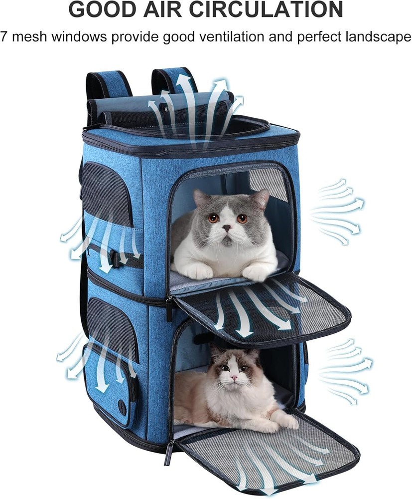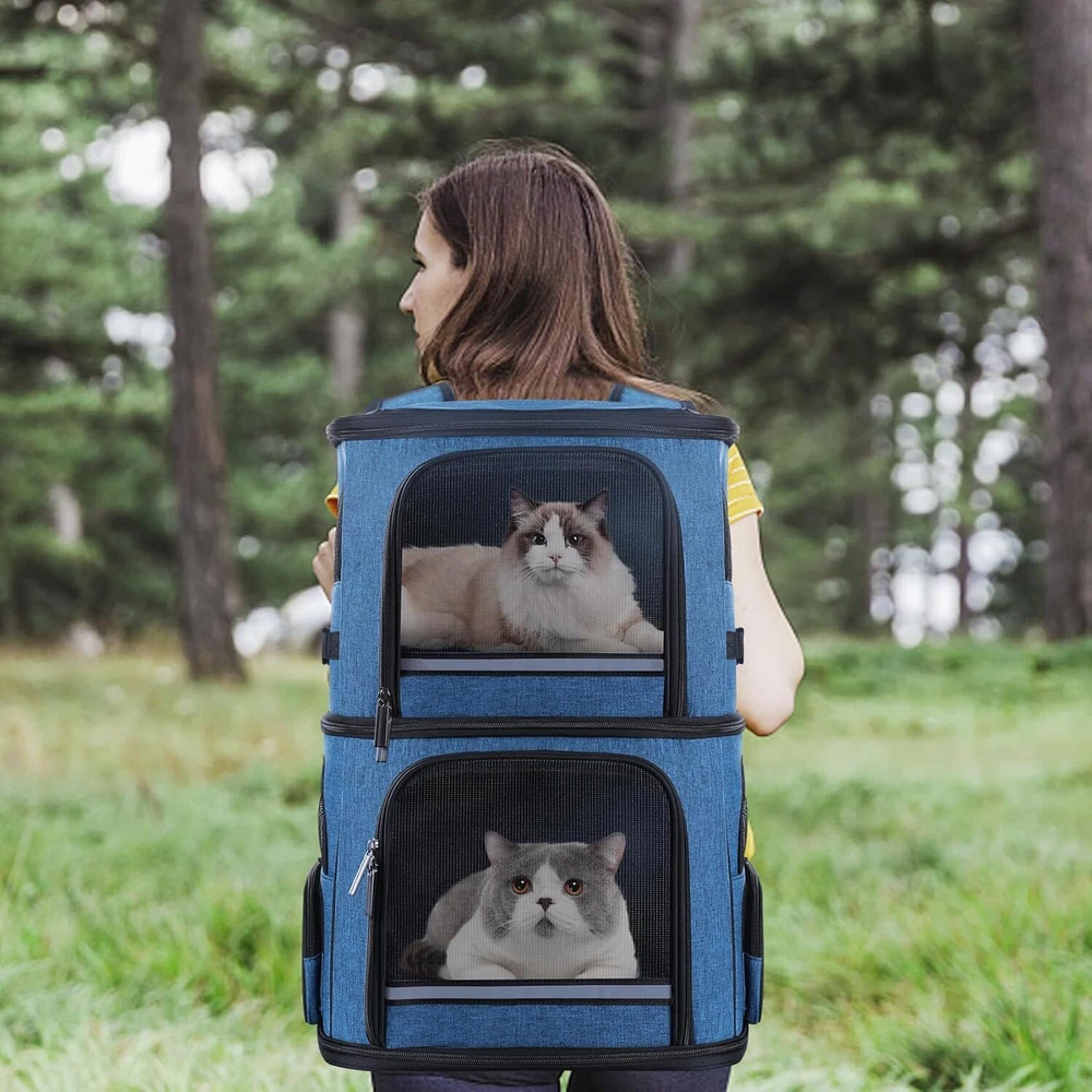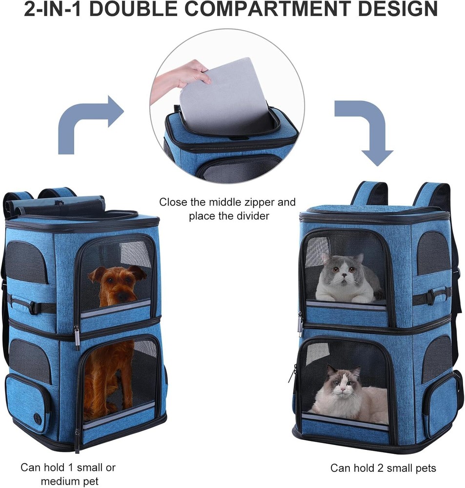15.0"L x 11.5"W x 22.0"H Polyester Cat Backpack Core Parameters Material: Polyester Size: 15.0"L x 11.5"W x 22.0"H Color: Blue Technical Specifications • DUAL CAT BACKPACK CARRIER DIMENSION: The Grey Colour of 2 in 1 Double Compartment Cat Backpack Carrier Perfect for 2 Pet up to 12 Pounds Each Pet( Single Compartment Pet Backpack Dimension 15" L x 11.5" W x 11"H ),or Single Medium/Large Pet Up to 24 Pounds( 2 in 1 Cat Backpack Expand Dimension 15" L x 11.5" W x 22"H ) • STRONG QUALITY: The Discreet Dual Portable Cat Carrier Backpack for Two Cats Made with 600D High Quality Standard Oxford Material,Easy to Clean,Lightweight and Tidy,The Pet Carrier Backpack With Strong Structure And Enough Activity Space for Puppies / Cat / Dogs / Chihuahua • HUMANIZED DESIGN:The Double Compartment Dog Backpack Carrier With 7 Well Breatable Mesh Window Ventilation Design,2 Pocket Storage,Perfect for Airflow and Nice Vision,Comfortable Floor Lining Mattress,Great for Rest And Relaxation. • SAFTY AND COMFORTABLE: The Pet Carrier Backpack With Two Prominently Reflective Stripe Design on The Straps,Safty for Your Travel While in the Evening • LARGE SPACE:Suitable for 2 Cats or for one Medium Dogs,Specially Double Compartments Cabin for You Have a Relaxing and Enjoyable Outdoor Experience Package Information Package Dimensions: 15.55"L x 13.3"W x 5.91"H Package Weight: 5.17 Pounds