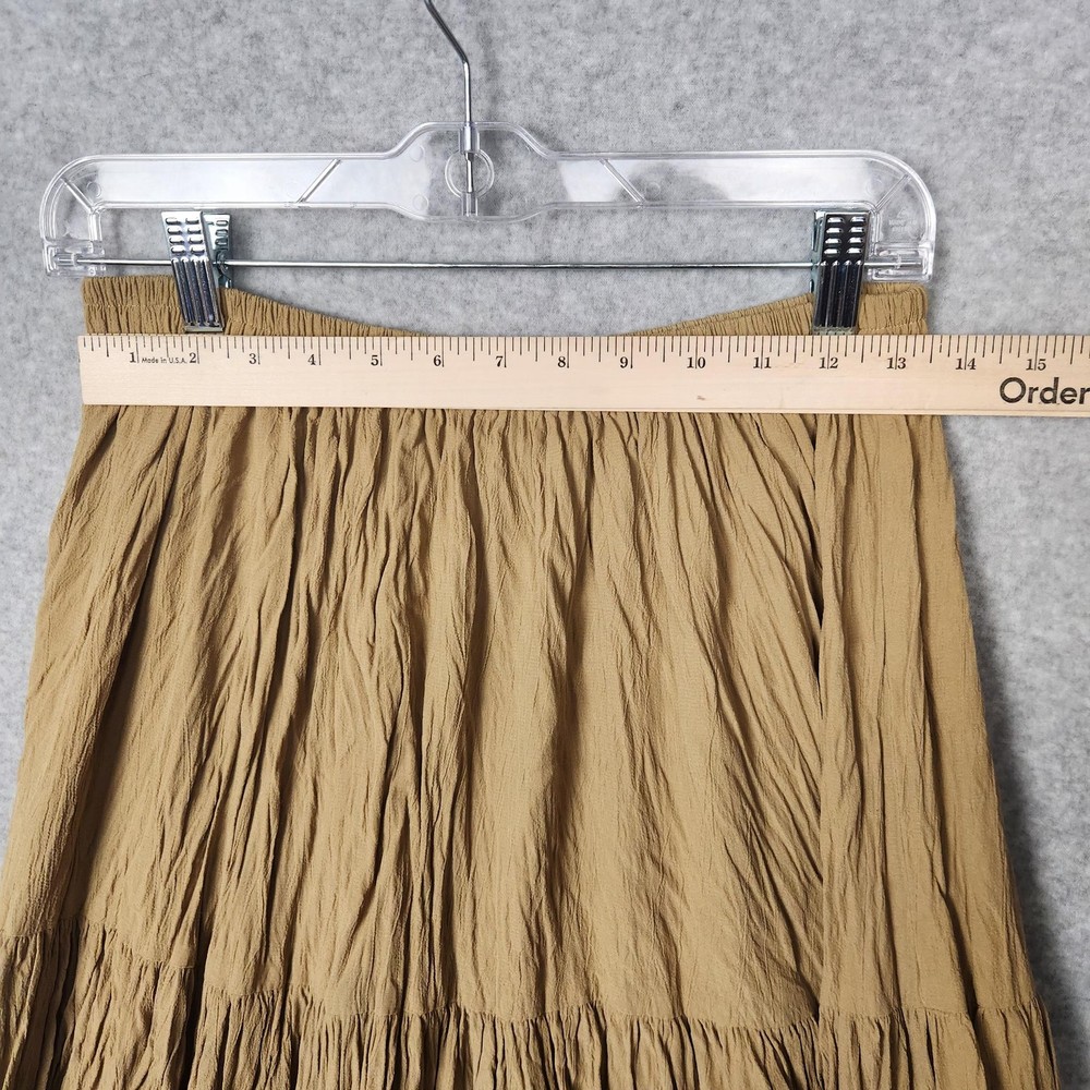 Double D Ranchwear Skirt Womens Medium Brown Tiered Crinkle Maxi Western Boho Condition: Good used condition. Light overall wear throughout, but no visible stains, holes, or major flaws noted. Please review all photos for fullest detail. Features a crinkle texture, tiered panels, and full maxi length silhouette for a western or boho look Wide stretch waistband for comfort and easy pull-on style Color: Brown/tan Handwritten tag marked "1100" included Tag size: Medium (Womens). Approximate flat lay measurements: Waist: 13.5 in across (unstretched), Length: 35 in Double D Ranchwear leather-look logo tag stitched at seam Perfect for western, boho, or festival outfits