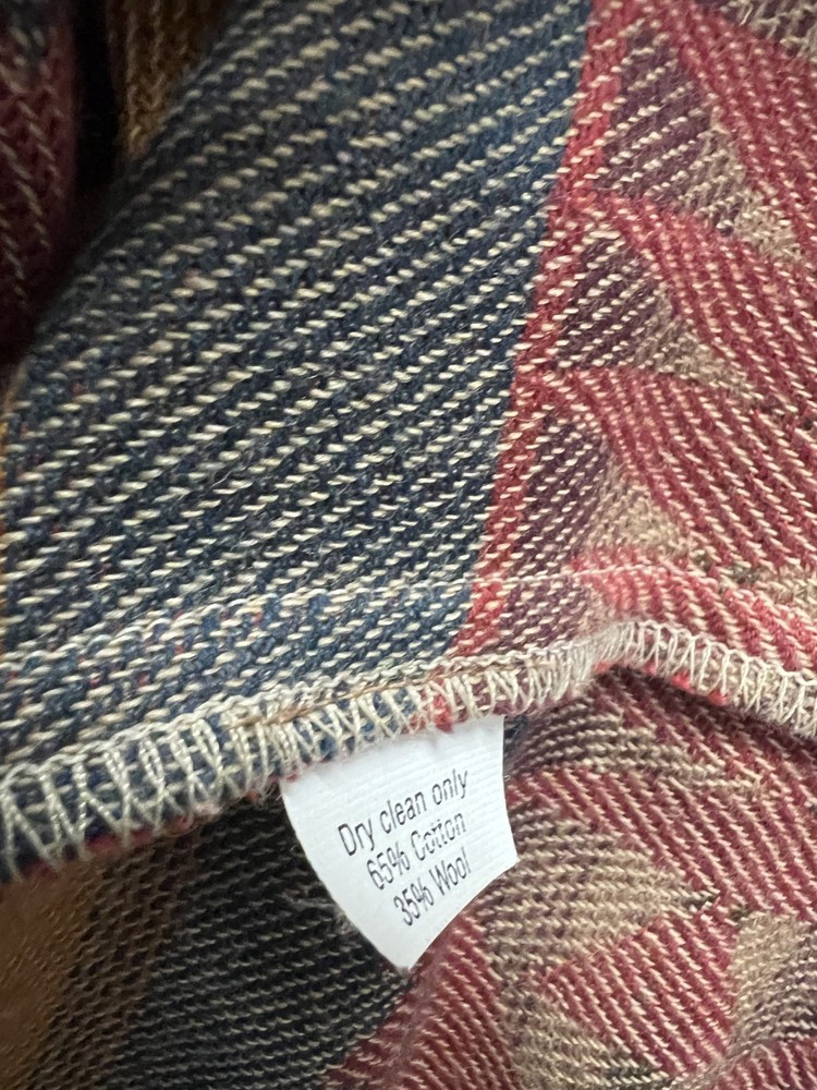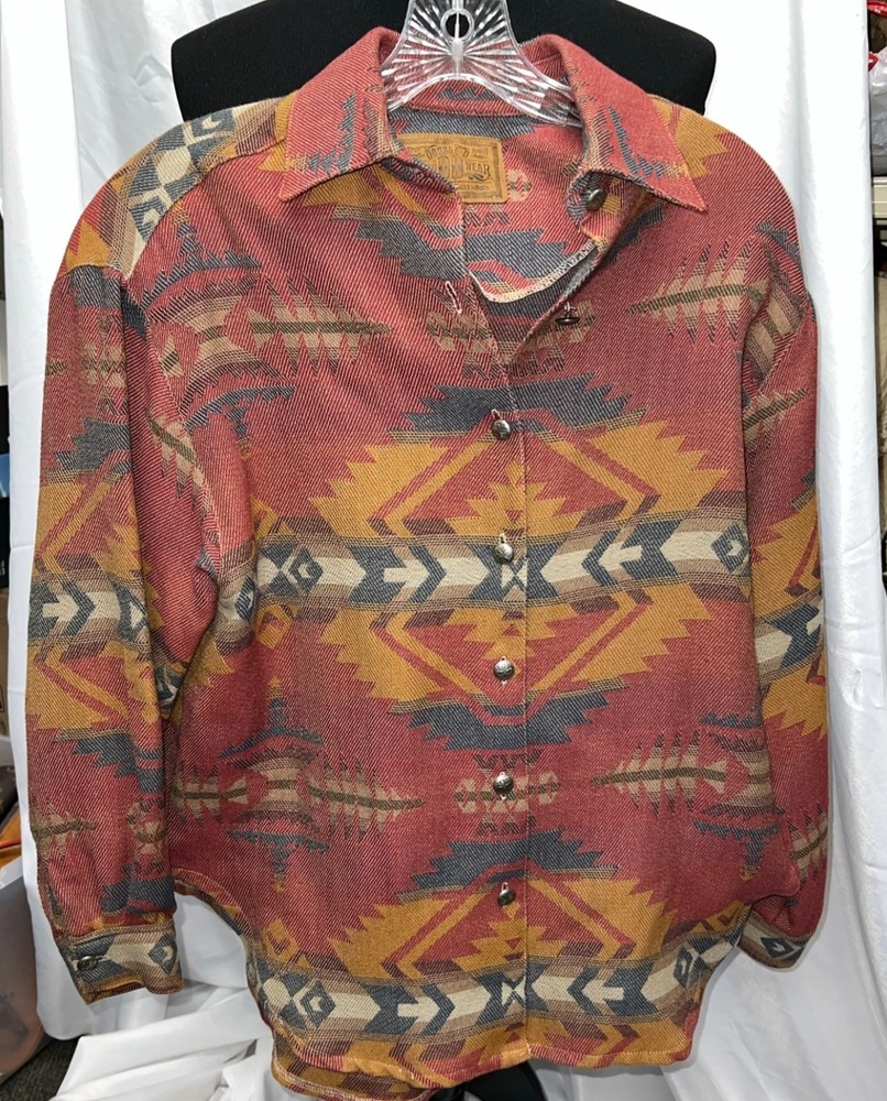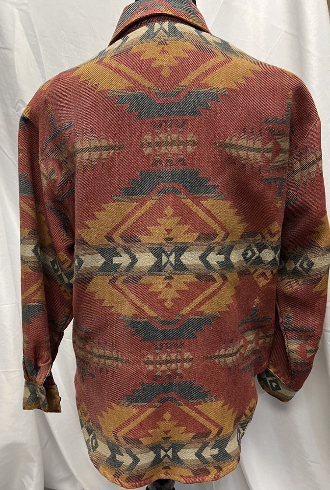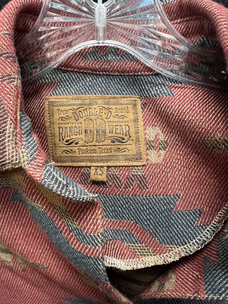 The Double D Ranch Wear Jacket in women's extra small size features a vibrant red Aztec print on a cotton blend outer shell. This vintage-inspired jacket has a geometric pattern with long sleeves and a button closure, making it suitable for both party occasions and casual wear. With a western theme and Southwestern accents, this basic jacket offers a regular fit and is lined with cotton for added comfort. Made in the United States, this stylish piece perfect for the winter, fall, and spring seasons. Approx Measurements Chest at underarm 42" Back neck to hem. 28" Underarm length to hem 10 " Sleeve underarm to cuff 16 "