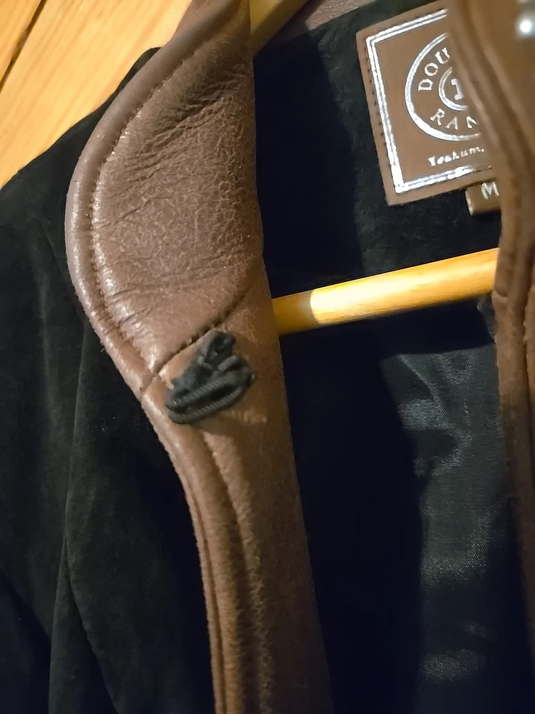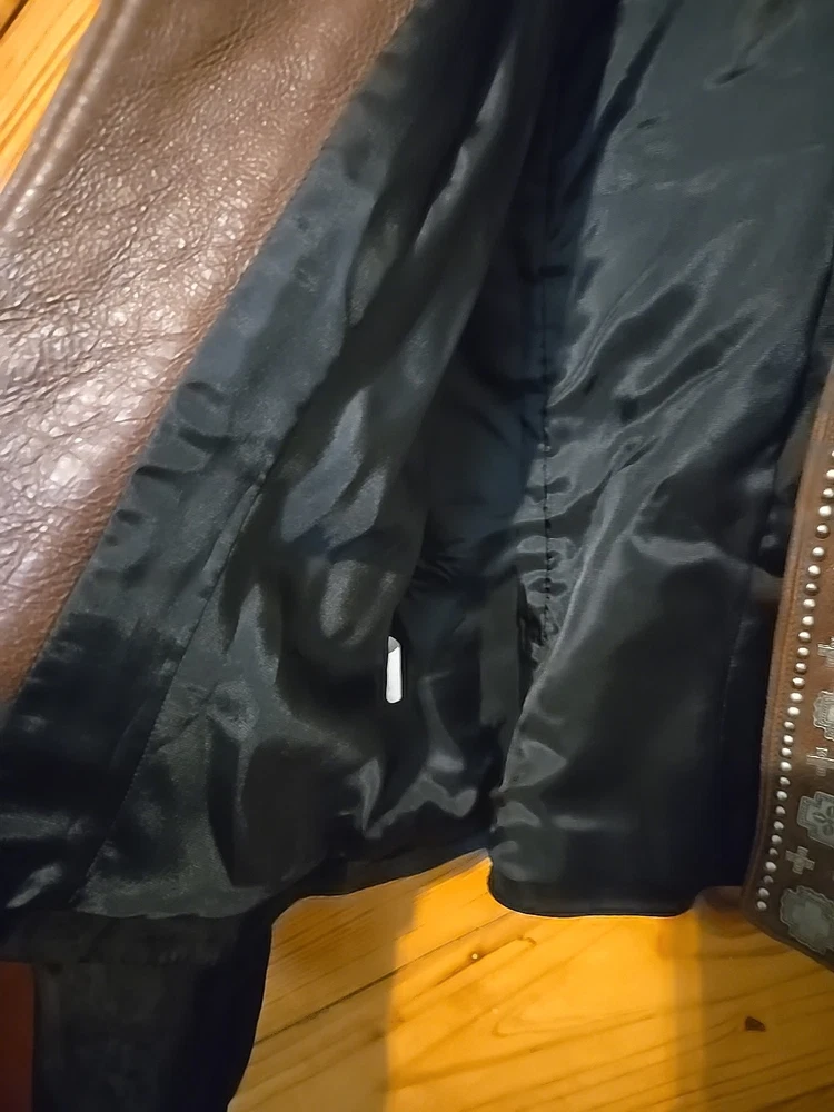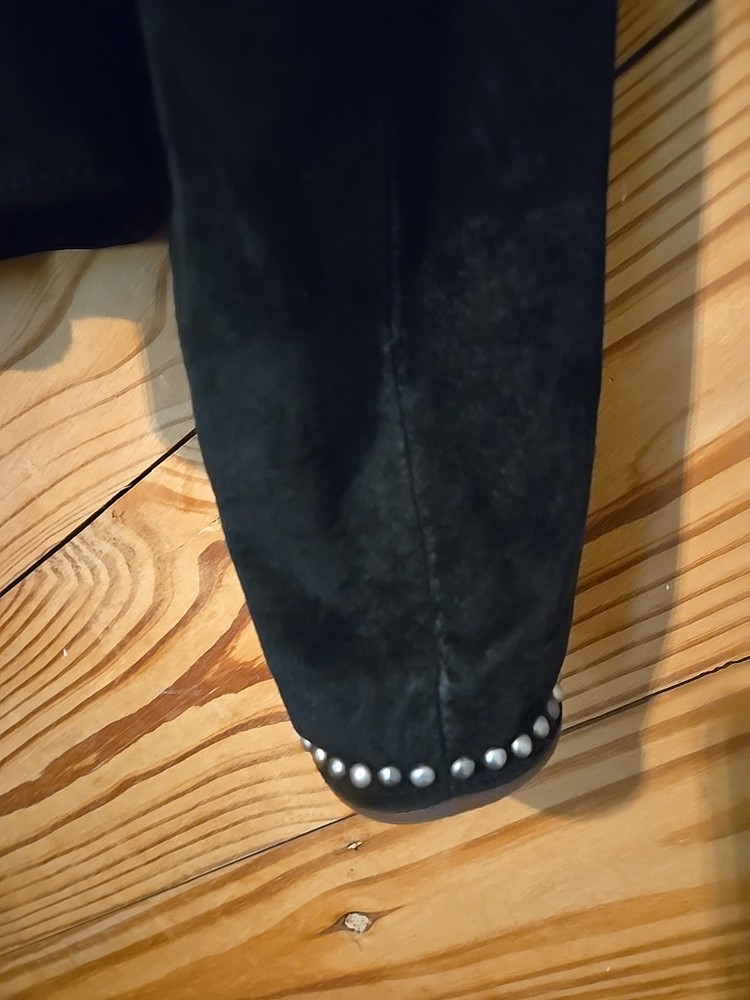 Gently worn, beautiful black suede Leather with brown leather collar and front lining, silver studded with cross silver conchos. Has a toggle closure at neck but otherwise open front. Measures about 17" Shoulder to shoulder Underarm across 17 1/2" Sleeve from shoulder 24 1/2" Back neck to waist hem 22"