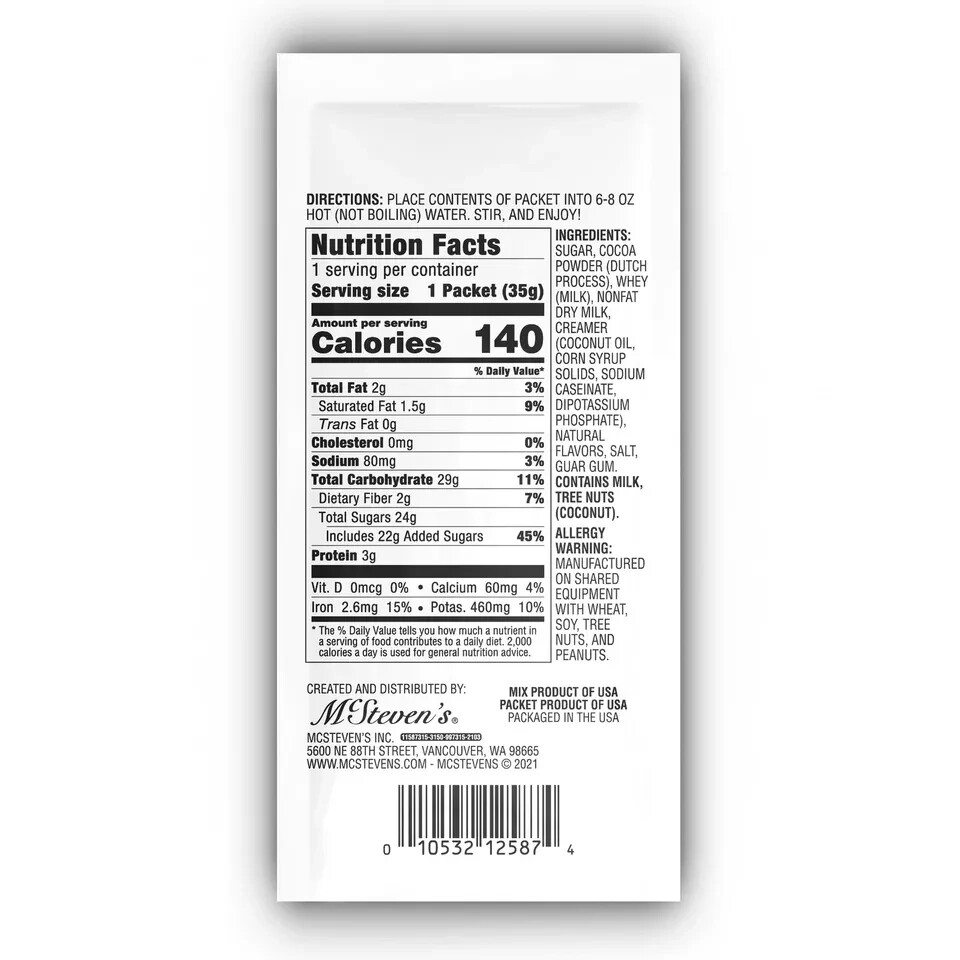 Finally...you can bring joy and delight to your taste buds! Enjoy deliciously flavored hot chocolate to satisfy your sweet and savory cravings! Flavors included: Double Chocolate, Dark Chocolate, and Candy Cane Hot Cocoa. Known for their innovative gourmet products Mc Steven's uses Dutch processed cocoa powder to create an aromatic and soothing hot chocolate mix. The mix is made in the USA. Looking for a unique gift or stocking stuffer? Do you need small gifts for several people like a teacher, mailman, co-worker or friend? Want to give a gift that people will actually like and use? Using this set of hot chocolate packets will save you time because you can break the set up into individual gifts if you want! These hot chocolate packets can be easily placed in a gift bag, divided up as individual gifts, used as stocking stuffers or just to have as extra gifts for friends and family! A delicious and uniquely flavored classic hot chocolate that is the perfect pick me up to satisfy your sweet craving. Set includes two 1.25 ounce packets each of Double Chocolate, Dark Chocolate, and Candy Cane Hot Cocoa. Total of 6 packets. Easy to prepare! Simply place contents into a mug, add 6 ounces of hot water, milk or coffee, stir and enjoy. Each packet contains one serving. Bid farewell to the coffee shop, these gourmet, dairy-infused mixes let you make incredibly decadent cups of hot cocoa right at home. Great for giving a fun and delectable gift that starts with your mouth watering just thinking about it! Save time and cross several names off your gift list with this set because it makes the perfect hot chocolate gift for anyone. You can even break up the set and have five gifts! These individual packets of hot chocolate are ready to give as a gift right away or use as a stocking stuffer. Made in the USA.