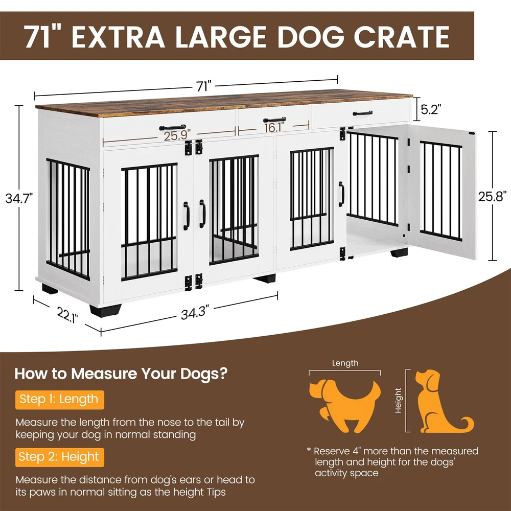 Versatile Dog Crate Furniture: This retro-style dog crate furniture is a perfect blend of functionality and style. It seamlessly fits into various home decor environments and doubles as a TV stand or side table. The design maximizes the use of space in your home while providing a comfortable and spacious living area for your dogs. Farmhouse Furniture Style: Measuring 70.87" L x 22.05" W x 34.65" H, this piece is adopt for large/medium-sized dogs, offering ample living space. The design is characterized by barn doors and bracket accents, merging modern and casual elements with a minimalist aesthetic that complements a wide array of interior designs. 2-in-1 Dog Crate with Removable Divider: Designed with the diverse needs of different dogs in mind, this wooden dog crate includes a removable middle divider. This allows you to create two separate spaces for individual privacy or remove the divider to form one large enclosure, facilitating interaction between your pets. Ample Storage with 3 Drawers: Featuring 3 spacious drawers, the upper section of this indoor dog keneel is perfect for organizing dog food, treats, leashes, and other essentials. The extensive top surface provides additional space to display plants, magazines, picture frames, or a night light, adding a personal touch to your living space. Robust Construction: The dog crate is meticulously crafted from high-quality P2 grade MDF board and reinforced with 0.8-inch thick steel pipes. The strong frame is built to endure active pets, ensuring a secure environment for your dogs. It efficiently supports up to 200 lbs inside and an additional 250 lbs on the top, accommodating both your pets’ needs and household items. Easy Assembly: The package includes a detailed instruction manual and an accessory bag. Each part is pre-numbered and pre-drilled, allowing for straightforward individual assembly. Simply follow the step-by-step guide to effortlessly set up the pet furniture. Payment Delivery details Terms of sales About us Contact us Payment We accept payment either via PayPal or any of the following credit cards; Visa, MasterCard, Discover, and American Express. Wishing you a happy life! Delivery details We will provide you with the tracking number on the same day or the next day, and transport your package through UPS, DHL, FedEx and other courier methods. If you have any questions, please feel free to contact me and I will do my best to help you solve the problem. Wishing you a happy life! Terms of sales We offer a one month free return and exchange service, and you don't have to bear any losses. We will provide multiple solutions for you to choose from. If you have any questions, please feel free to contact me and I will do my best to help you solve them. We offer a two-year warranty period. If you have any quality issues with the product you purchased within two years, please feel free to contact me. I will provide you with a free replacement service. If you have any questions, please feel free to contact me. I will do my best to help you solve the problem. Wishing you a happy life! About us We are committed to becoming the best eBay seller, with high-quality suppliers, providing the most sincere service, including pre-sales and after-sales service, to give you a satisfactory shopping experience. If you have any questions, please feel free to contact me, and I will do my best to help you solve the problem. Wishing you a happy life! Contact us If you encounter any problems, please contact me by email at the first time, I will provide you with a solution as fast as possible so that I can give you a satisfactory shopping experience, wish you a happy life! Dog Size L Type Double Cage Material Wood, Metal Product Dimensions 71"L x 22.1"W x 34.7"H Brand GRVEE
