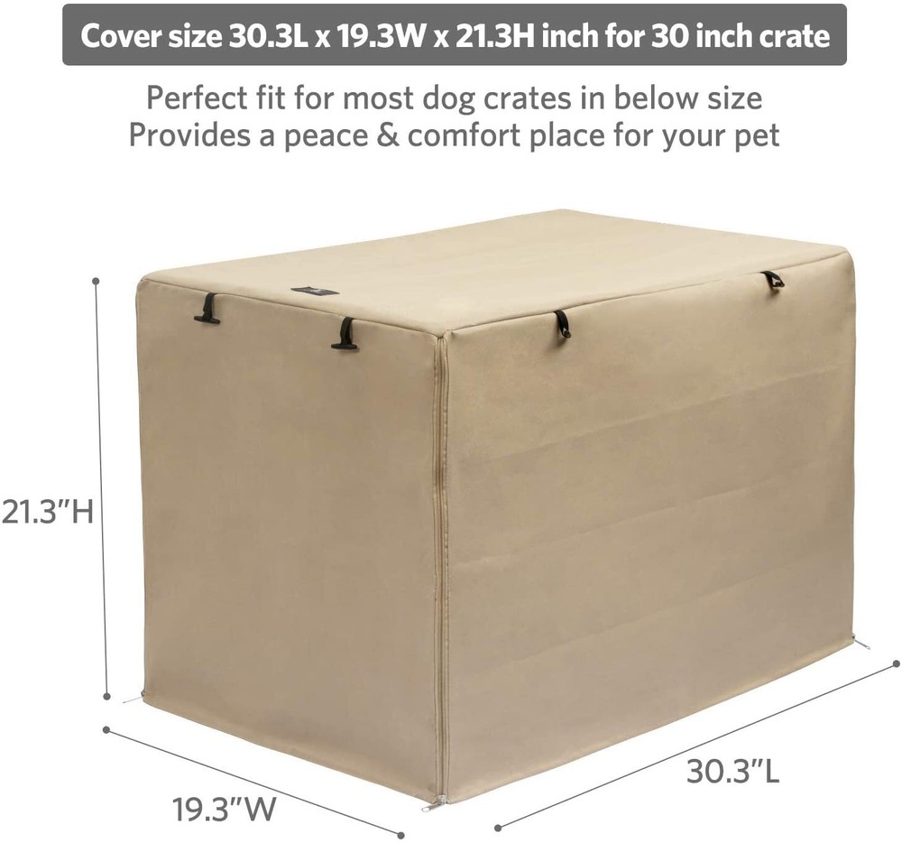 【Dimension】: 30”(L)x 19” (W)x 21”(H). Universal fits your 30" crate well.Package included 1 x crate cover (without metal crate) 【Quiet, Privacy& Security】The crate cover can provide pets with a quiet, private and relaxing environment, allowing them to rest better in this comfortable environment 【Heavy-Duty & Durable Material】Durable dog kennel cover made of tear resistant and water resistant 600D polyester with PVC coating,which is windproof and durable, prevent damage caused by pet scratching 【Multiple Zippered Panels】Fits for door open at different angles, you can choose the angle of opening the door according to your needs, which is convenient for pets to enter and exit, and better ensure ventilation 【Easy to Use】Velcro and toggle lock can fix the roller blinds very well, easy to use, and the cover can be folded when not in use for easy storage