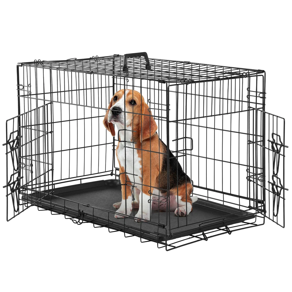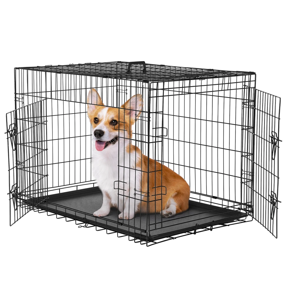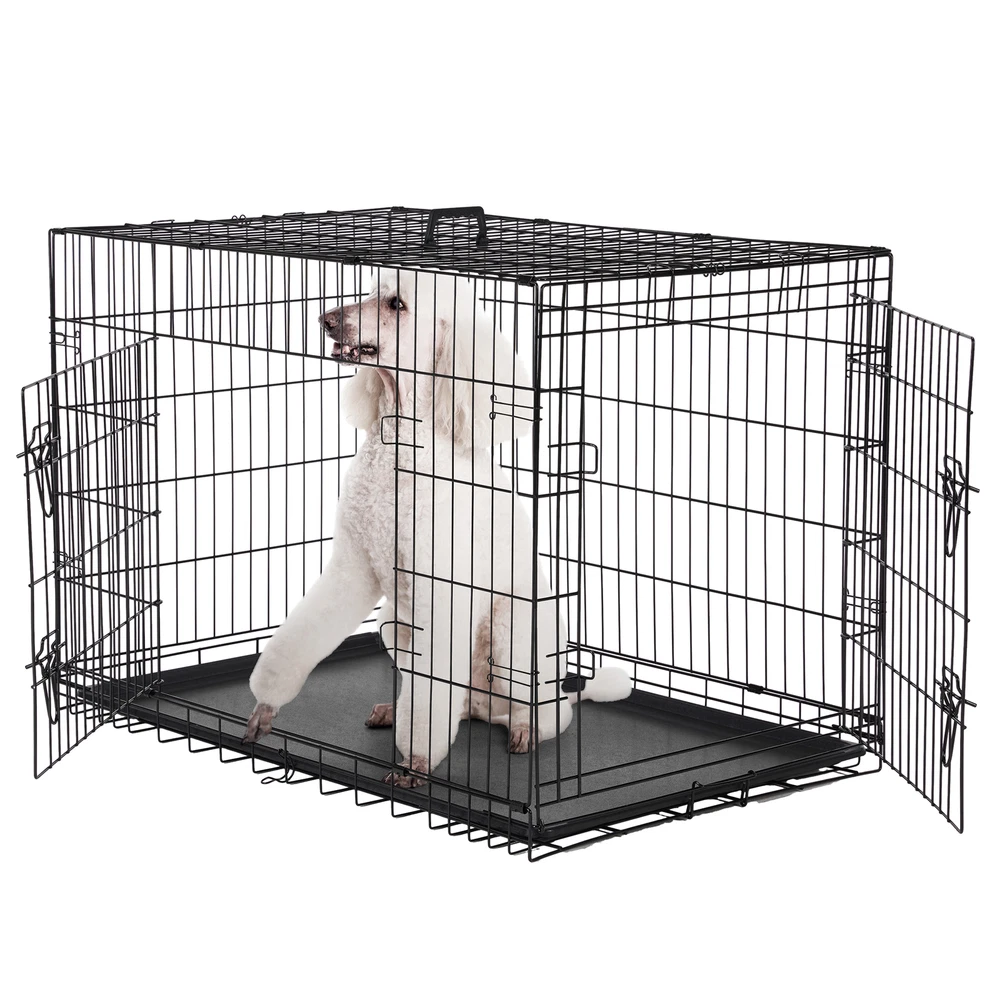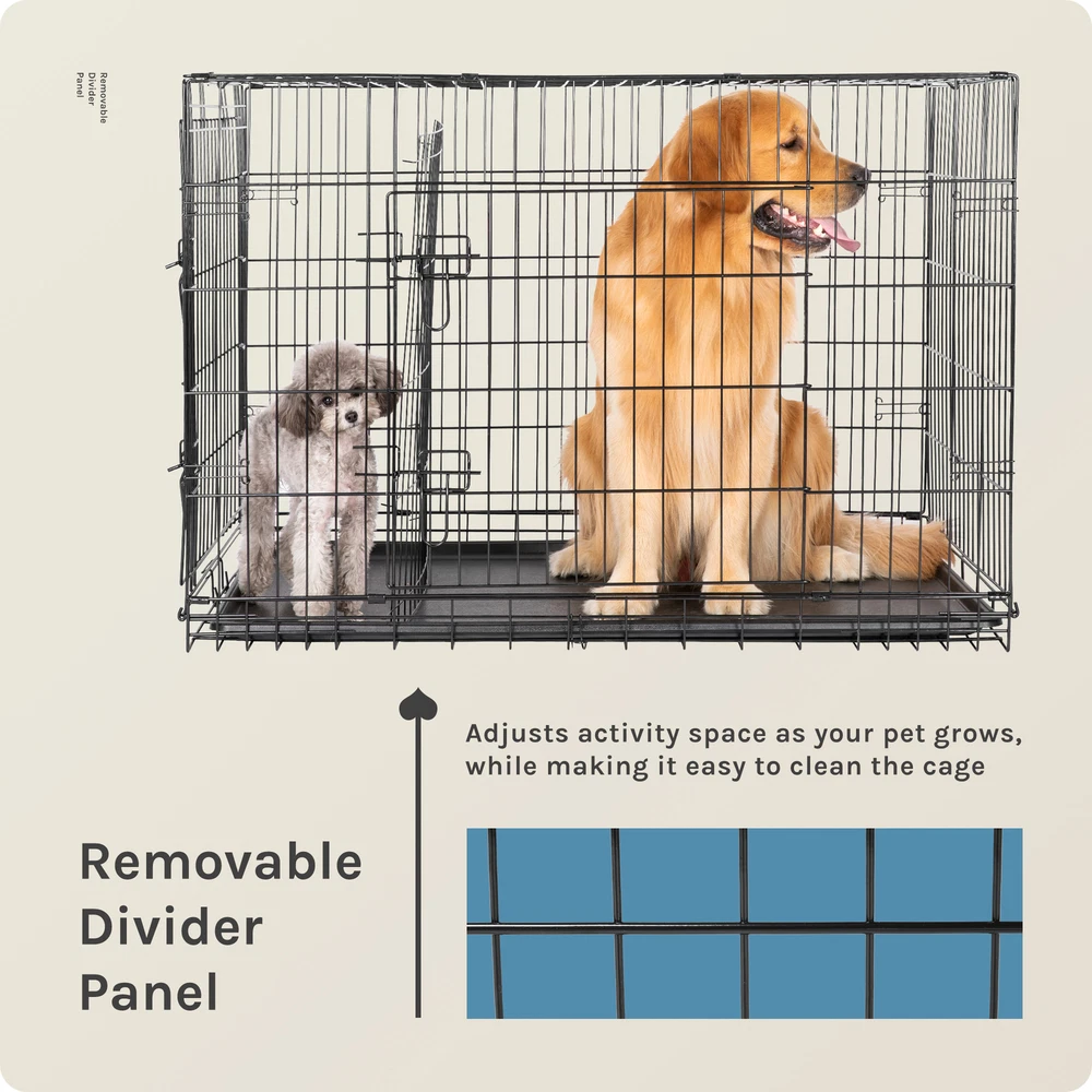 1. Spacious and adjustable: This double door dog cage comes with a divider panel that allows you to customize the size of the interior space to accommodate your dog's needs as they grow. The spacious design provides ample room for your pet to move around comfortably. 2. Durable construction: Made of folding metal wire, this pet kennel is sturdy and long-lasting, ensuring the safety and security of your furry friend. The durable materials provide a secure environment for your pet, whether indoors, outdoors, or during travel. 3. Easy access and versatility: The double door design of the dog cage allows for convenient access to your pet from multiple sides, making it easy to place or remove your dog from the kennel. The versatile design is suitable for a variety of environments and situations. 4. Leak-proof pan tray: The plastic leak-proof pan tray at the bottom of the cage helps contain any messes or accidents, making clean-up quick and easy. The tray can be easily removed and cleaned for added convenience. 5. Foldable and portable: The folding design of this metal wire pet kennel makes it easy to set up, take down, and transport. Whether you're using it at home, in the yard, or on the go, this dog cage provides a secure and comfortable space for your pet.