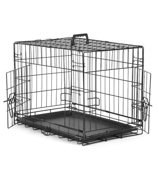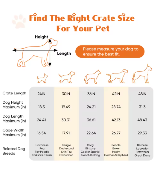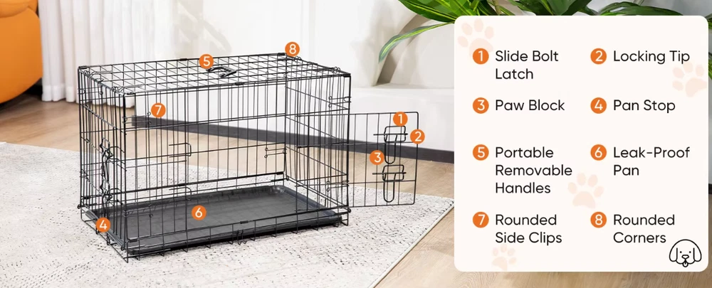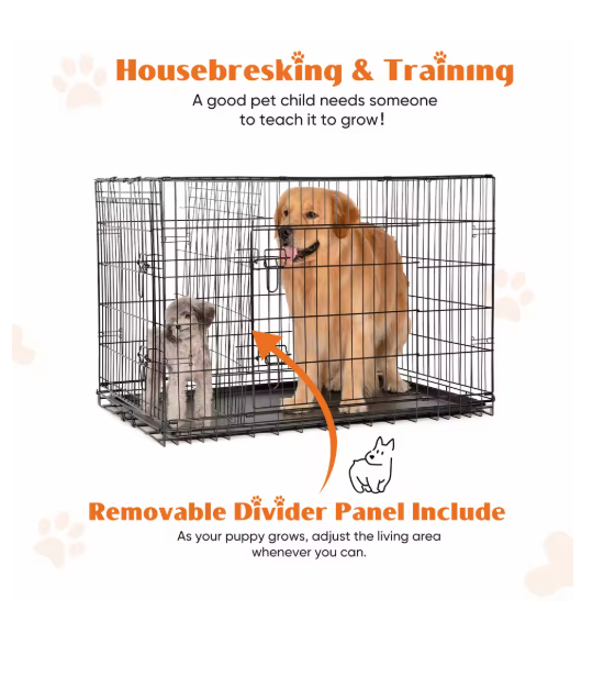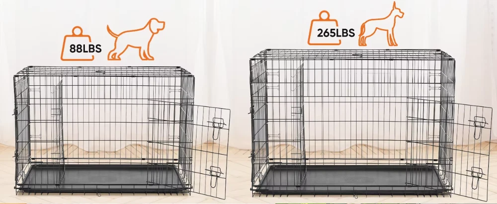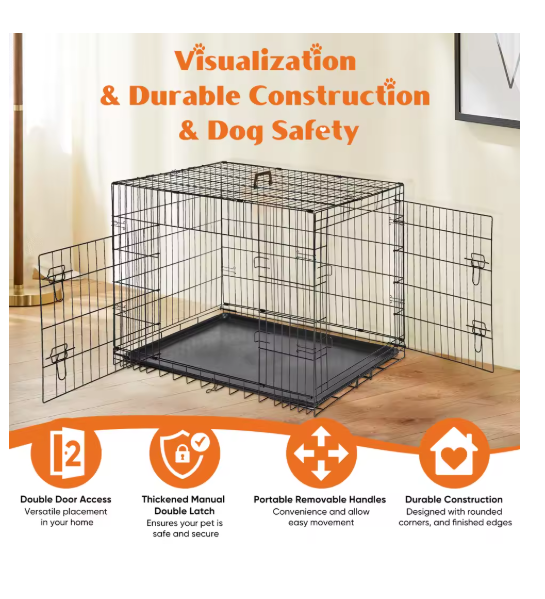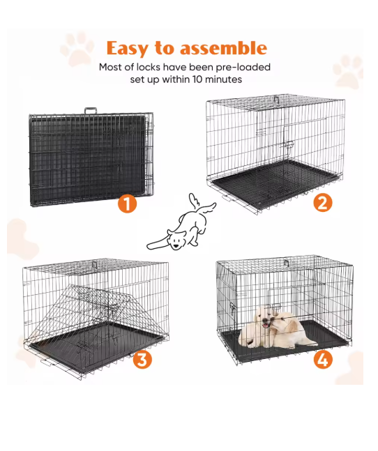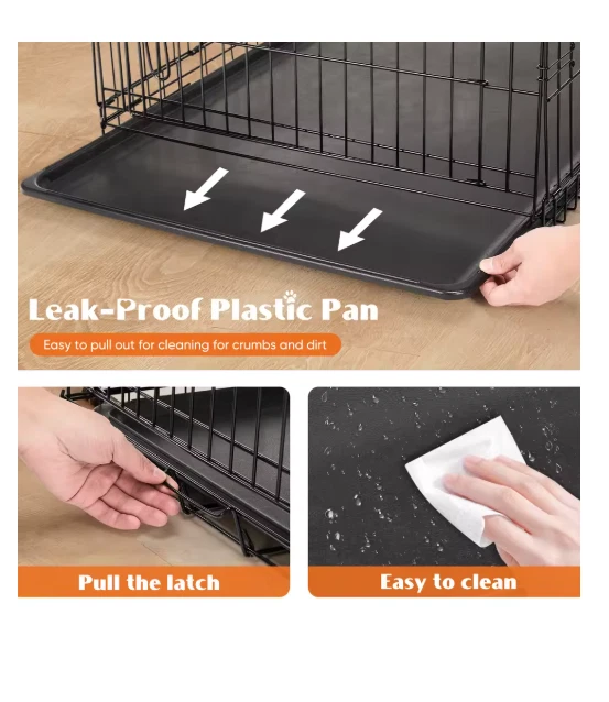 Double Door Folding Metal Wire Dog Cage with Plastic Leak-Proof Pan Tray Extra Large Pet Kennel for Indoor Outdoor Travel ENHANCED SECURITY : With rounded edges, smooth rounded corners and matching accessories, our dog crates prioritize safety. Thick metal mesh and double doors with 2 heavy-duty sliding bolt locks not only prevent your dog from escaping, but also provide optimal protection for your pet. DURABLE : Our dog crates are made of high quality materials for durability. The sturdy construction ensures that it stands up to wear and tear, making it a reliable choice for long-term use. The double door (one door on the front and one on the side) design feature also makes it easy to place and use in any space. EASY TO CARRY : Our dog crate is collapsible, giving you the flexibility to take it with you wherever you go. Folded for space-saving, easy storage, it's perfect for traveling, camping, or any on-the-go adventures with your furry friend. MAXIMUM COMFORT : The spacious interior of our dog crate ensures that your pet feels comfortable and secure. The open, breathable design promotes air circulation, and the dividers help with dog training and create a comfortable environment for your pet to relax. EASY TO CLEAN AND MAINTAIN : Our dog crate features a durable, leak-proof ABS composite tray that is easy to clean and maintain. It resists stains, warping, corrosion, and odors, ensuring a hygienic and comfortable environment for your pet.