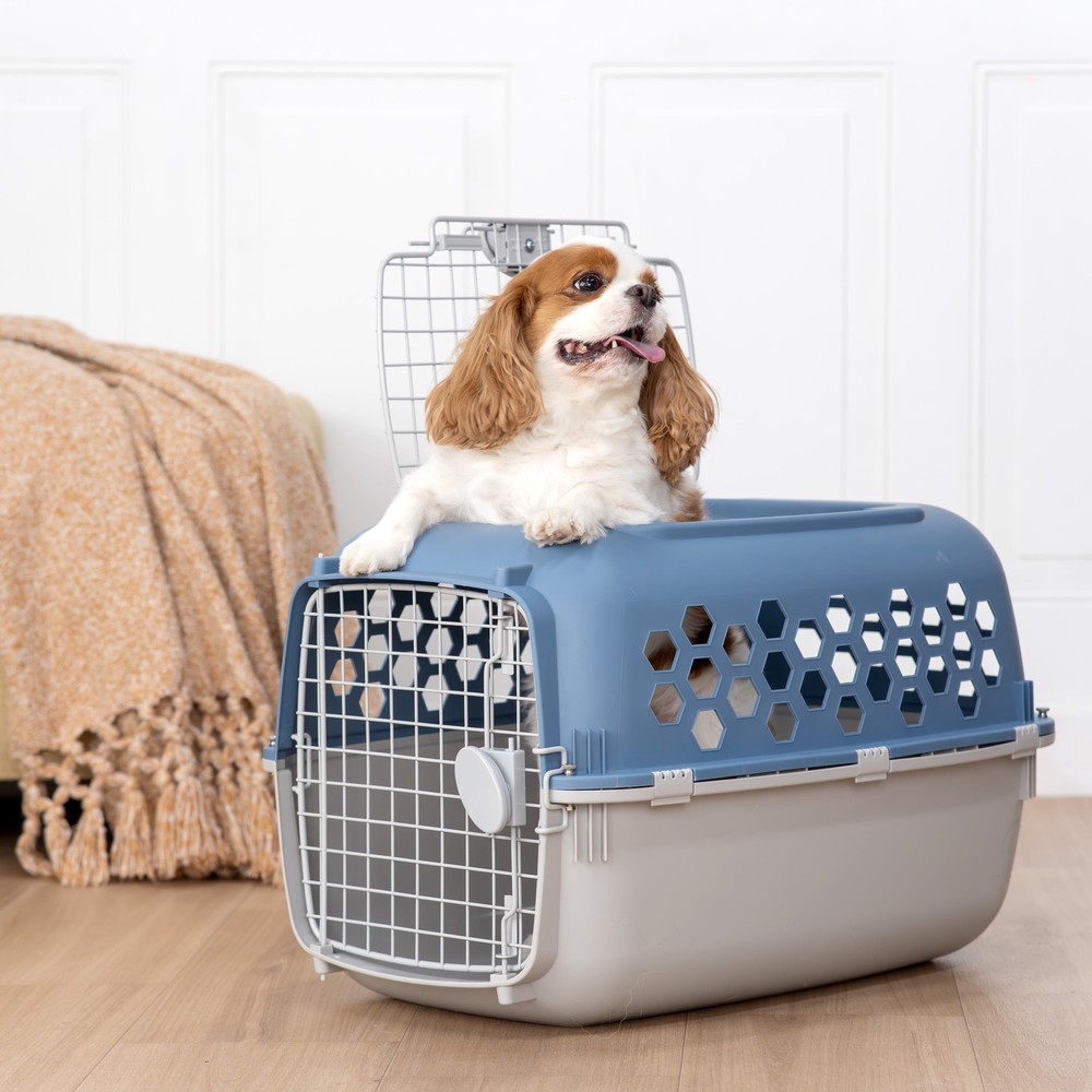 The Multi-Colored 24-inch Plastic Pet Kennel gives your pet comfort and security. This versatile kennel offers both a front load entrance and a top door entrance for convenient loading and unloading of your dog or cat. This kennel is made from durable heavy-duty plastic and steel wire. Our kennel is perfect for traveling, vet appointments, or house training your new pet. The ventilated features allow for a steady fresh air flow to keep your pet safe, as well as allow visibility to your pet while in the kennel. Double Door Dog and Cat Kennel with Top Opening, Multicolor, 24 in Features a neutral blue top with a gray top handle and additional opening, gray lower section, and steel wire This kennel is sturdy and durable and made for pets up to 30 lbs Features a two-door entry, with an extra door on top for the extra convenience of loading and unloading your pet The veterinarian recommended top load door is the perfect feature for easily loading and unloading your cat in and out of the kennel Made from durable heavy-duty plastic and steel wire Easy clean up with mild soap and water for everyday use Features side ventilation for fresh air flow as well as visibility for you and your pet The sturdy door has a single-motion door lock – it stays securely shut but opens easily for you Easy walk-in and out-front carrier door makes it easy to use as an indoor home and allows your pet to become acclimated to the carrier before traveling