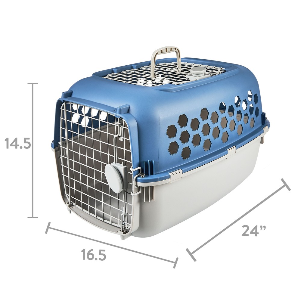 The Multi-Colored 24-inch Plastic Pet Kennel gives your pet comfort and security. This versatile kennel offers both a front load entrance and a top door entrance for convenient loading and unloading of your dog or cat. This kennel is made from durable heavy-duty plastic and steel wire. Our kennel is perfect for traveling, vet appointments, or house training your new pet. The ventilated features allow for a steady fresh air flow to keep your pet safe, as well as allowing visibility to your pet while in the kennel. The 24-inch carrier is perfect for one or multiple pets up to 20 pounds. The top and bottom easily nest together for convenient storage when not in use. Help your pets live the ! Our products are specially crafted with one goal: seeing your pet at its very best. With various offerings designed to keep animals healthy, happy, and energized, stands out as the brand that truly puts your pet first. Double Door Dog and Cat Kennel with Top Opening, Multicolor, 24 in Features a neutral blue top with a gray top handle and additional opening, gray lower section, and steel wire This kennel is sturdy and durable and made for pets up to 20 lbs Features a two-door entry, with an extra door on top for the extra convenience of loading and unloading your pet The veterinarian recommended top load door is the perfect feature for easily loading and unloading your cat in and out of the kennel Made from durable heavy-duty plastic and steel wire Easy clean up with mild soap and water for everyday use Features side ventilation for fresh air flow as well as visibility for you and your pet The sturdy door has a single-motion door lock – it stays securely shut but opens easily for you Easy walk-in and out-front carrier door makes it easy to use as an indoor home and allows your pet to become acclimated to the carrier before traveling The multi-color double-door is the perfect travel sanctuary for your pet