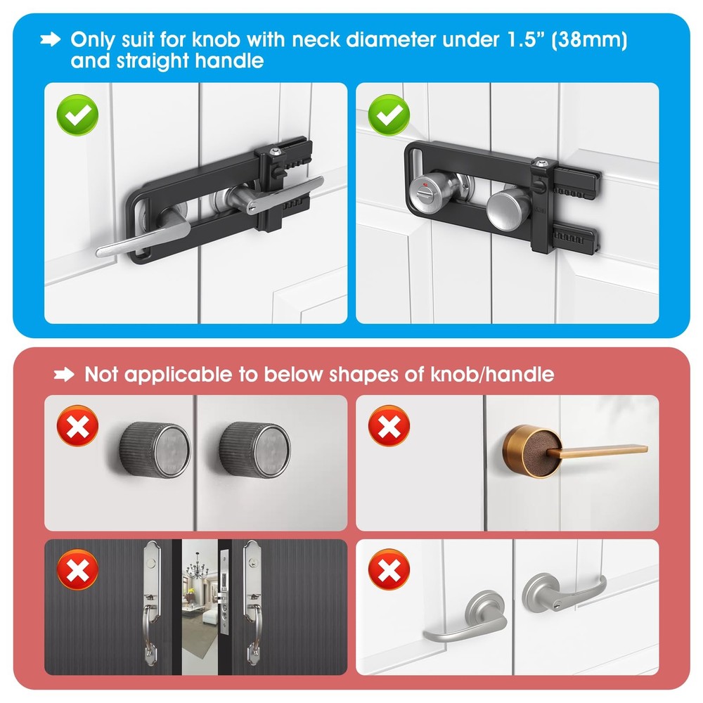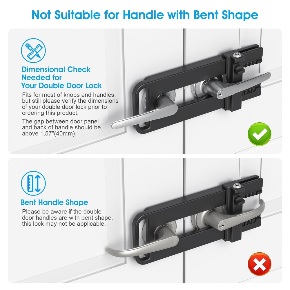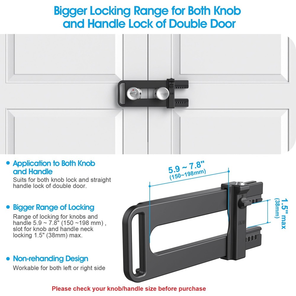 This double door security device is with cylinder and 3 keys for both indoor and outdoor use, it is dedicated for french door hardware for double doors. By made of diecasted metal, it provides extra security for your interior or exterior doors including bifold and closet doors. Cylinder and 3 keys are included for considerate baby proof, child proof, kid proof, dementia patient proof, burglar proof, toddler proof and pet proof when it is used for interior doors except the function of home safety as reinforcement lock and door barricader. For outdoor use, it is an additional security along with your normal knob set and handle set for your home safety and loved ones. Because of the good design, this double door latch lock is also applicable for D handle locking like a guard door lock. Please verify the application dimensions before ordering. Please also be aware this is a portable door lock and no drilling door lock for home safety, it is more suitable for home use instead of travel use. [Sturdy and Durable Double Door Lock]: This double door lockout device is made of diecasted solid aluminum alloy with unibody design, it is a high quality solution as double door lock with key and french door lock, 3 keys are included for internal use or external use. It provides extra security as door barricade or double door security device. [Suits for Knobset and Handle set]: This dementia door lock for double door and french door as double baby proof double door handle lock, is designed with bigger range of adjustment, it suits most of knobset and some handleset with tighter locking, locking status indications are presented clearly. It can be used as a portable door lock, removeable door lock and no drilling lock without any installtion. [Perfort for Indoor Use and Also Workable for Outdoor use]: The double door lock for kids safety can be a perfect solution of extra lock for door from inside, because of the cylinder and keys, it can provide additional security for burglar proof door lock (remark: it can not replace the normal handleset or knobset from safety point of view). It is like a smaller but strong double door barricade security bar. [Bigger Range of Locking Adjustment]: Please verify the dimension before placing order. Thought the lock has big range of adjustment to suit most double door lock set, still please check your french door lock, bifold door lock, closet locks for double doors and double door locks for front door or double door lock for interior french doors. Please check the dimensions before purchasing to prevent potential issue on application. [Quality Service]: Worry-free return policy (30 days) and 24/7 email support, welcome to contact us for any problem during lifetime of this double door barricader and kid proof double door lock.