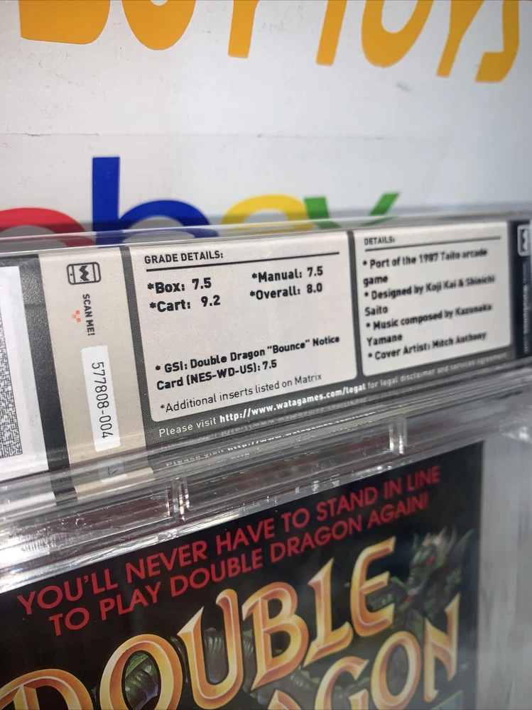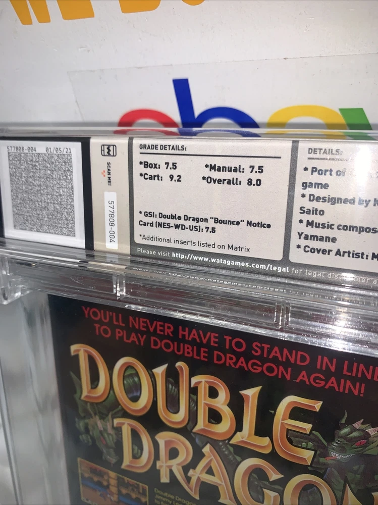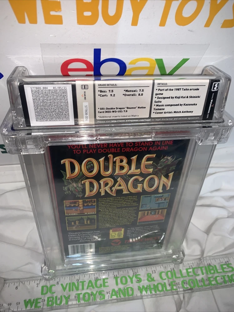 Double Dragon Arcade Smash Hit Nintendo WATA 6.5 Complete In Box Cart 8.0 🔥. Grade Details are as follows Box-7.5 Cart-9.2 Manual-7.5 Please carefully examine all pictures and ask questions before you purchase. Wata case is in very nice condition. If you find the time please view my other items. Thanks for looking,Dennis