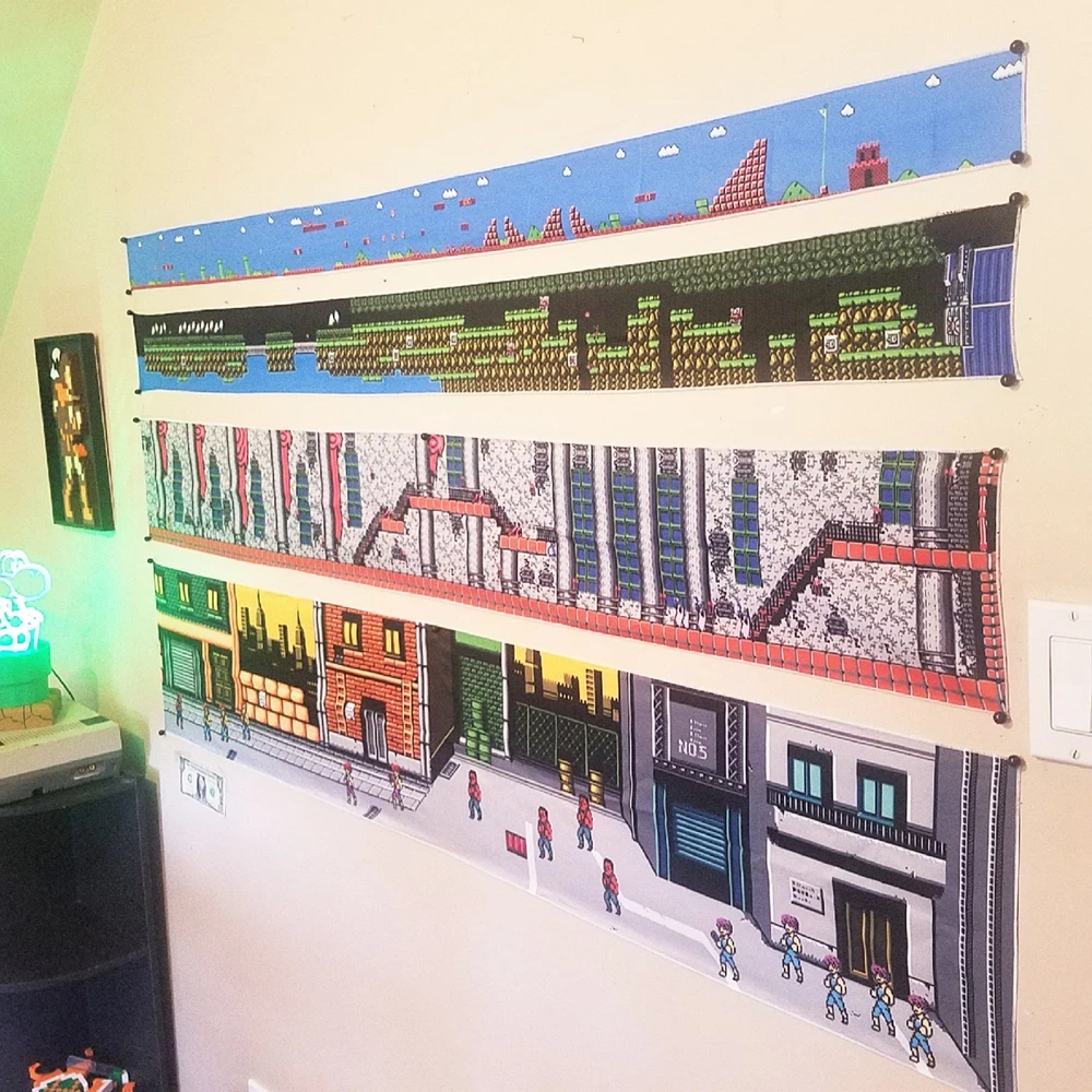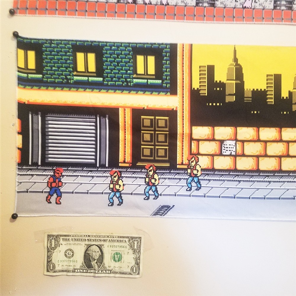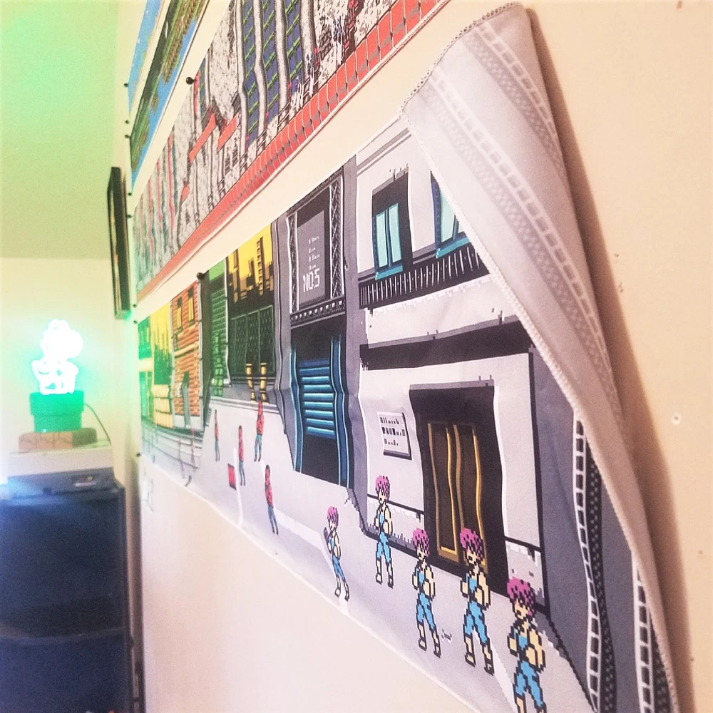 Stage 1 of Double Dragon for the Nintendo. Billy at the beginning of the stage and all the thugs and thugettes waiting for him π Pow! π₯ Tapestry measures approximately 60x12 inches. Printed with vibrant ink on quality medium-weight 100% polyester tapestry, easily hung to your wall with a few thumbtacks. Each tapestry is new and comes folded in a cellophane sleeve. Check out my other listings to see more custom video game banners and neat game room merch. Combined shipping available. πππ